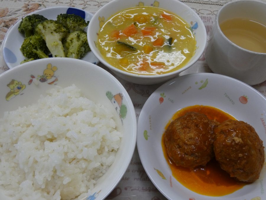 今日のメニューは「ご飯、煮込みハンバーグ、ブロッコリーのソテー、かぼちゃののクリームシュチュー」でした。