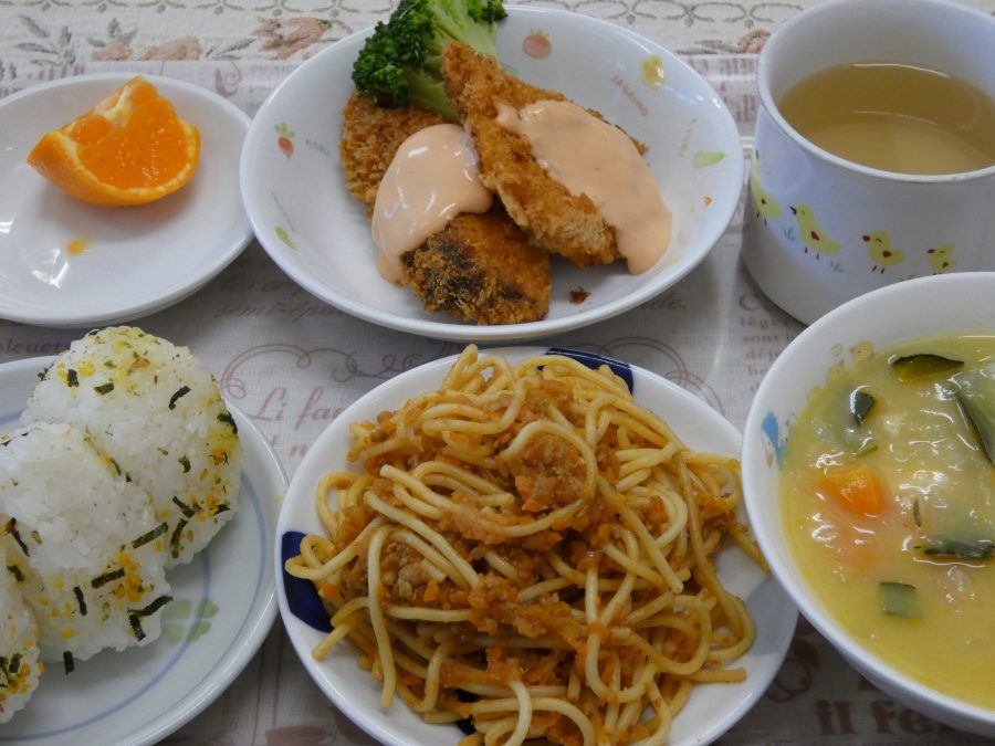 今日のメニューは「おにぎり、白身魚のフライのオーロラソースがけ、かぼちゃのシチュー、ミートスパゲティー、フルーツ」でした。