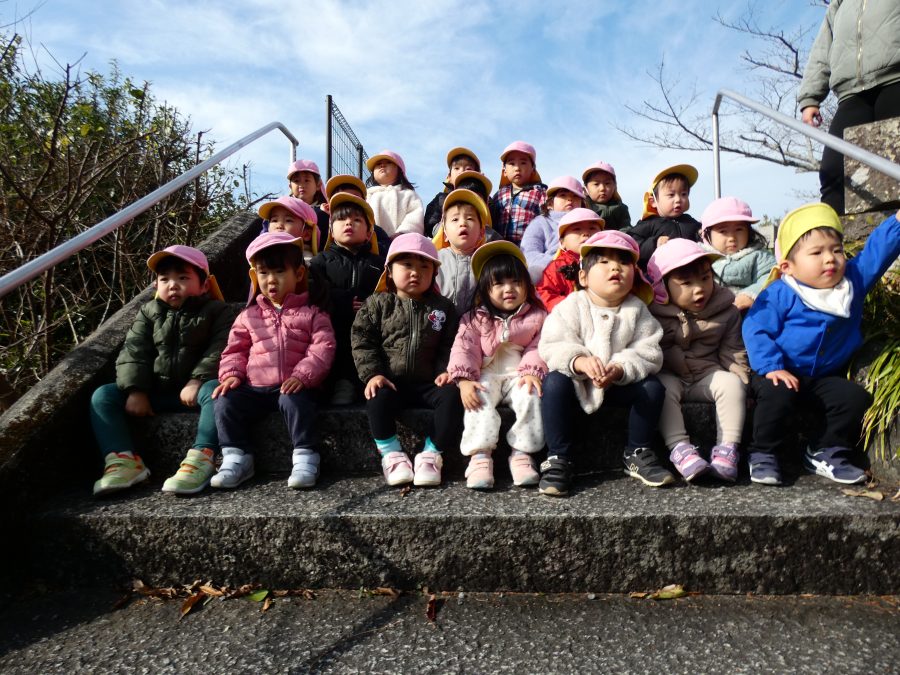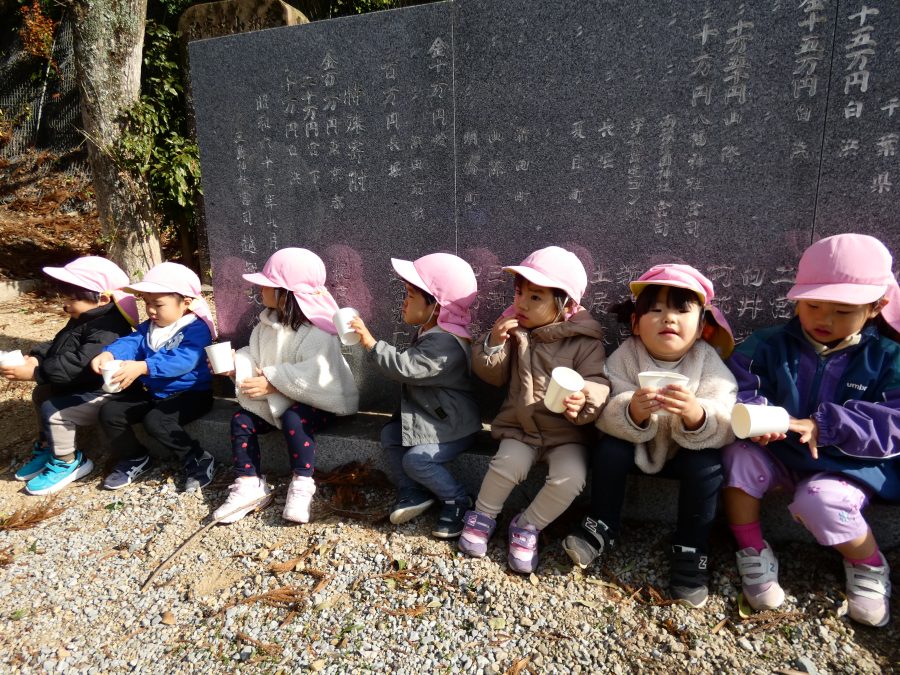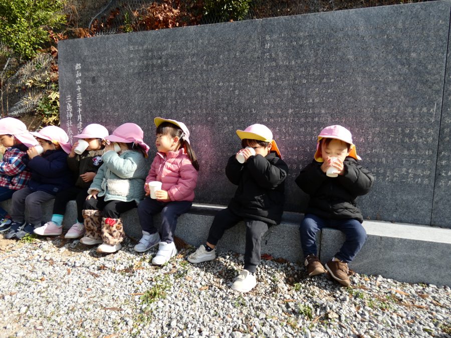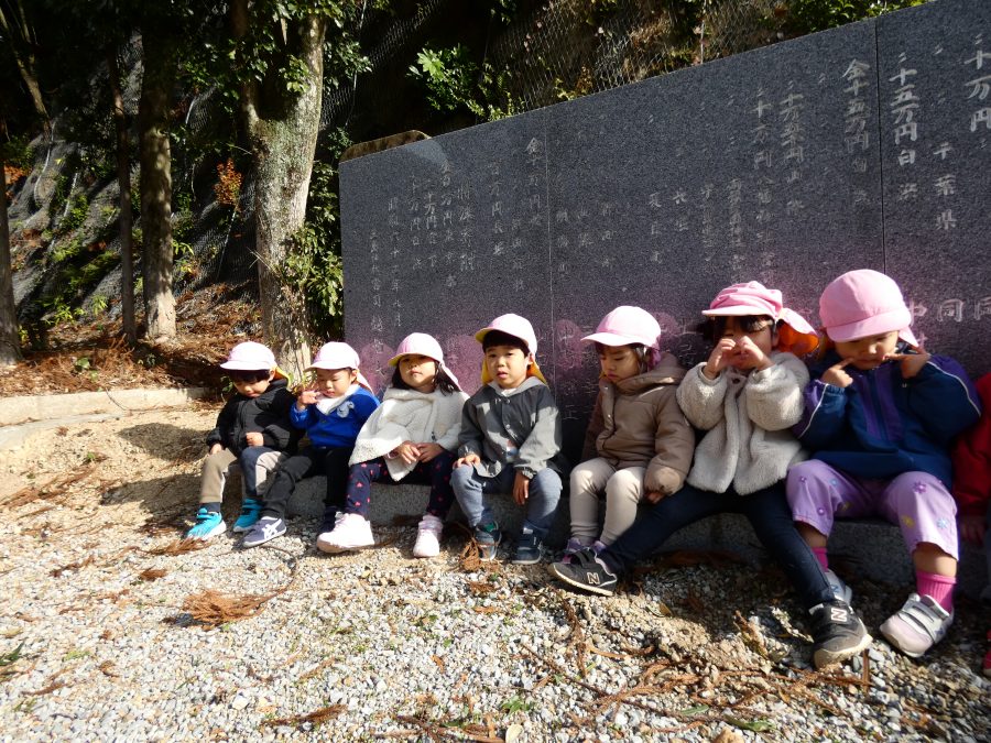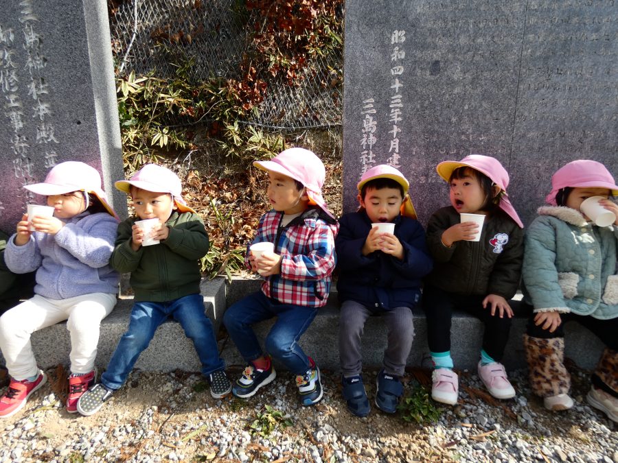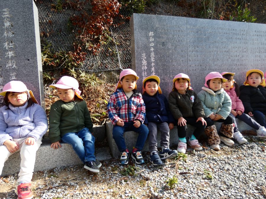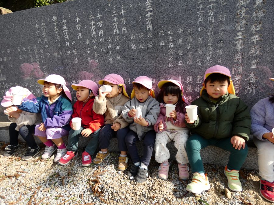 桃2組さんが三島神社へお散歩にいきました。お友だちと手をつないで歩くのもとても上手になりました。汗ばむほどの冬晴れで、三島様に着いたところで水分補給。帰りには、どんぐり拾いも楽しみました。