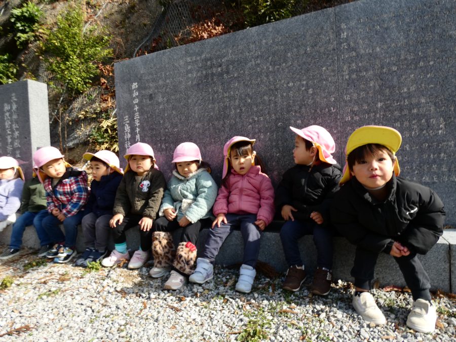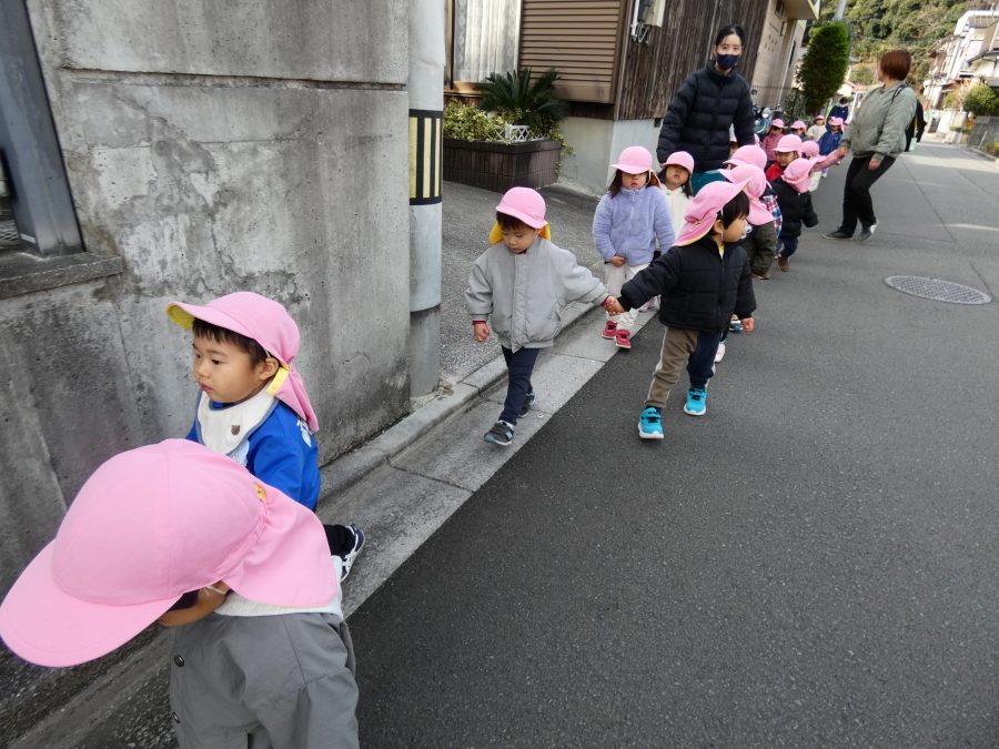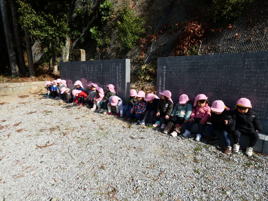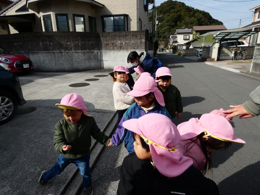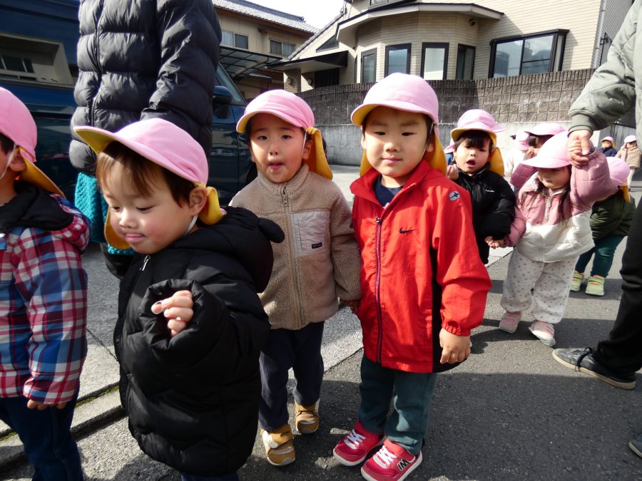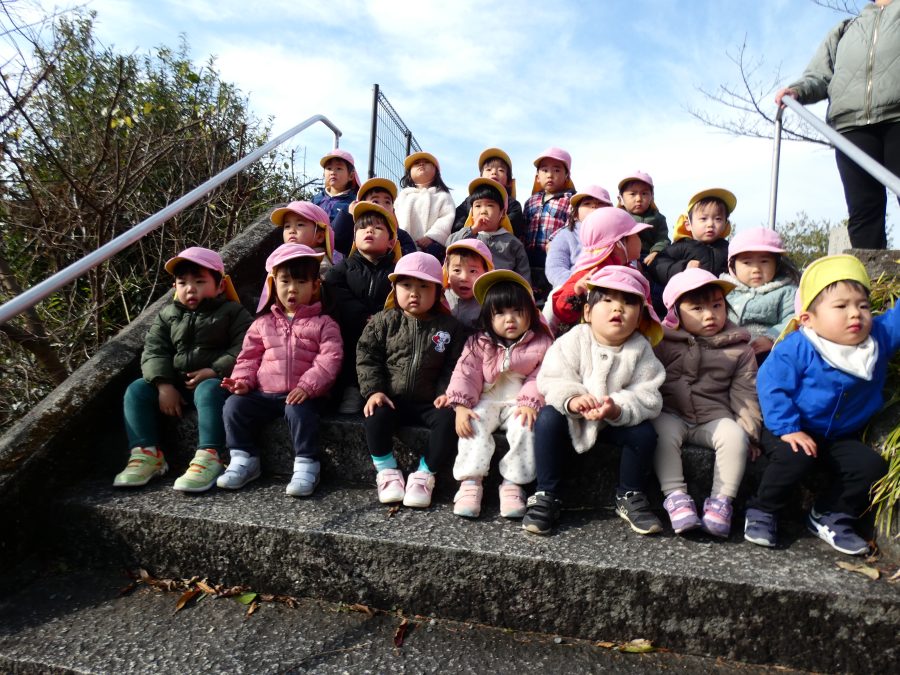 桃2組さんが三島神社へお散歩にいきました。お友だちと手をつないで歩くのもとても上手になりました。汗ばむほどの冬晴れで、三島様に着いたところで水分補給。帰りには、どんぐり拾いも楽しみました。