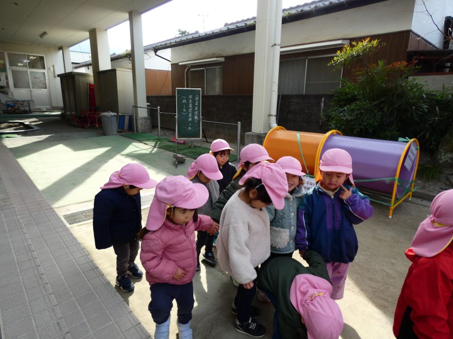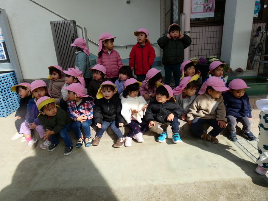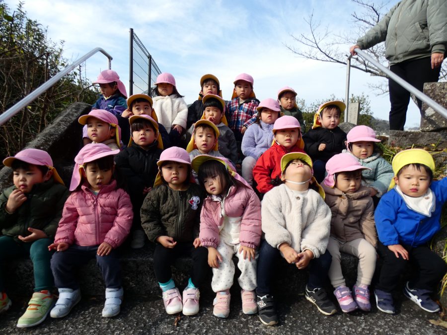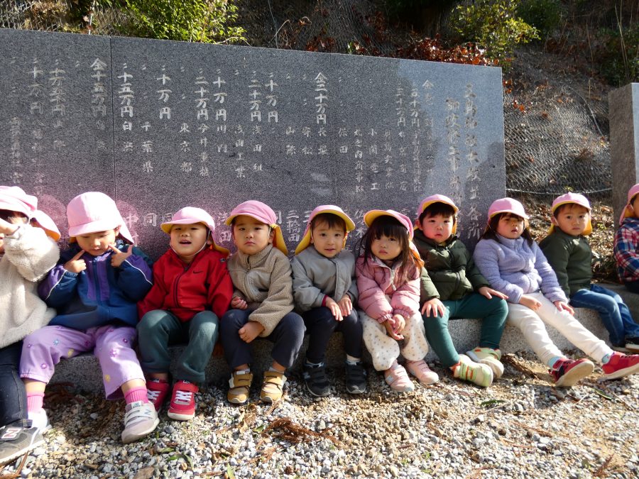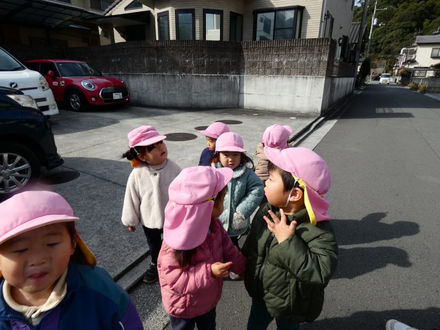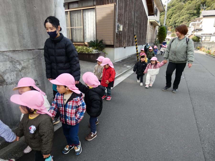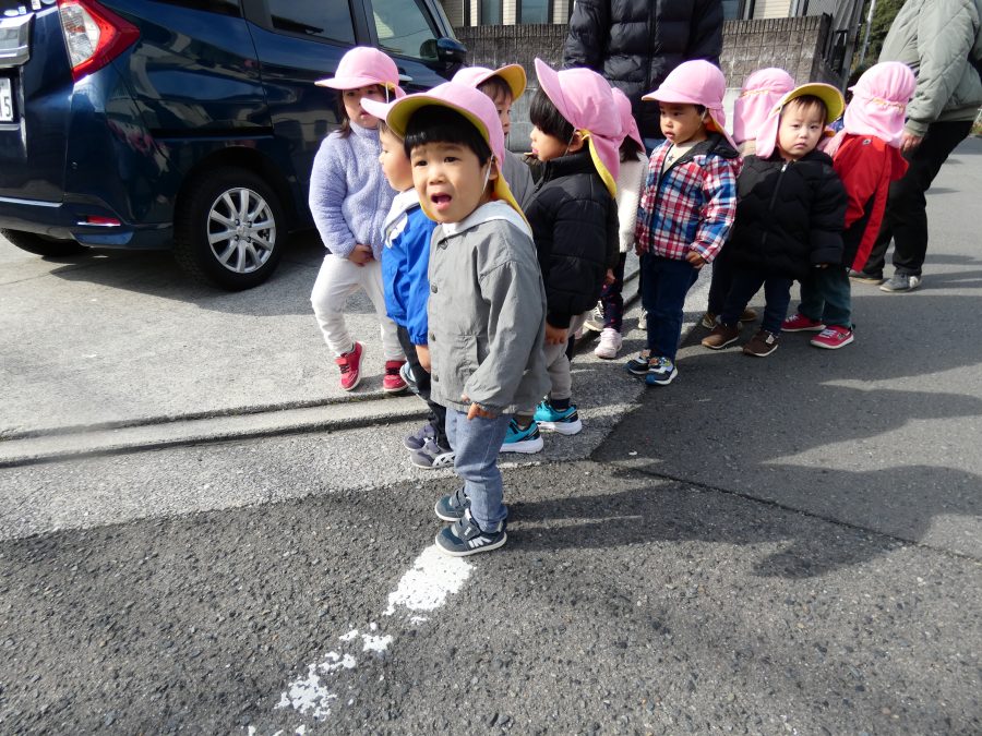 桃2組さんが三島神社へお散歩にいきました。お友だちと手をつないで歩くのもとても上手になりました。汗ばむほどの冬晴れで、三島様に着いたところで水分補給。帰りには、どんぐり拾いも楽しみました。