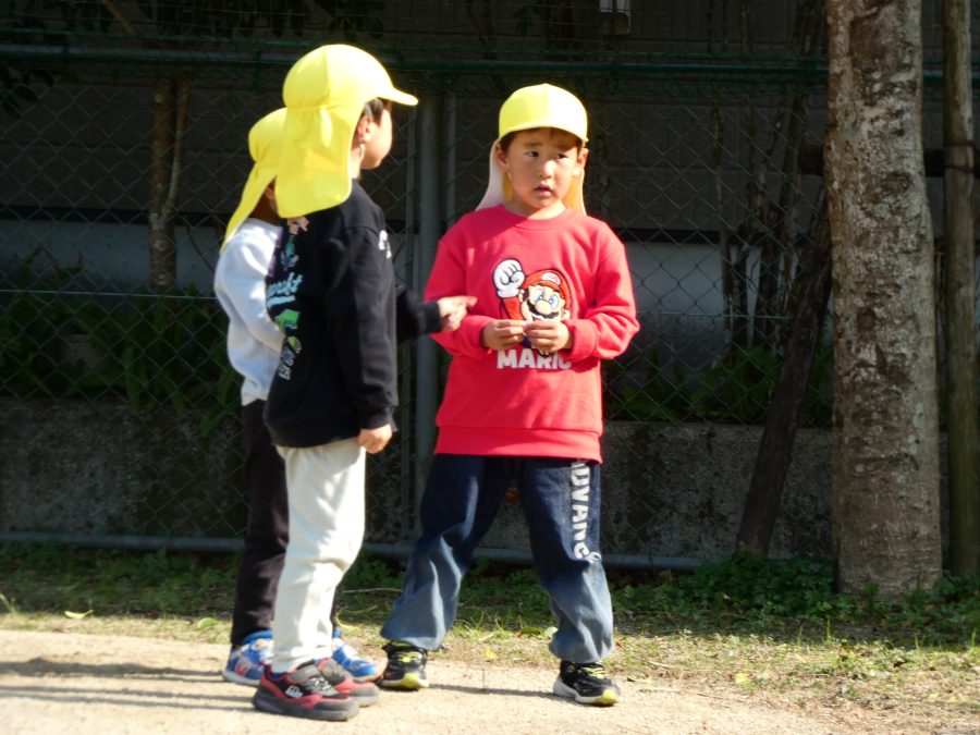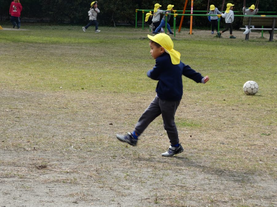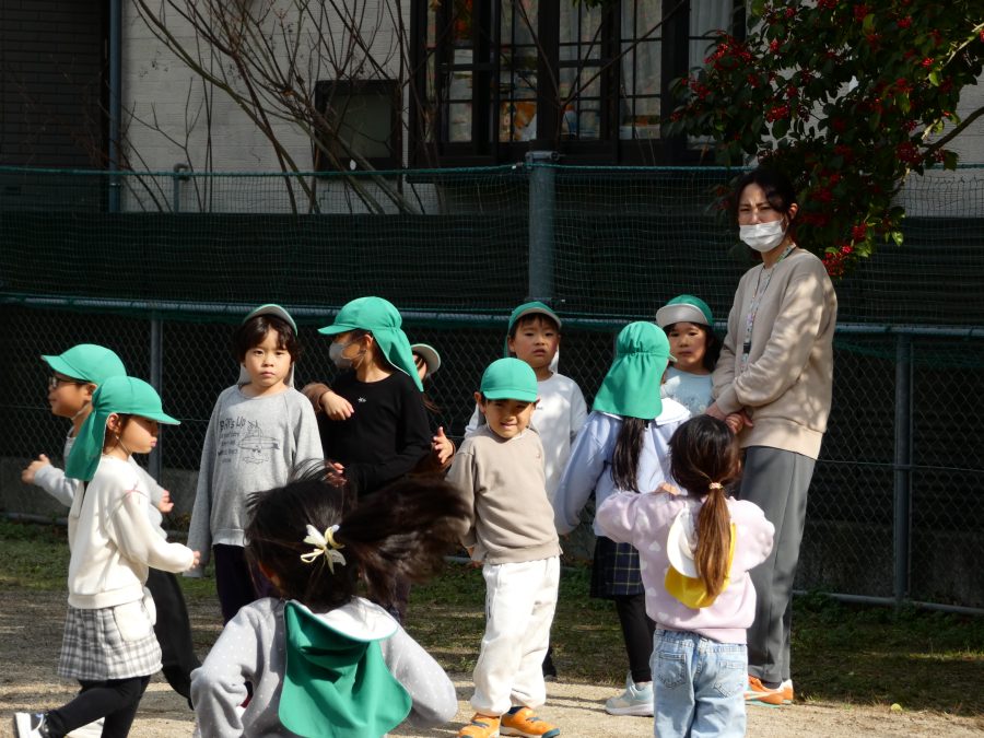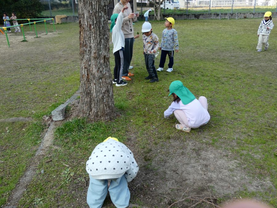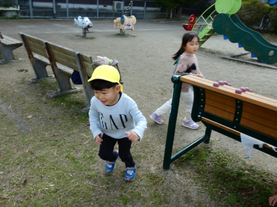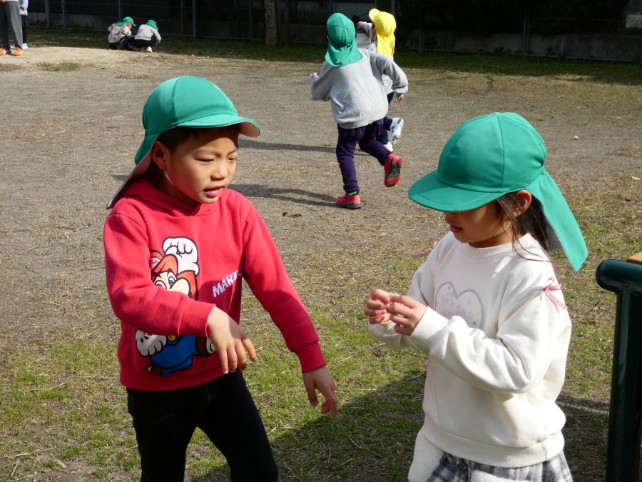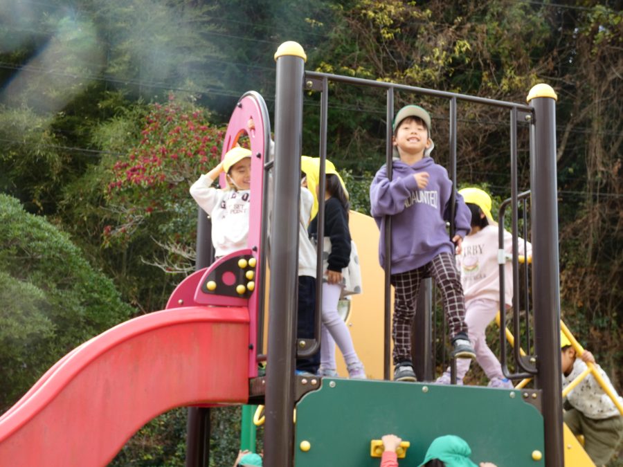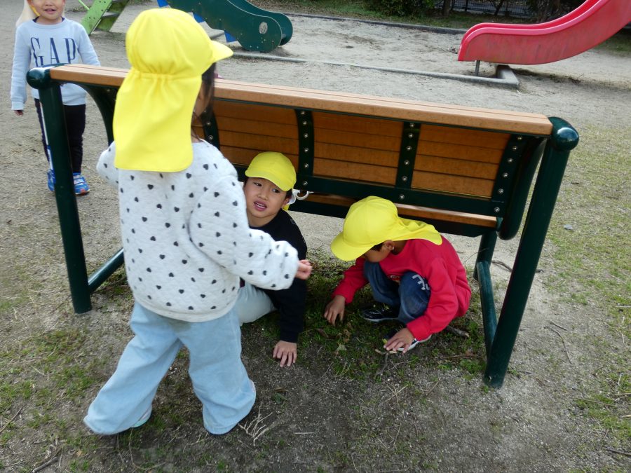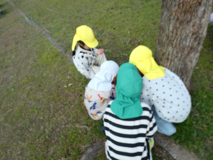黄組さん、緑組さんが一緒になかよし公園に行って遊びました。行き帰りは、仲良く手をつないで歩きました。公園では、一緒にサッカーや虫探しを楽しんでいました。