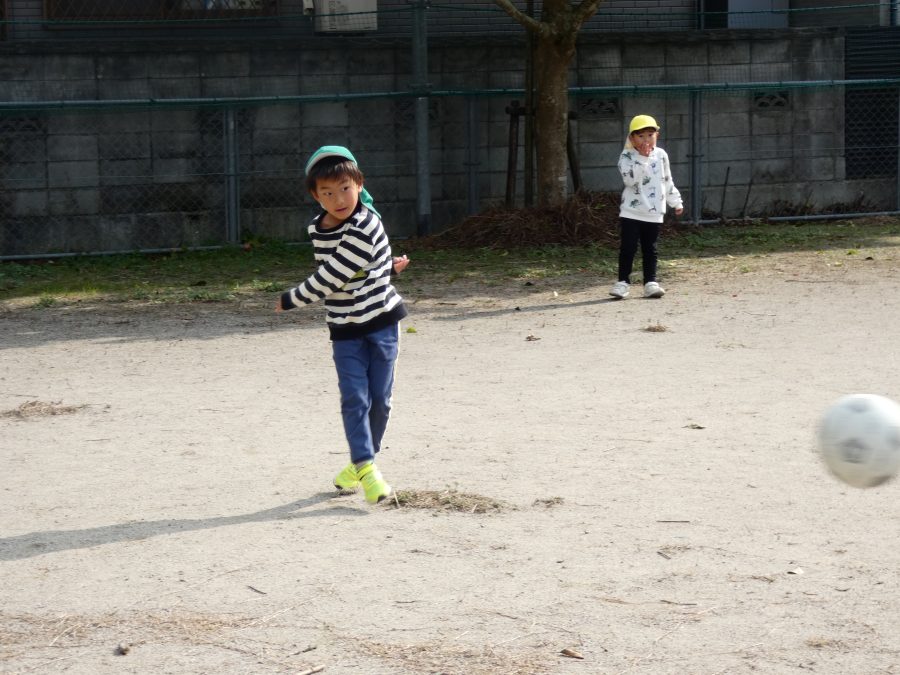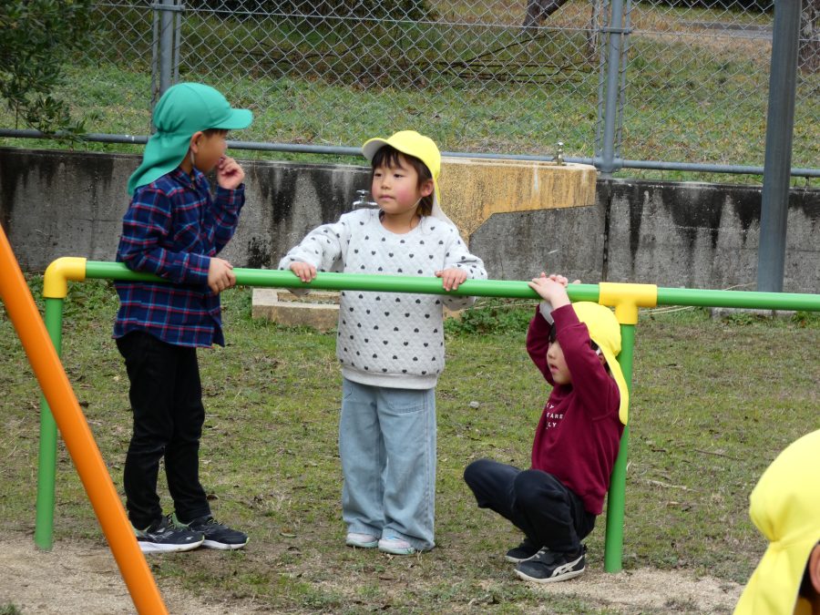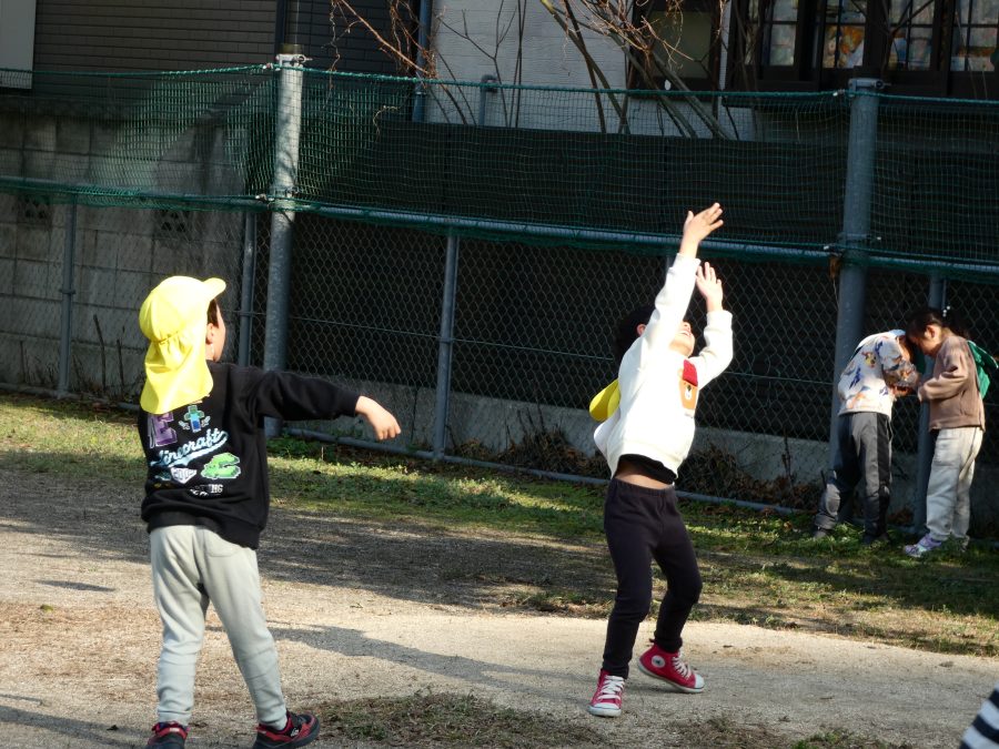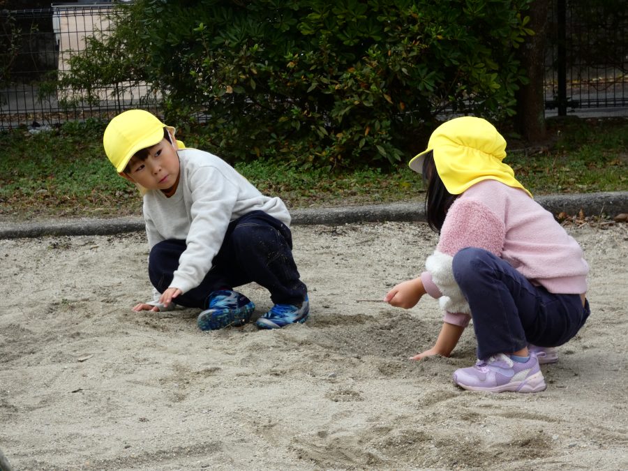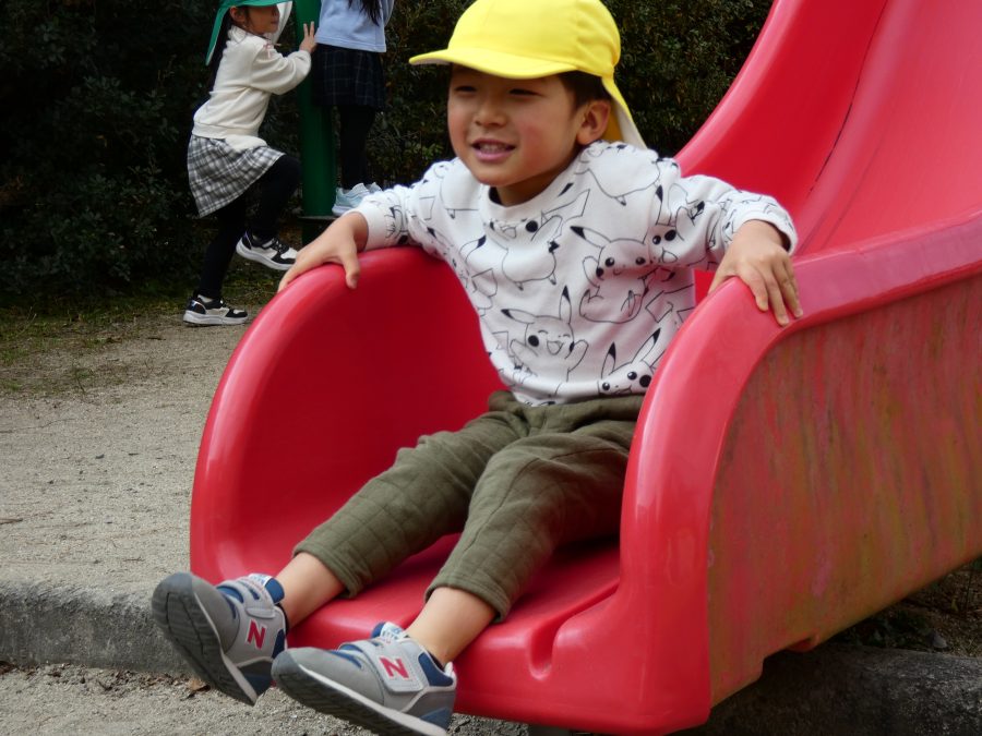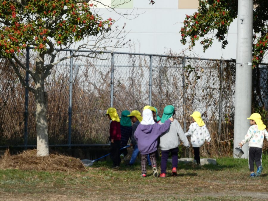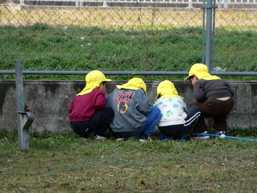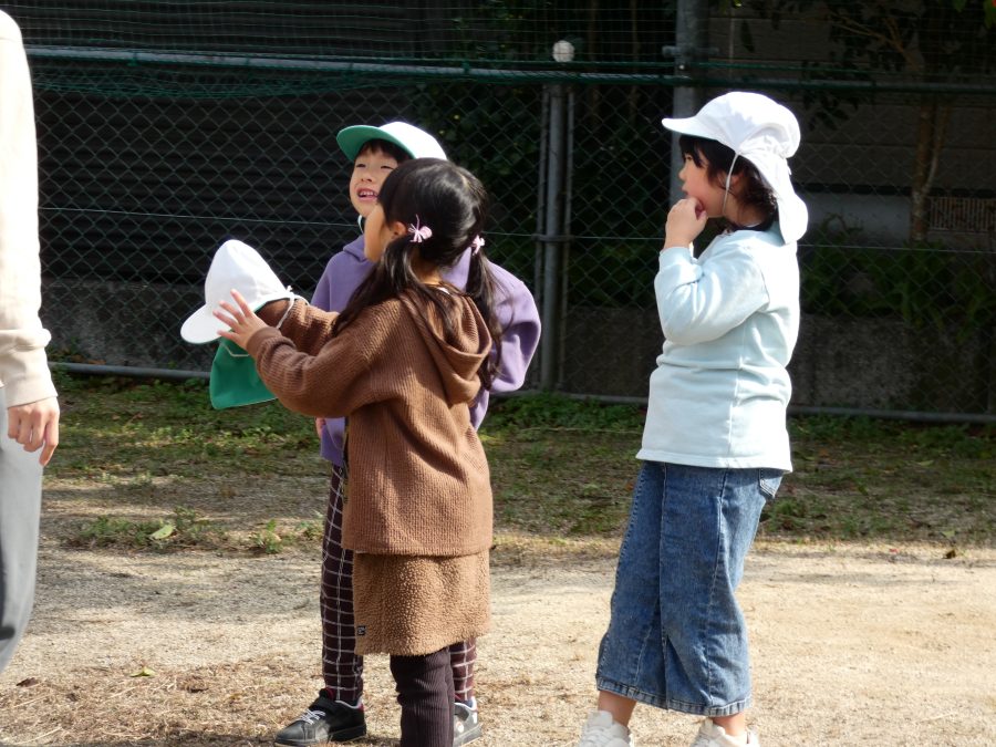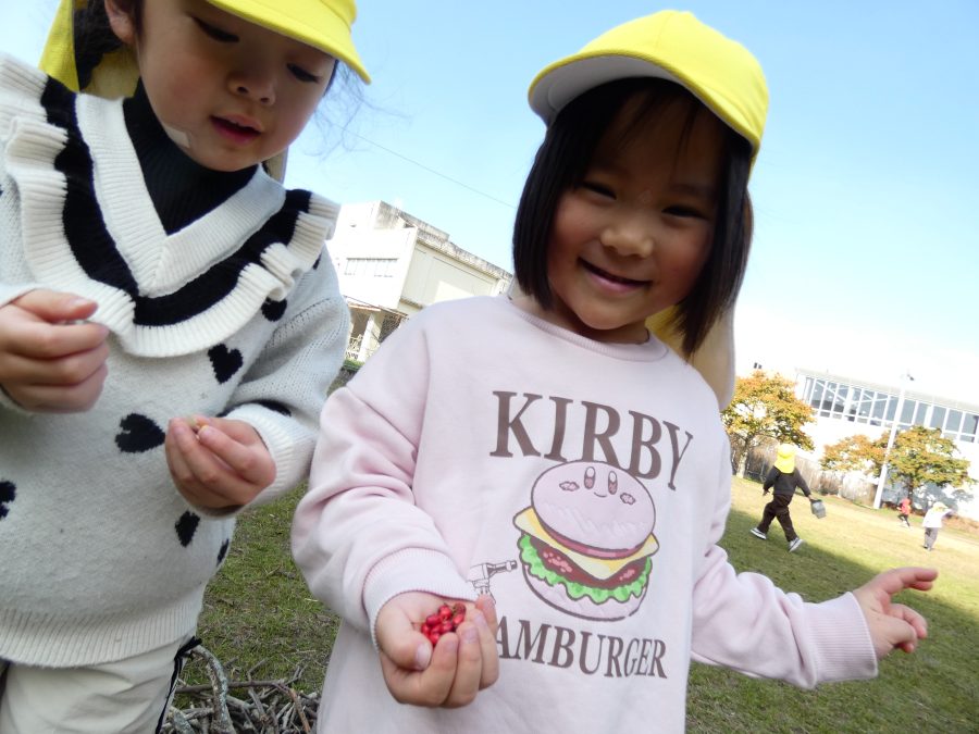 黄組さん、緑組さんが一緒になかよし公園に行って遊びました。行き帰りは、仲良く手をつないで歩きました。公園では、一緒にサッカーや虫探しを楽しんでいました。
