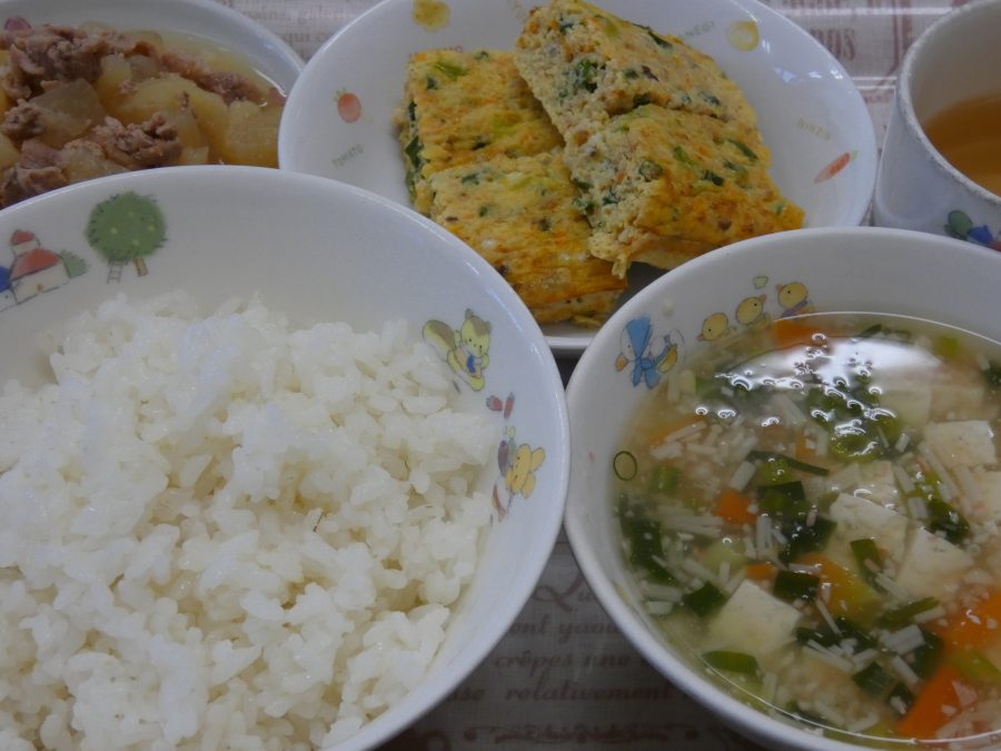 今日のメニューは「ご飯、親子焼き、大根と豚肉の煮物、かに豆腐汁」でした。