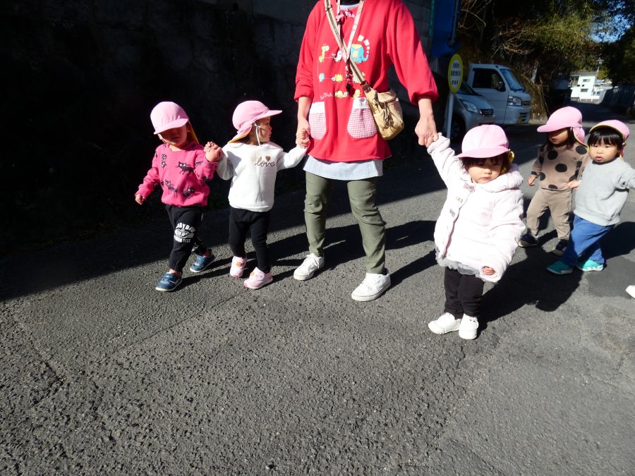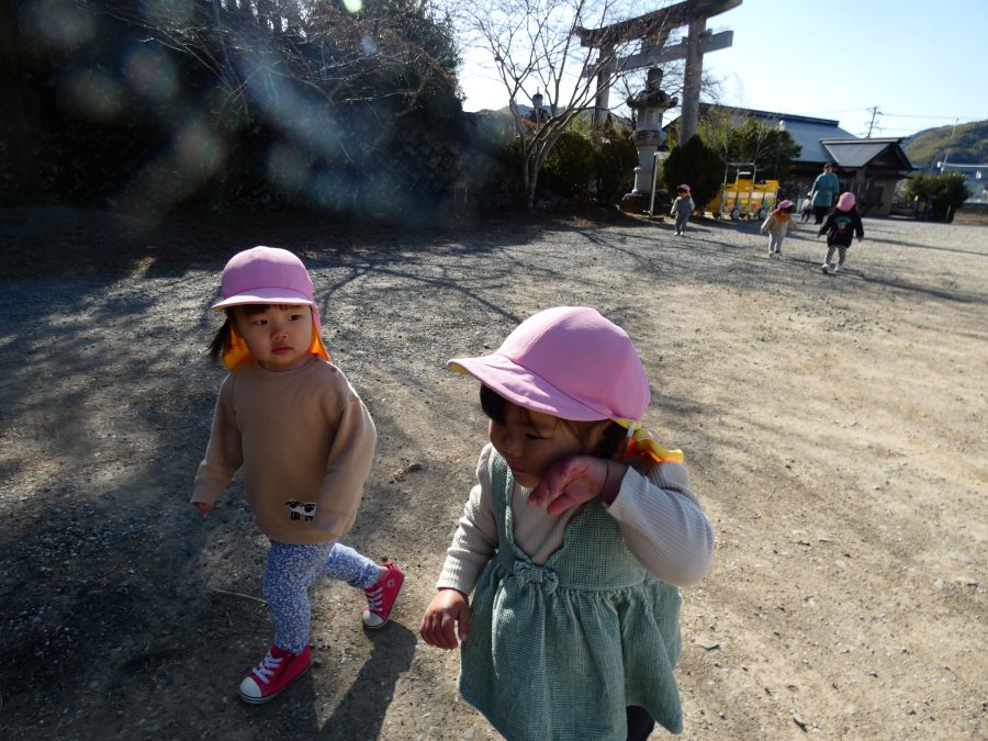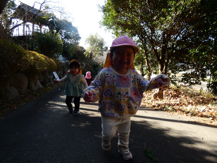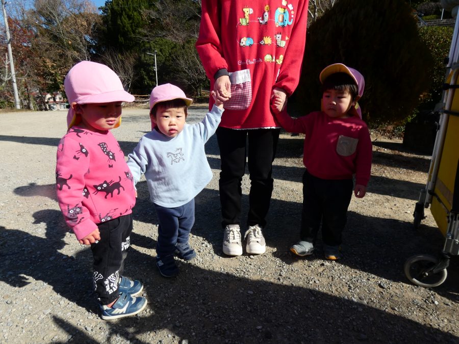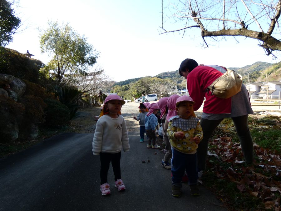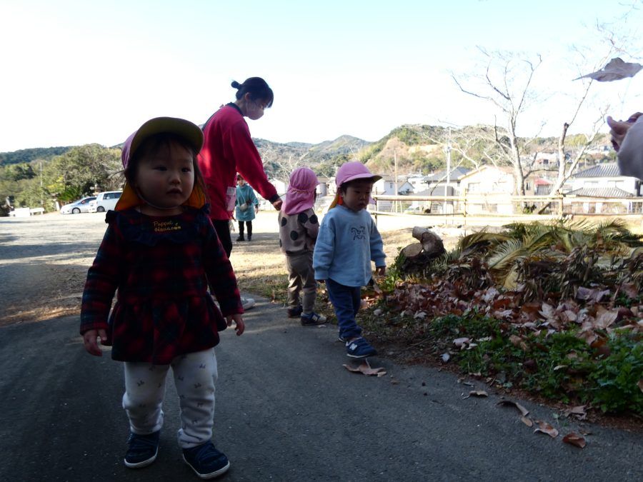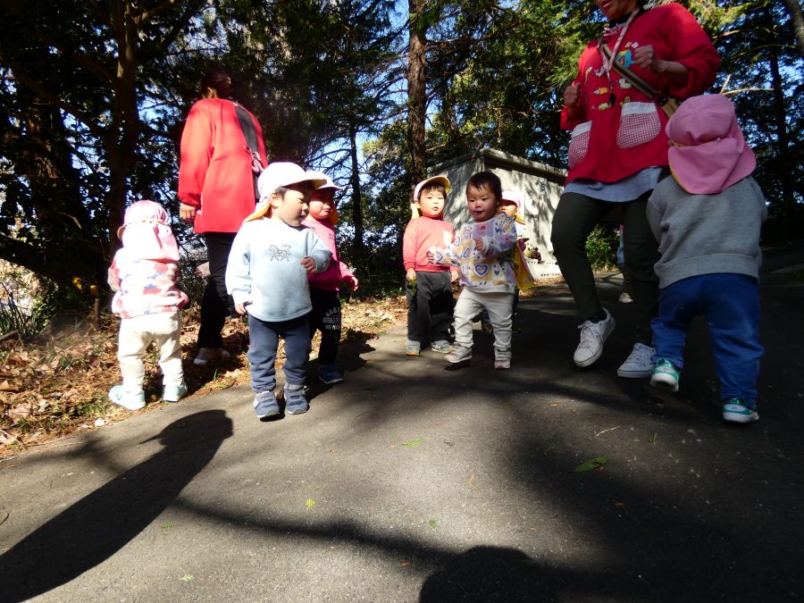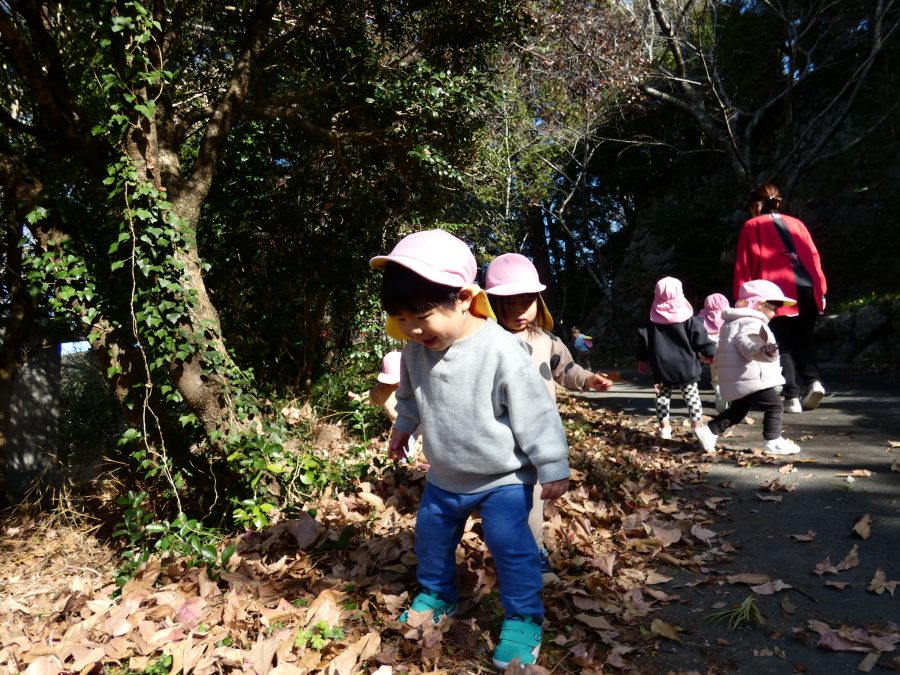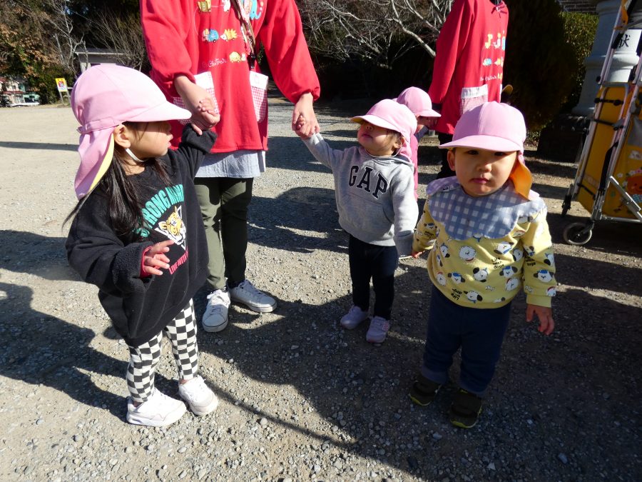 今日は雲ひとつないお天気でした。まだ寒気はあるものの、日差しを浴びると温かく感じながら、三島神社へ行きました。保育士さんと手をつないで歩いたり、お散歩カーに乗ったりして行きました。三島様では、落ち葉遊びを楽しみました。また、途中、保手川で鳥を見つけて嬉しそうでした。