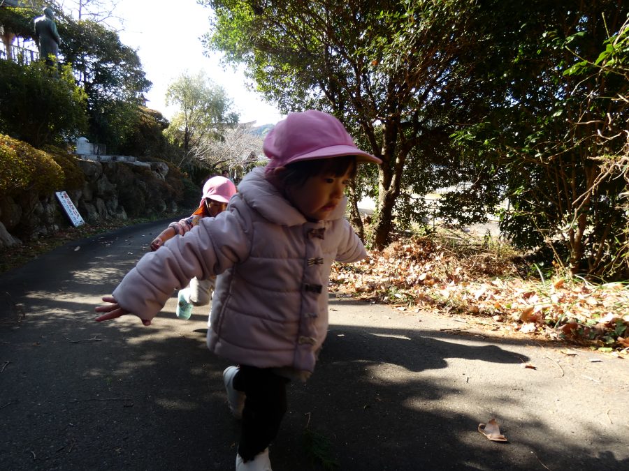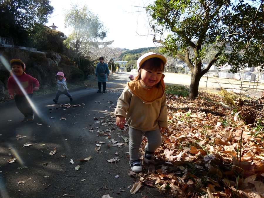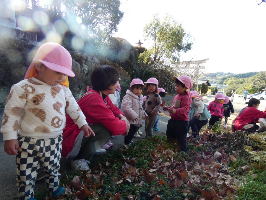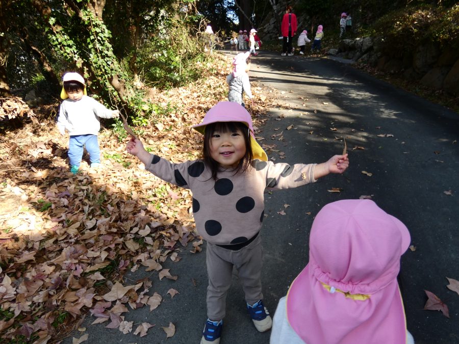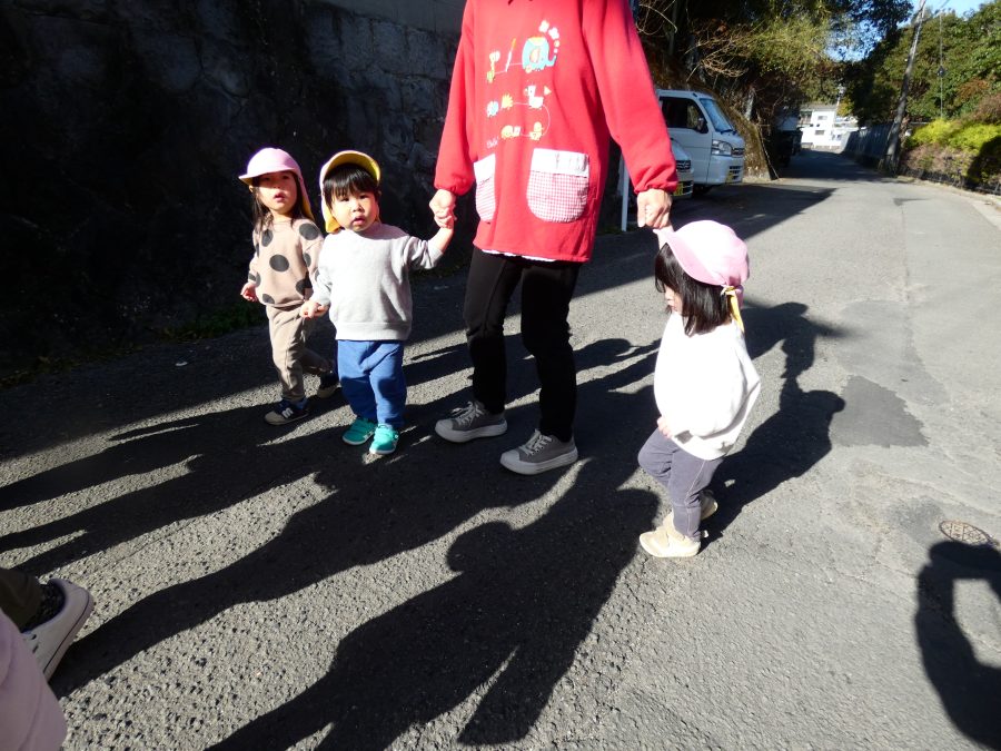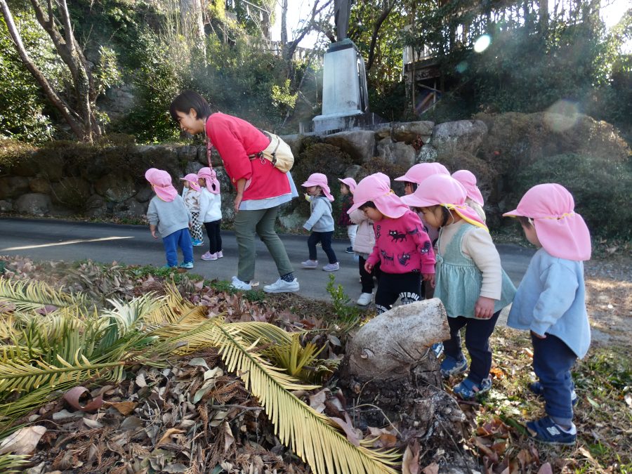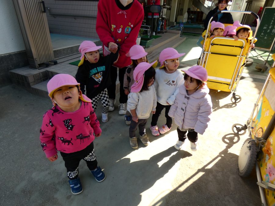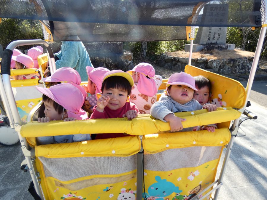 今日は雲ひとつないお天気でした。まだ寒気はあるものの、日差しを浴びると温かく感じながら、三島神社へ行きました。保育士さんと手をつないで歩いたり、お散歩カーに乗ったりして行きました。三島様では、落ち葉遊びを楽しみました。また、途中、保手川で鳥を見つけて嬉しそうでした。
