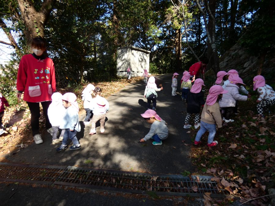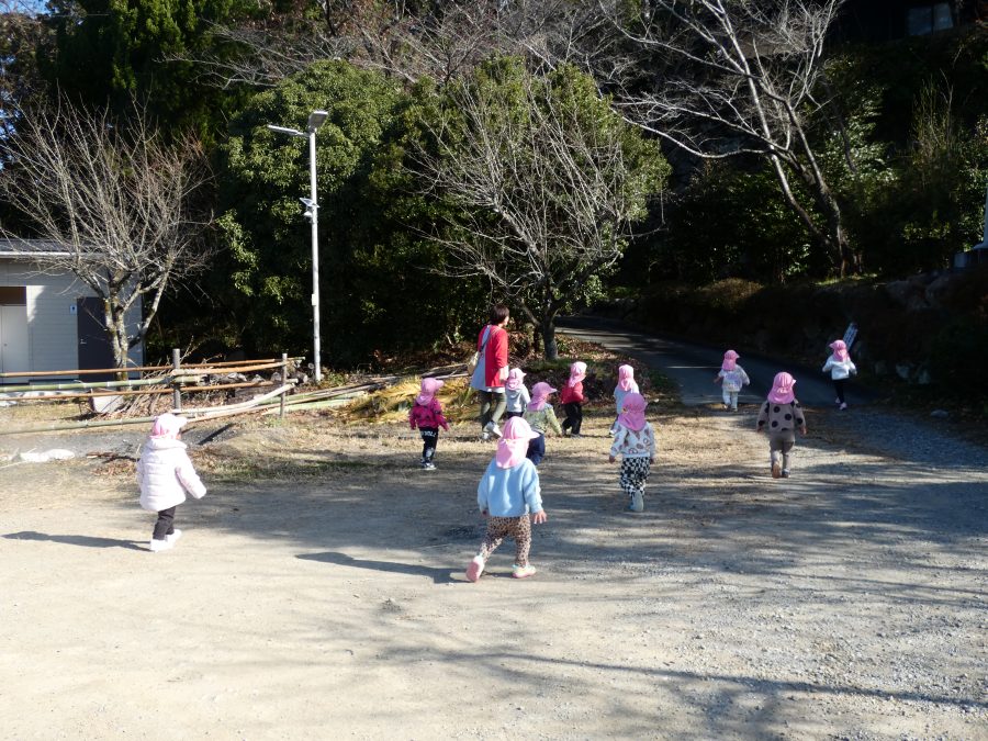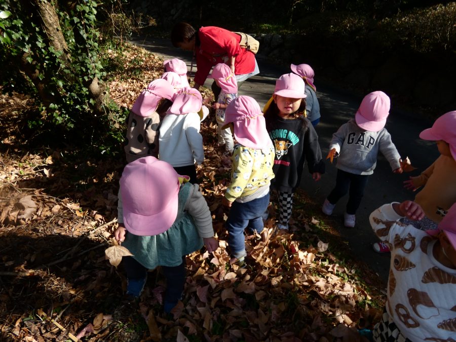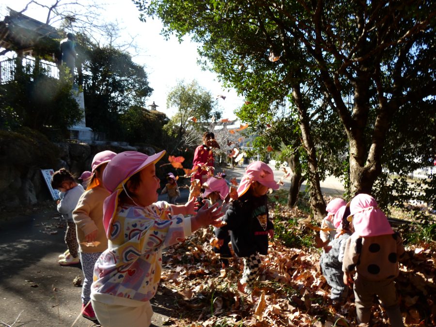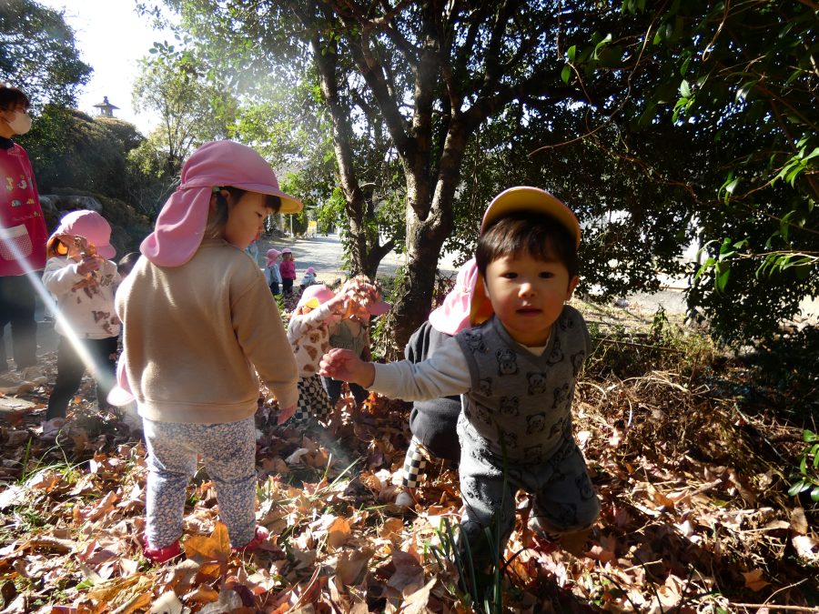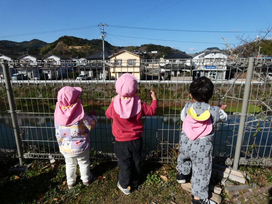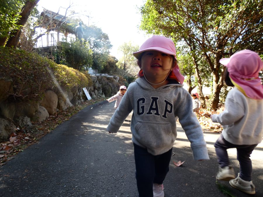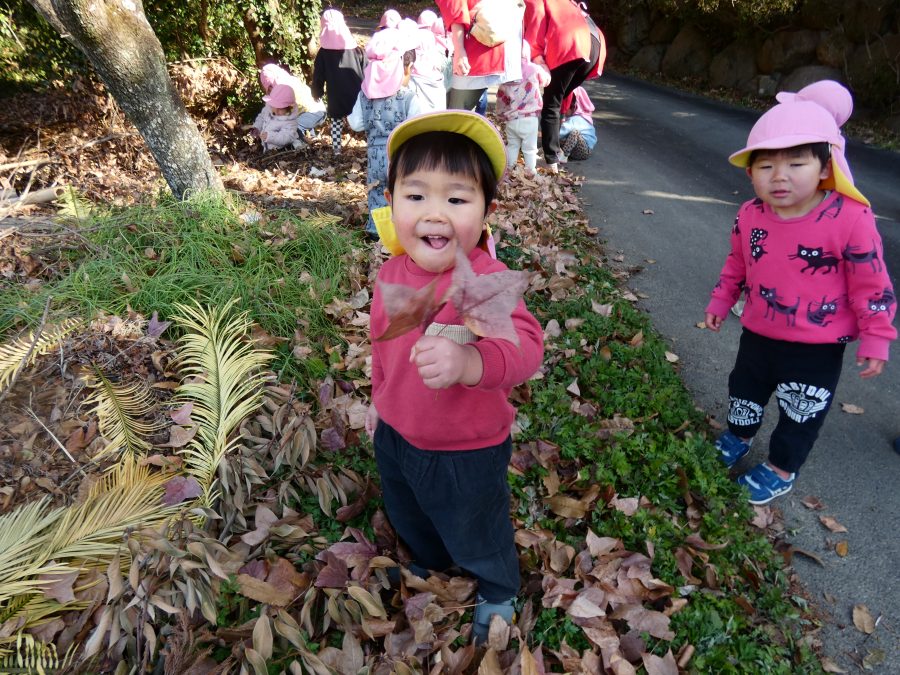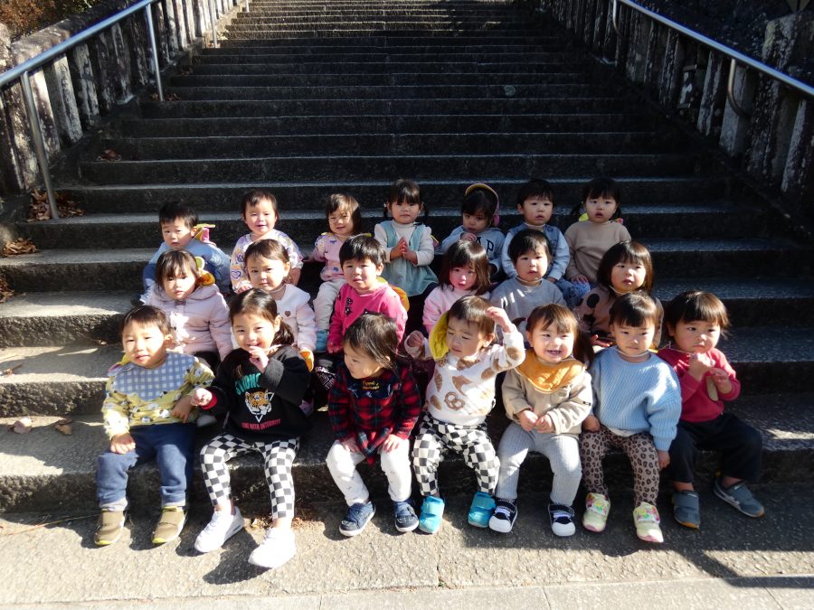 今日は雲ひとつないお天気でした。まだ寒気はあるものの、日差しを浴びると温かく感じながら、三島神社へ行きました。保育士さんと手をつないで歩いたり、お散歩カーに乗ったりして行きました。三島様では、落ち葉遊びを楽しみました。また、途中、保手川で鳥を見つけて嬉しそうでした。
