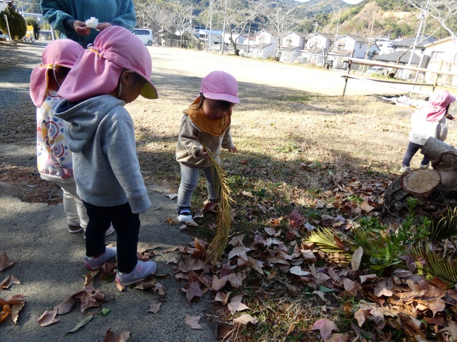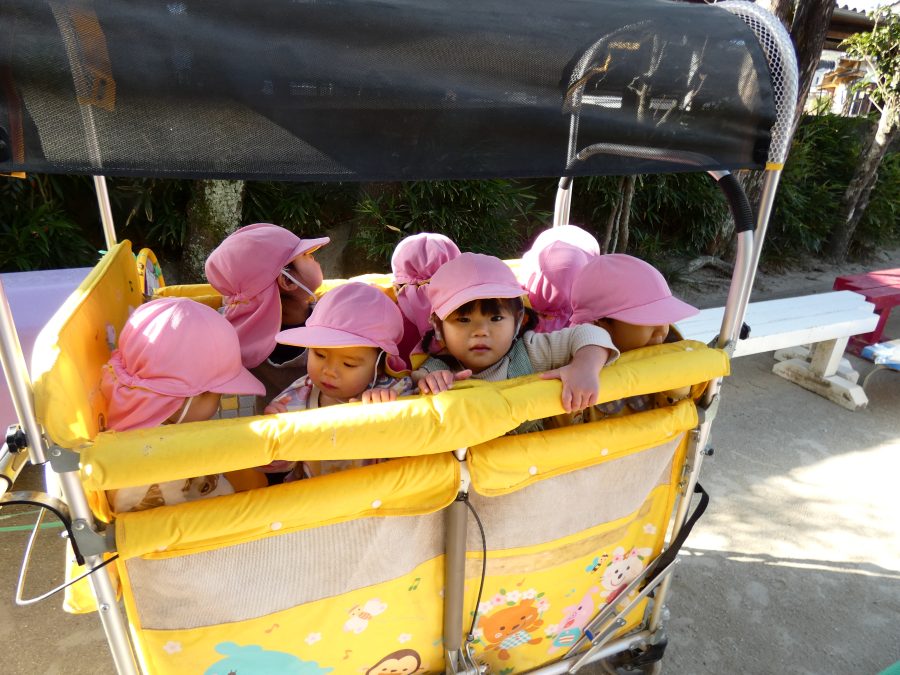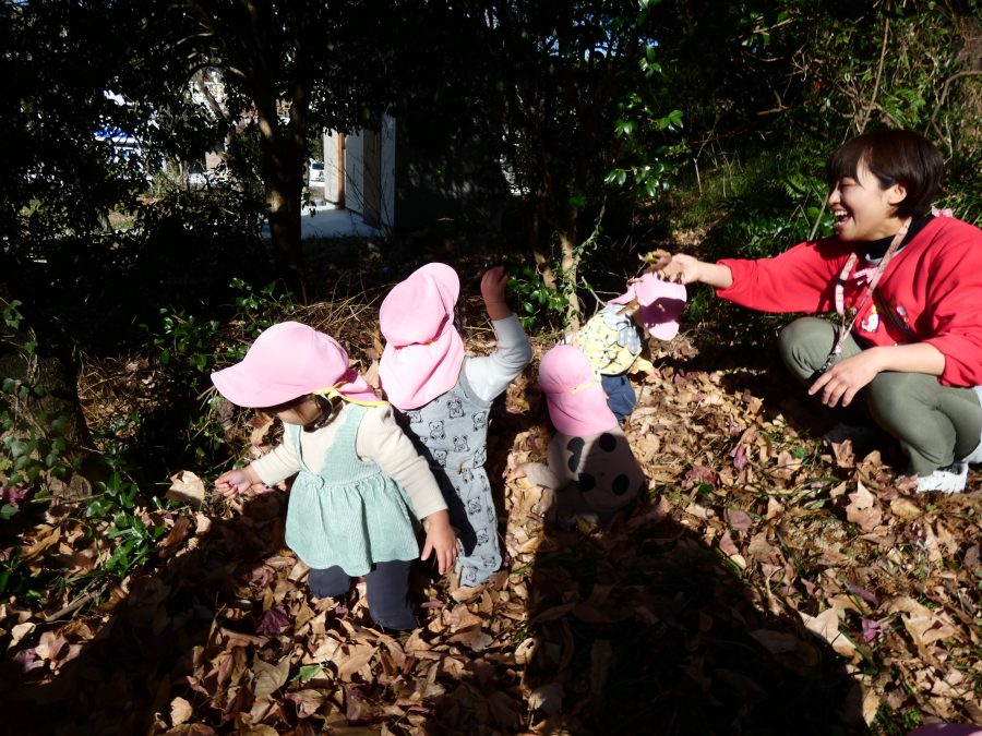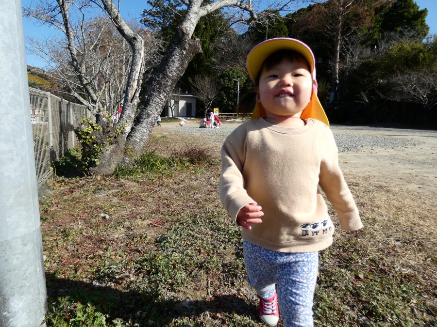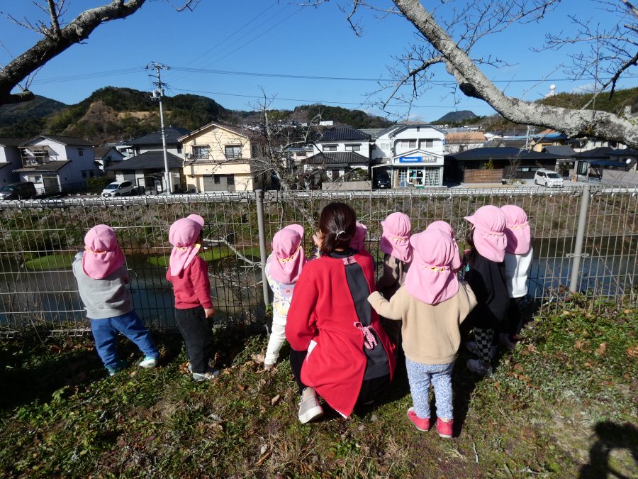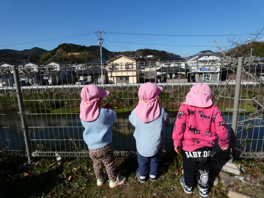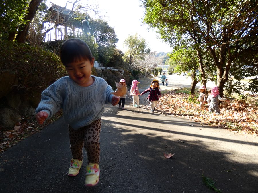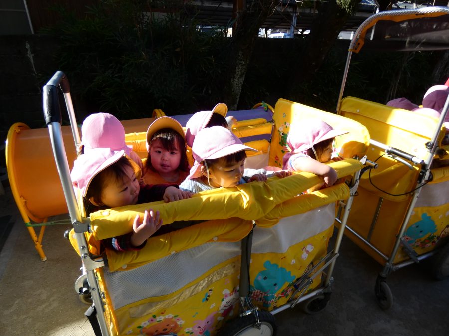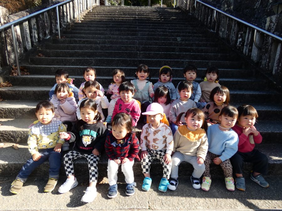 今日は雲ひとつないお天気でした。まだ寒気はあるものの、日差しを浴びると温かく感じながら、三島神社へ行きました。保育士さんと手をつないで歩いたり、お散歩カーに乗ったりして行きました。三島様では、落ち葉遊びを楽しみました。また、途中、保手川で鳥を見つけて嬉しそうでした。