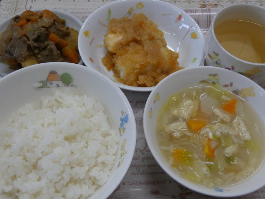今日のメニューは「ご飯、真鯛のおろし煮、肉じゃが・カレー味、すまし汁(白菜、人参)」でした。