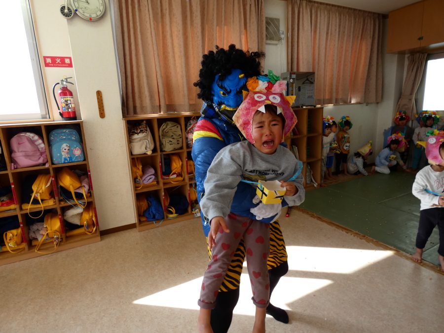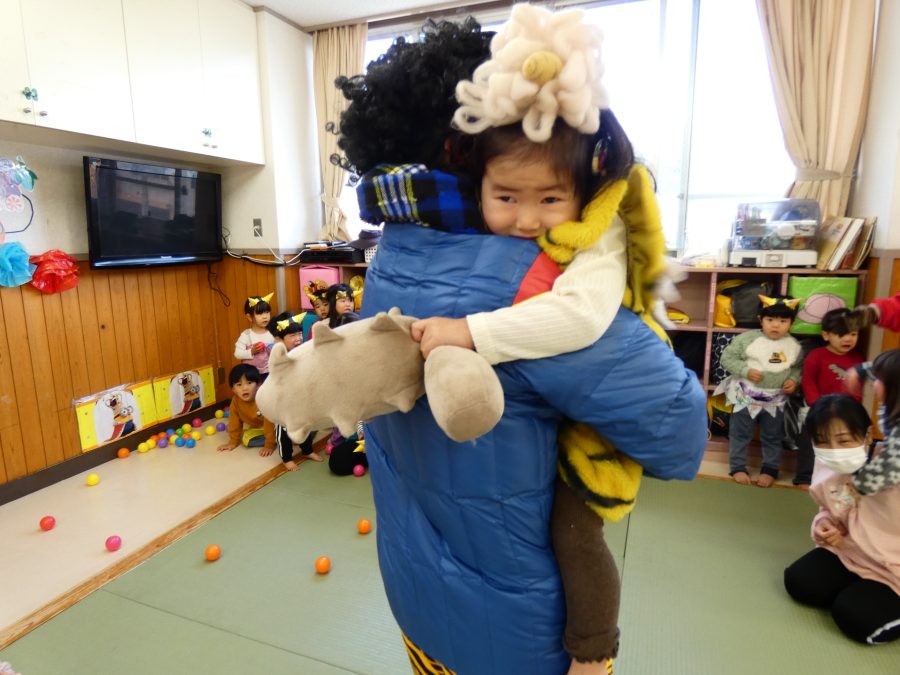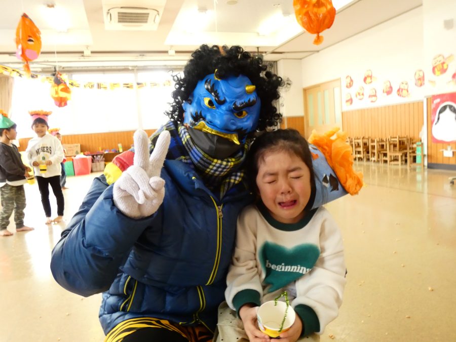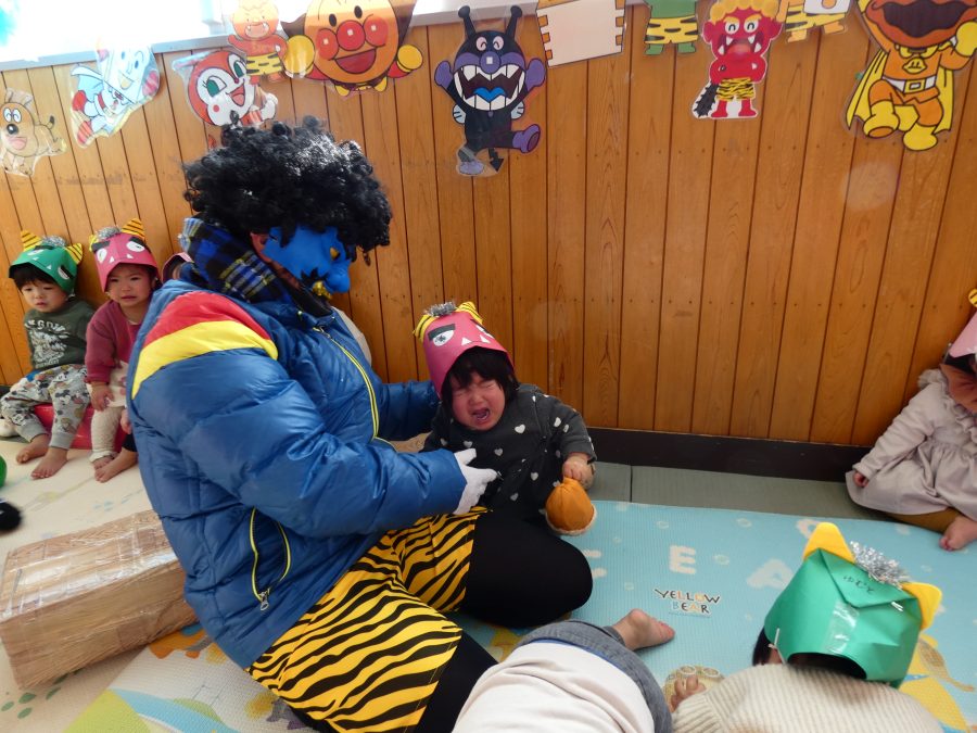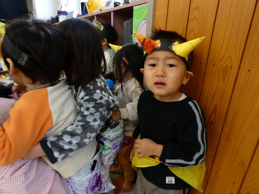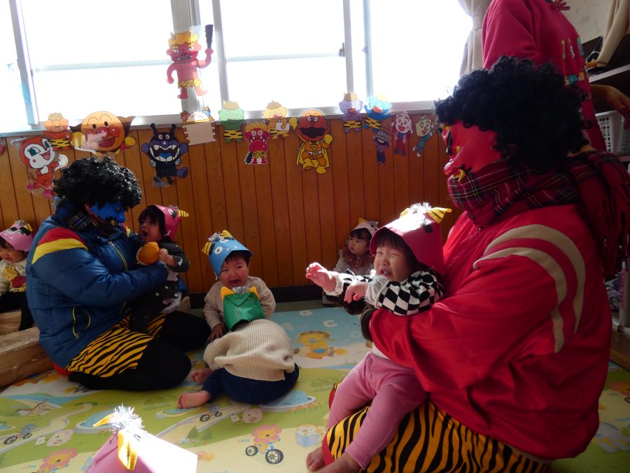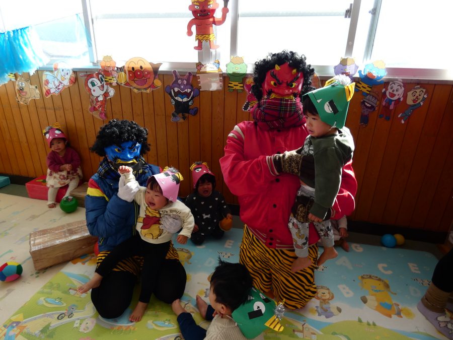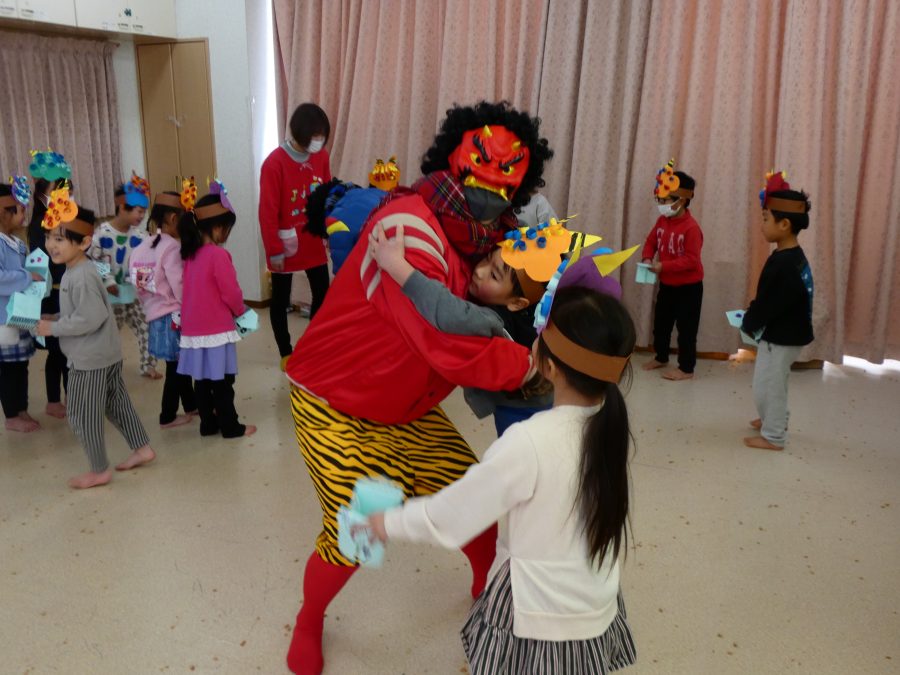 今日は節分。暦の上では季節の変わり目です。保育園でも、節分の行事として「豆まき」をしました。恒例の「鬼さん」も各保育室に現れ、子どもたちは大騒ぎ。でも、やがて慣れて鬼さんたちとハグする子どもたちでした。