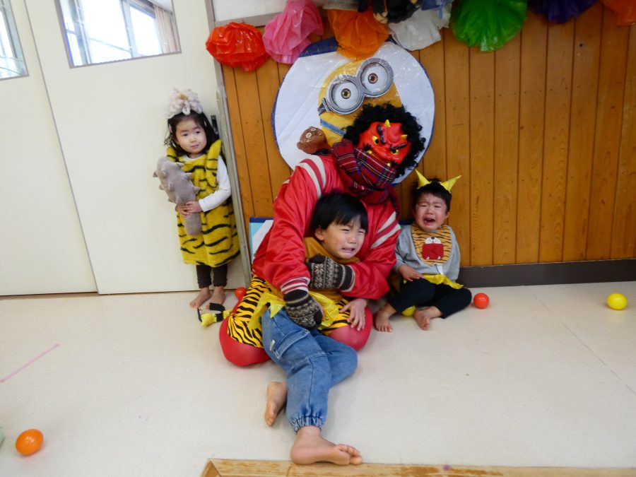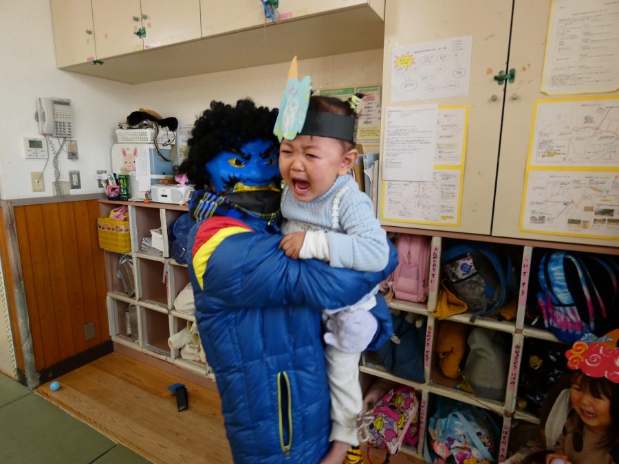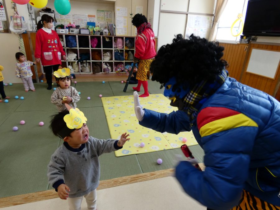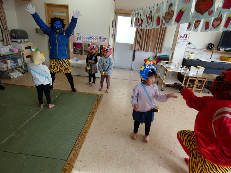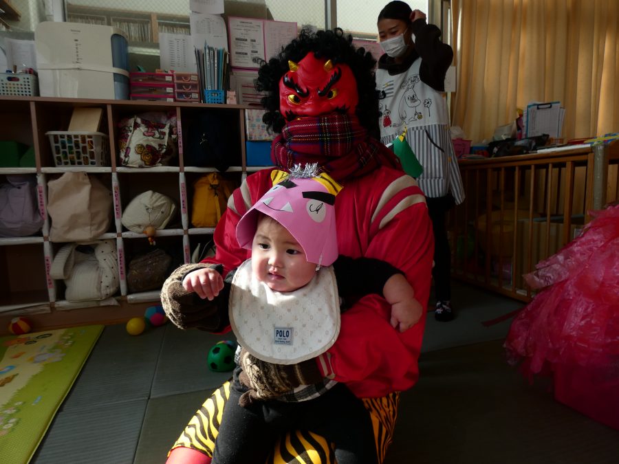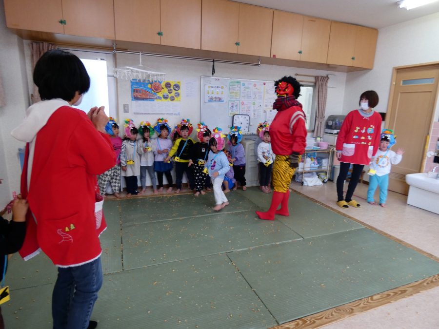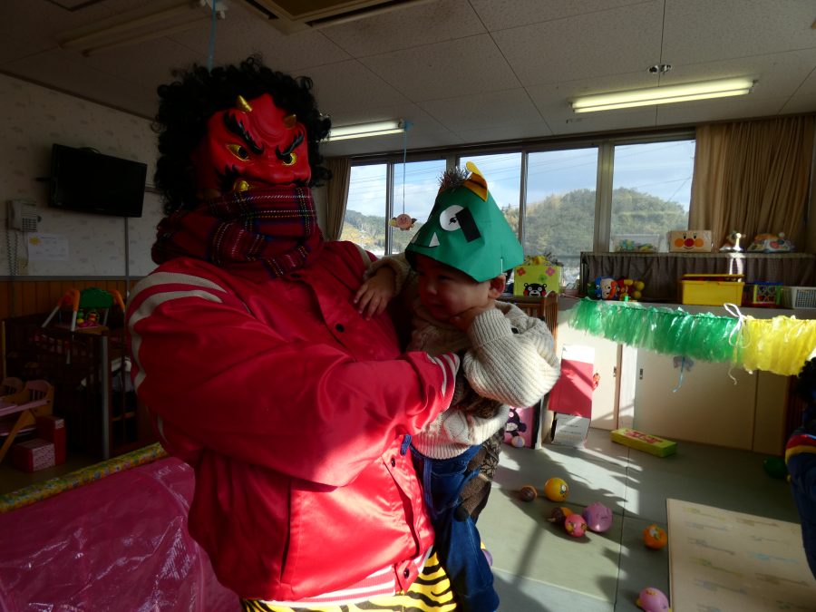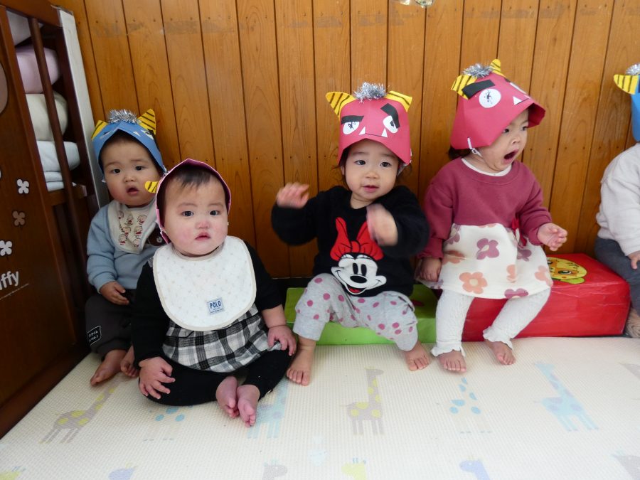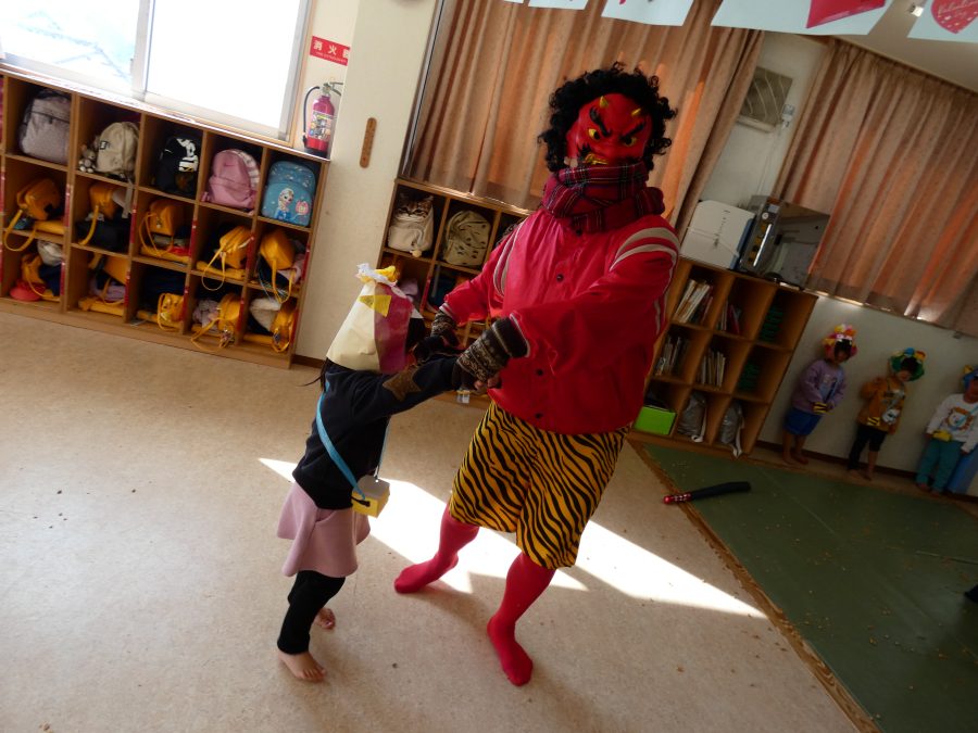 今日は節分。暦の上では季節の変わり目です。保育園でも、節分の行事として「豆まき」をしました。恒例の「鬼さん」も各保育室に現れ、子どもたちは大騒ぎ。でも、やがて慣れて鬼さんたちとハグする子どもたちでした。