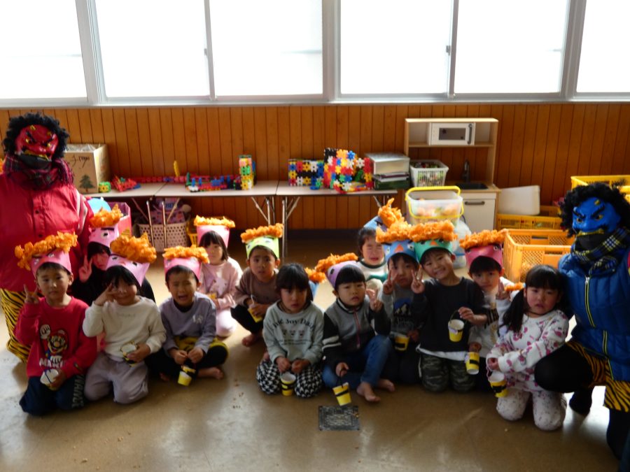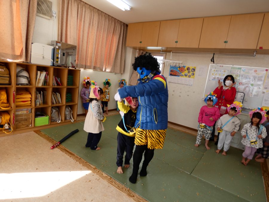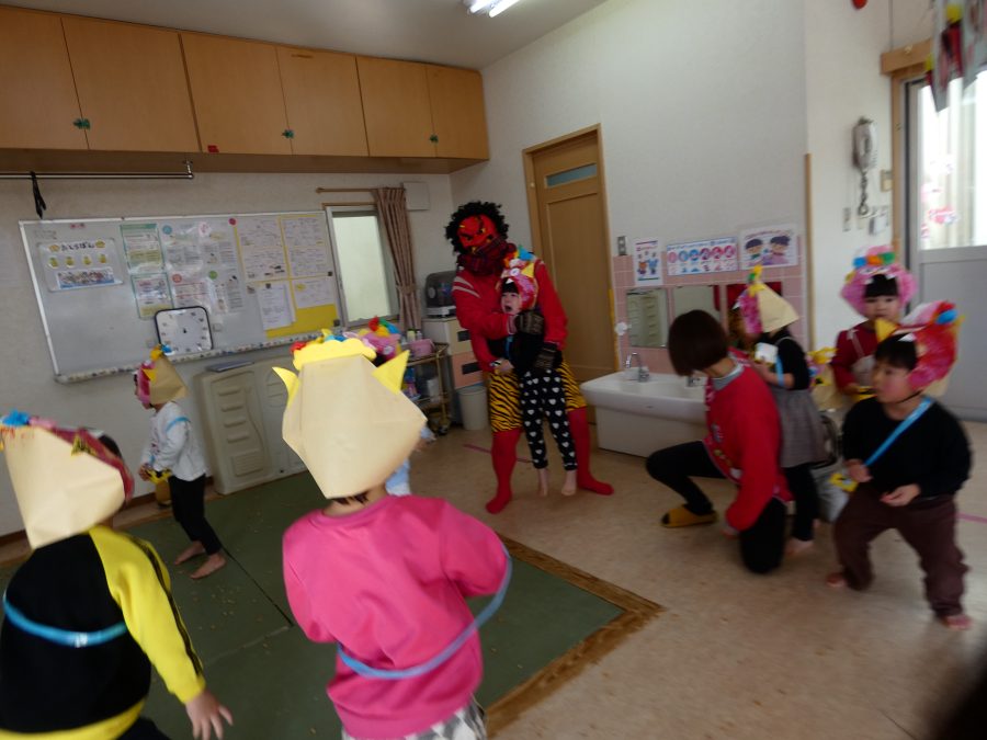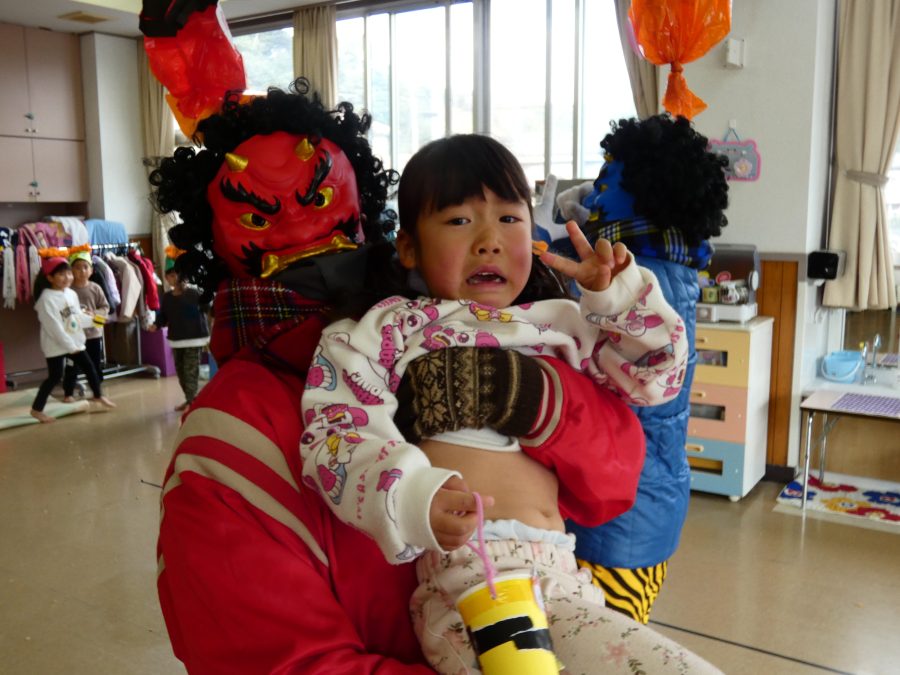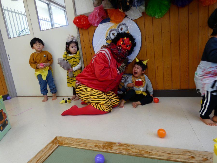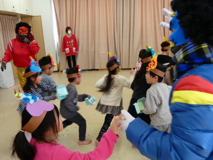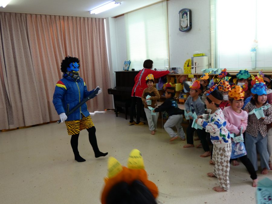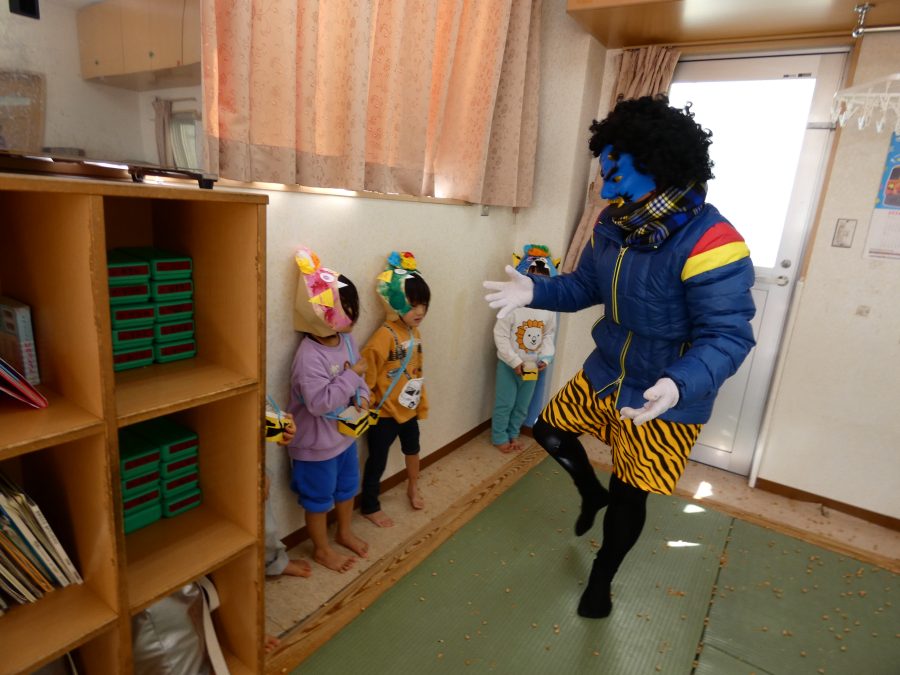 今日は節分。暦の上では季節の変わり目です。保育園でも、節分の行事として「豆まき」をしました。恒例の「鬼さん」も各保育室に現れ、子どもたちは大騒ぎ。でも、やがて慣れて鬼さんたちとハグする子どもたちでした。