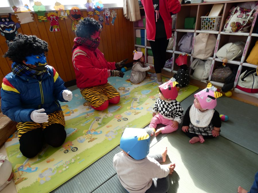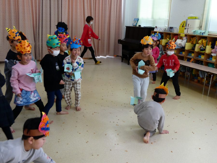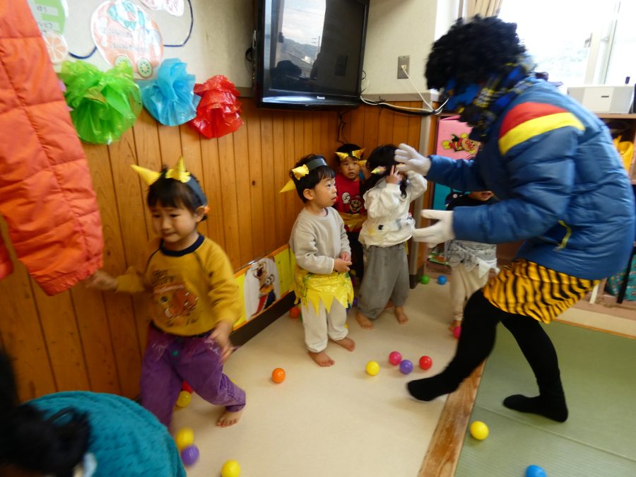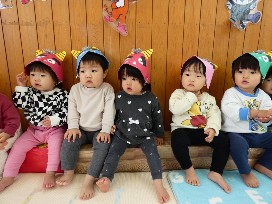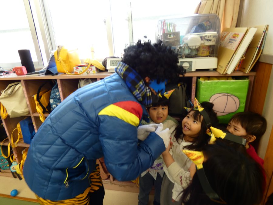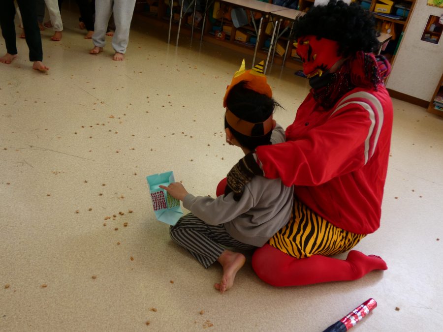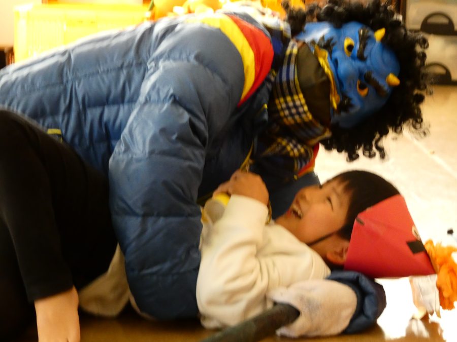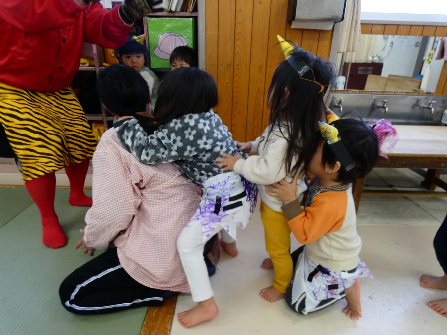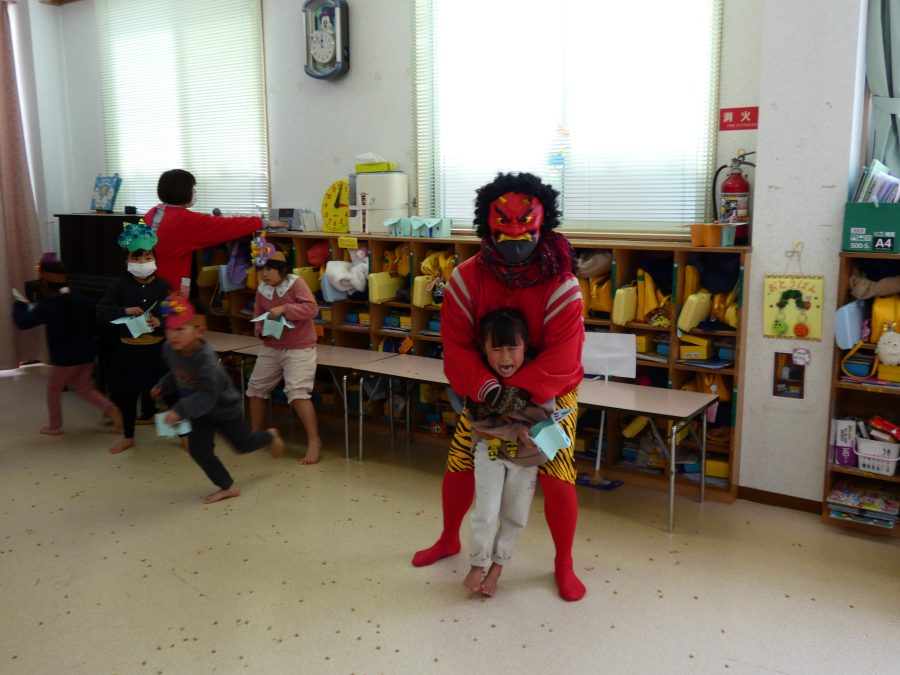 今日は節分。暦の上では季節の変わり目です。保育園でも、節分の行事として「豆まき」をしました。恒例の「鬼さん」も各保育室に現れ、子どもたちは大騒ぎ。でも、やがて慣れて鬼さんたちとハグする子どもたちでした。
