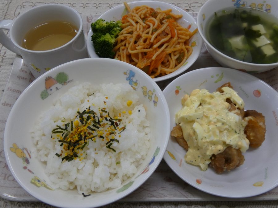 今日のメニューは「ご飯、チキン南蛮タルタルソースかけ、ナポリタンスパゲッティ、ボイル野菜、豆腐のスープ(わかめ)」でした。