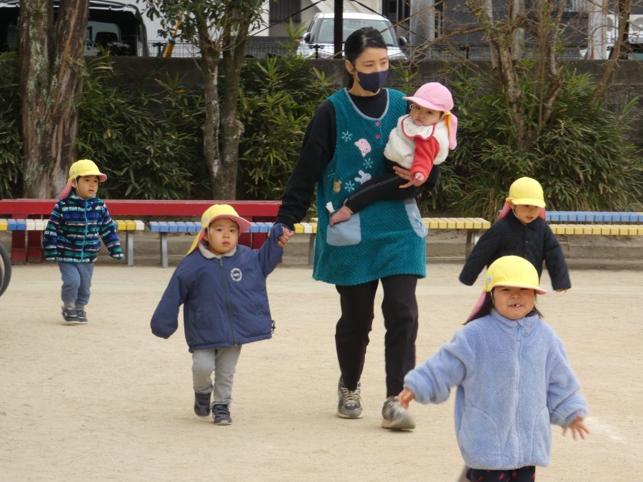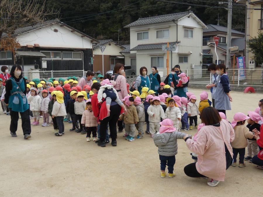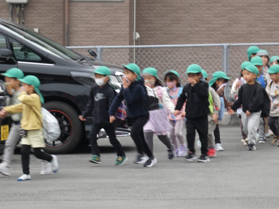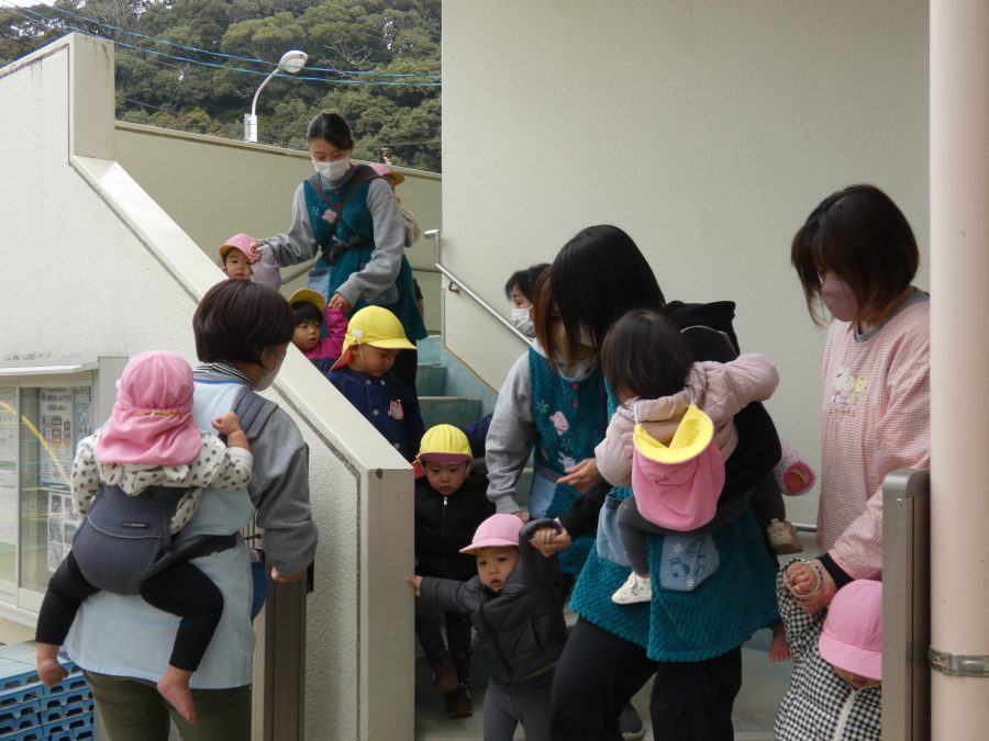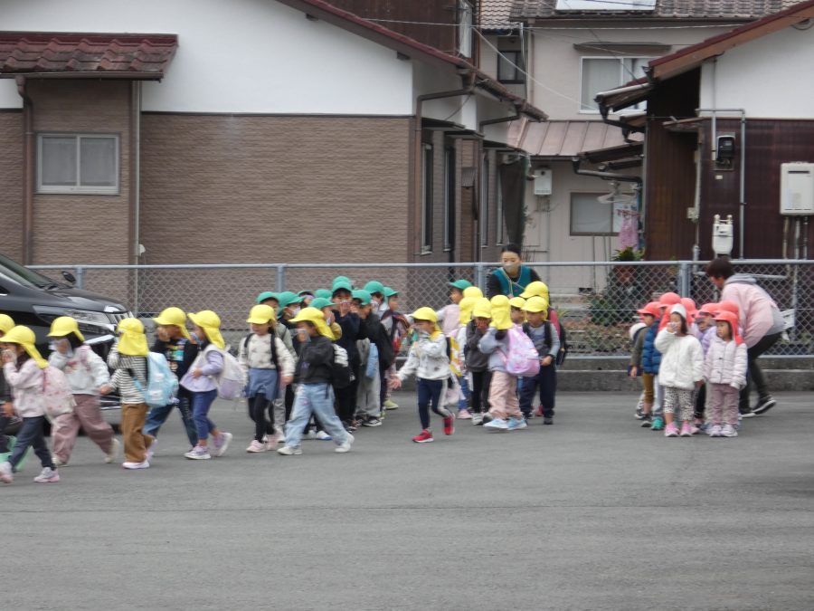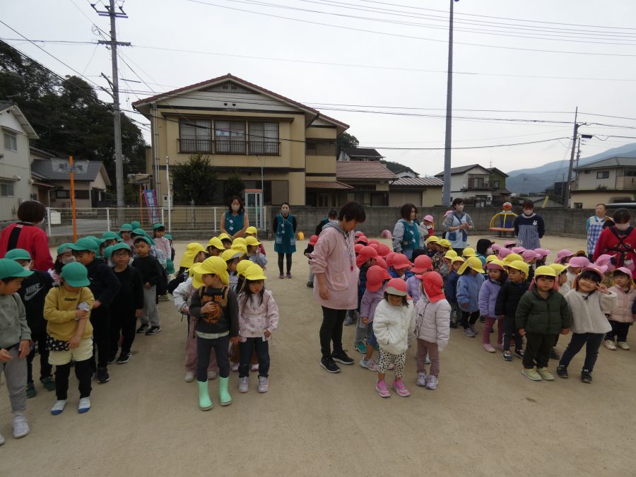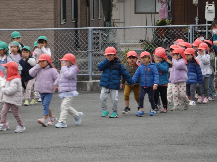 今日、2月の避難訓練を実施しました。今回は、「近隣の民家から火災発生」という想定で行いました。今年度の避難訓練も11回目となり、子どもたちも随分と上手に避難できるようになりました。