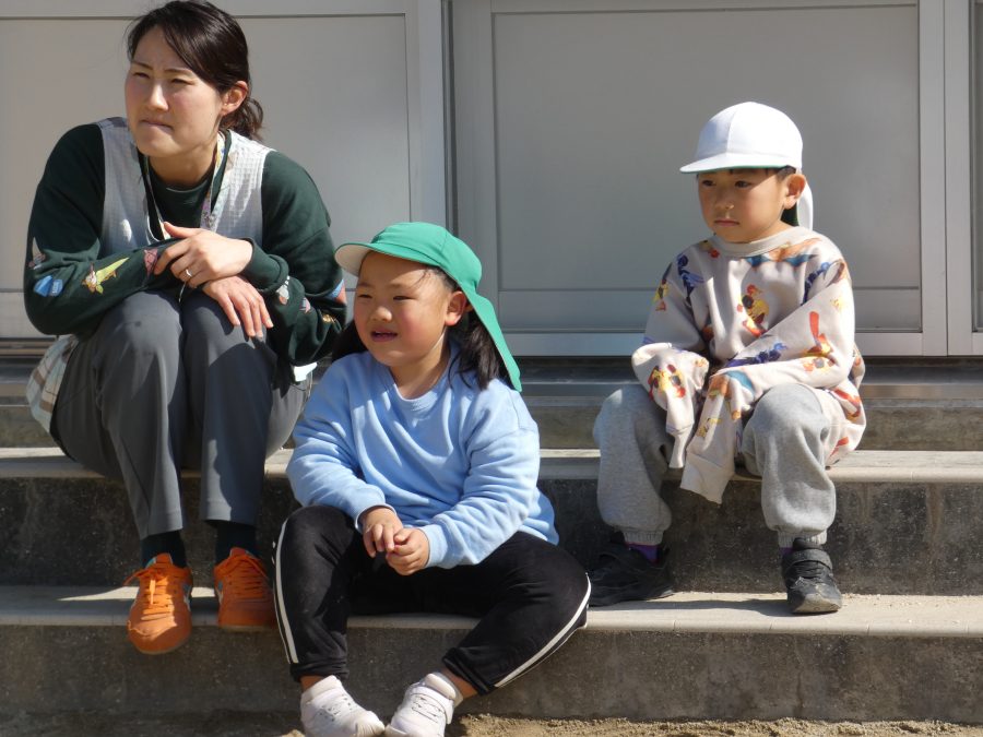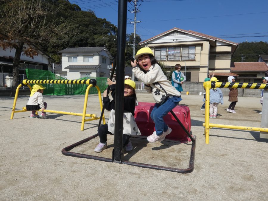 春を感じる暖かな昼下がり、赤・黄・緑組の子どもたちが外遊びを楽しんでいました。