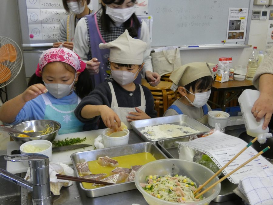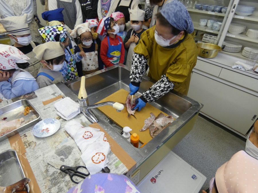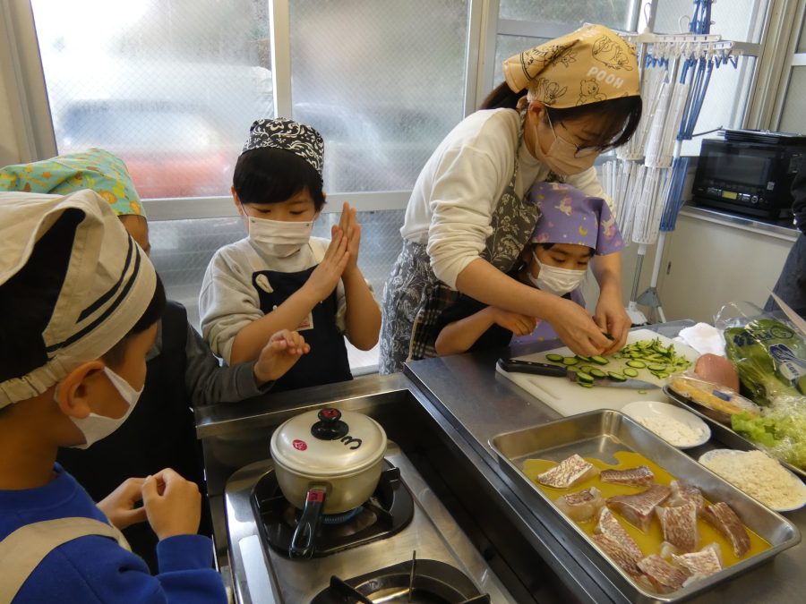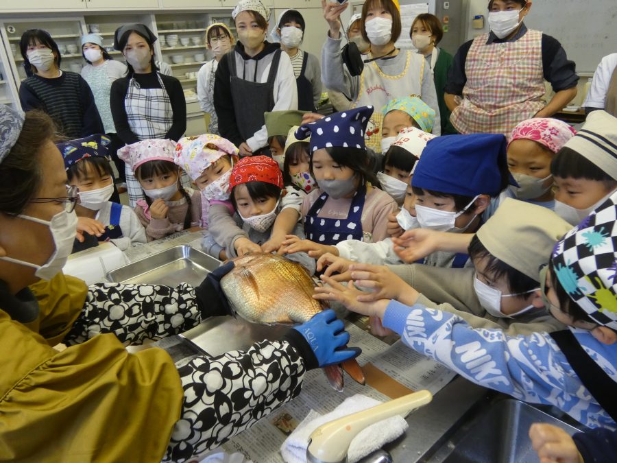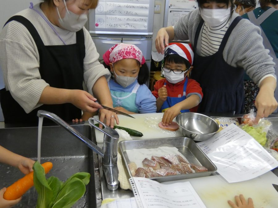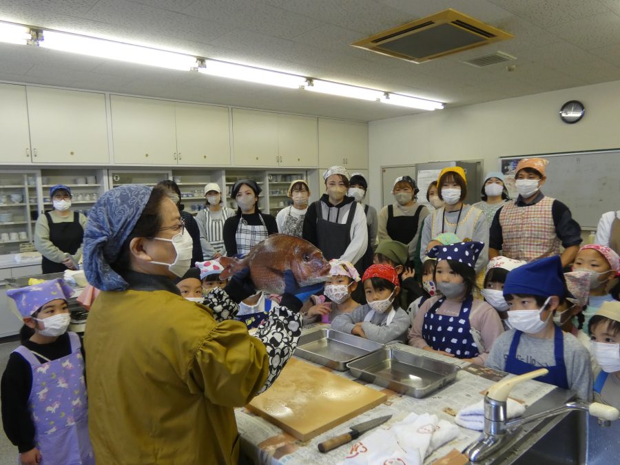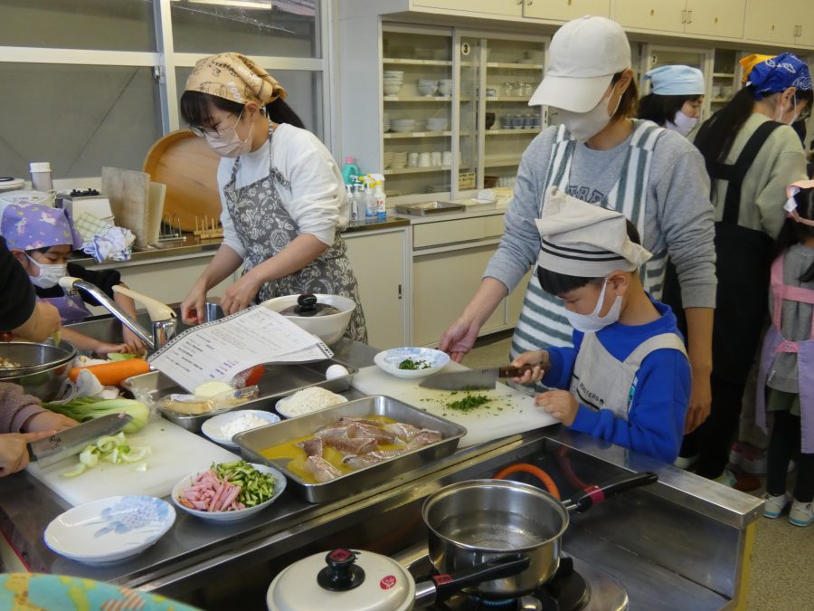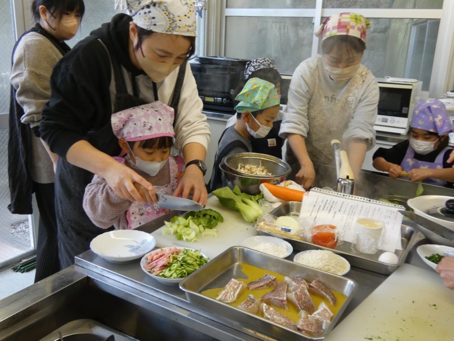 今日、親子料理教室を実施しました。まずはじめに「鯛一郎くんの解体ショー」を講師の先生に見せてもらいました。子どもたちは興味津々で見ていました。続いて、いよいよ親子でクッキング。今回は「鯛ポンカツ麦タルソース、切り干し大根のサラダ、鯛のあらすまし汁」をみんなでワイワイ言いながら作りました。出来上がったら、炊きたての美味しいご飯(三間米)と一緒にいただきました。子どもたちが地元の食材に親しむよい機会となりました。
