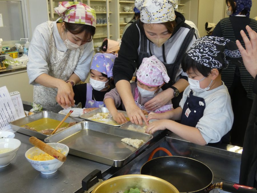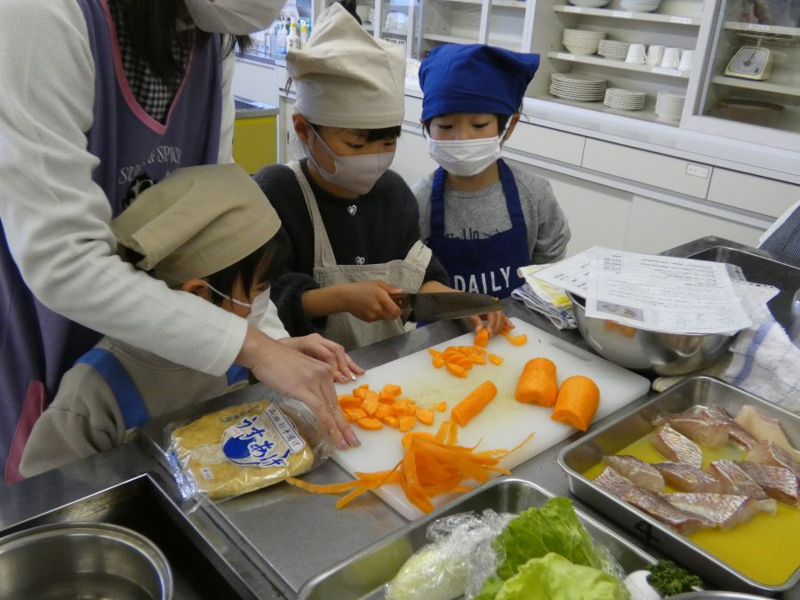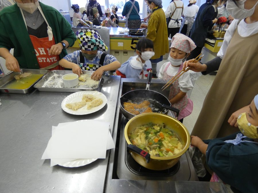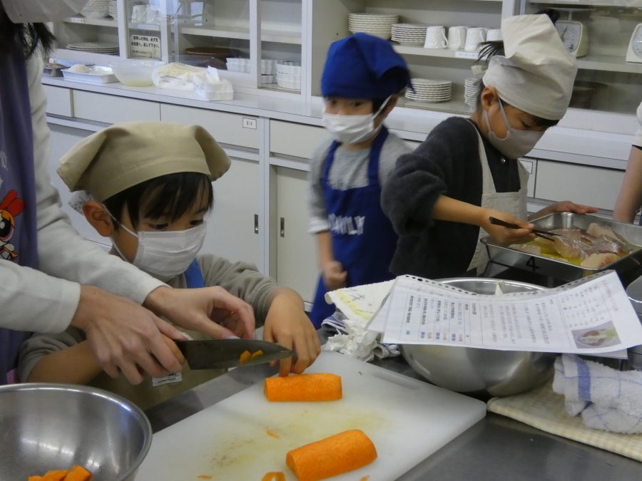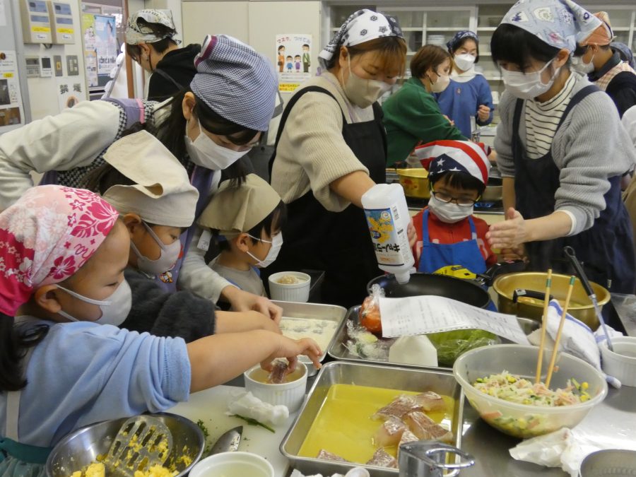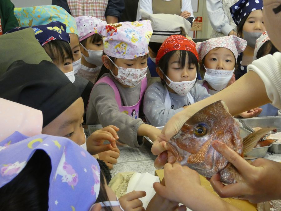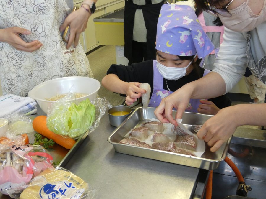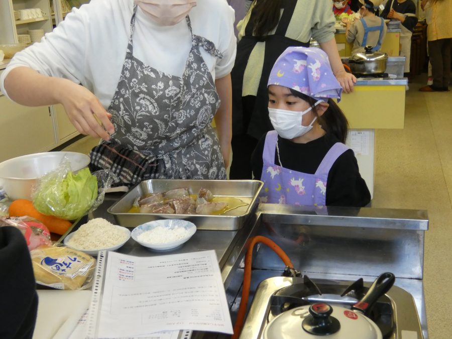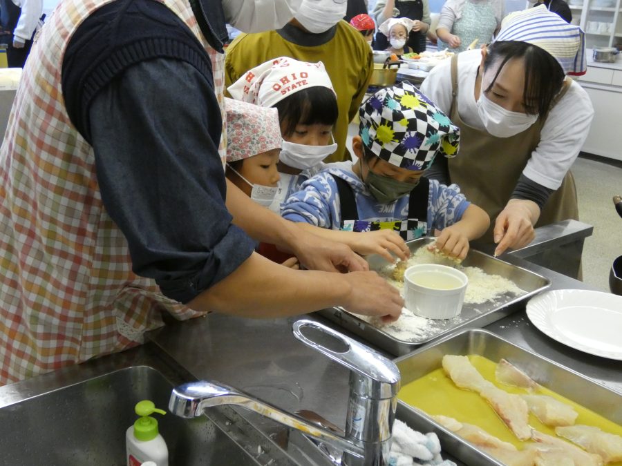 今日、親子料理教室を実施しました。まずはじめに「鯛一郎くんの解体ショー」を講師の先生に見せてもらいました。子どもたちは興味津々で見ていました。続いて、いよいよ親子でクッキング。今回は「鯛ポンカツ麦タルソース、切り干し大根のサラダ、鯛のあらすまし汁」をみんなでワイワイ言いながら作りました。出来上がったら、炊きたての美味しいご飯(三間米)と一緒にいただきました。子どもたちが地元の食材に親しむよい機会となりました。