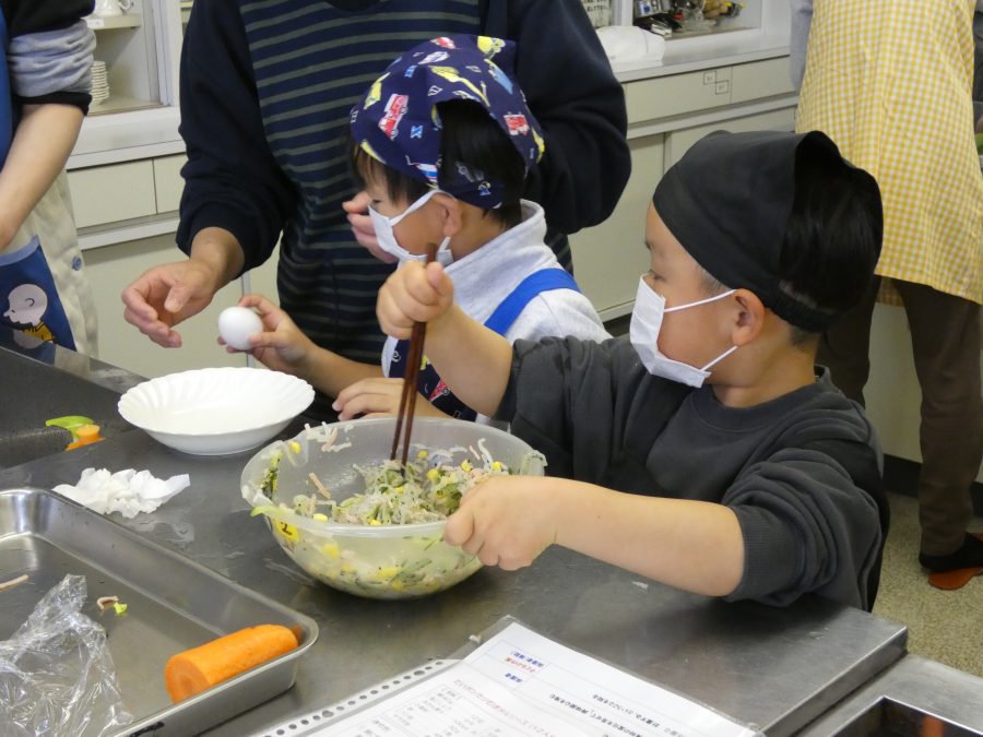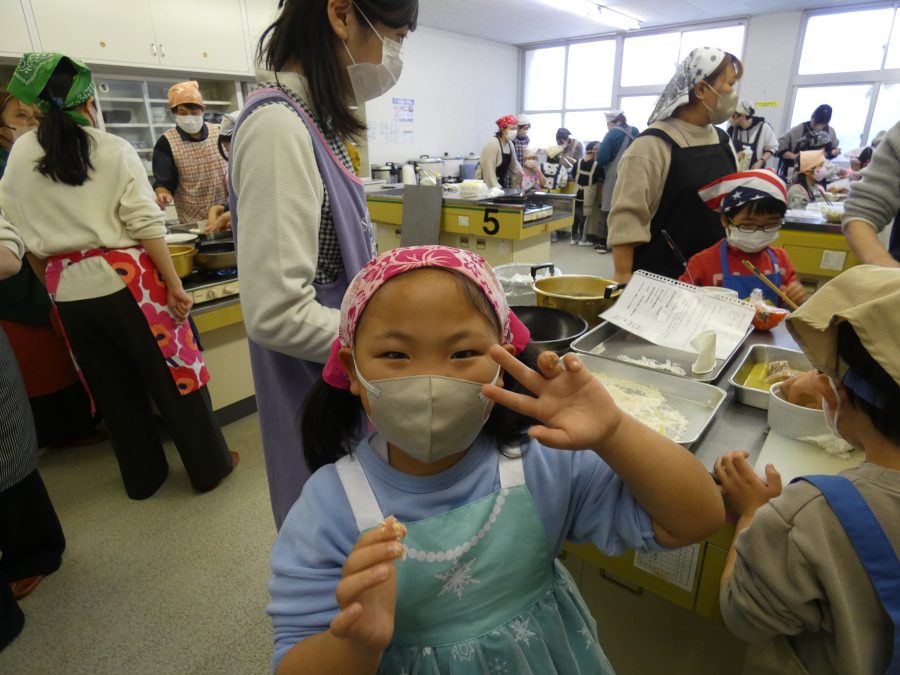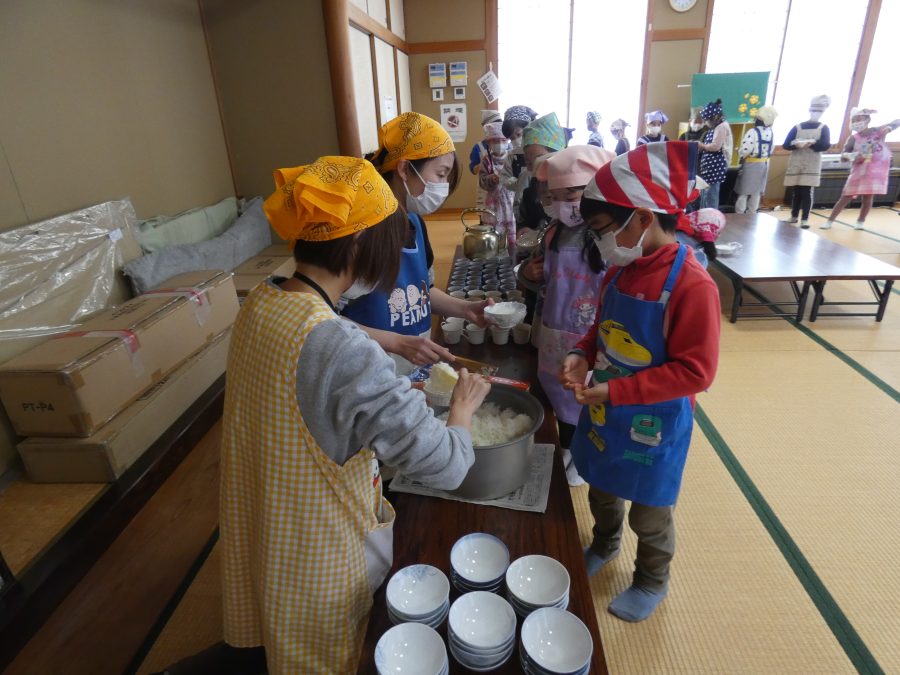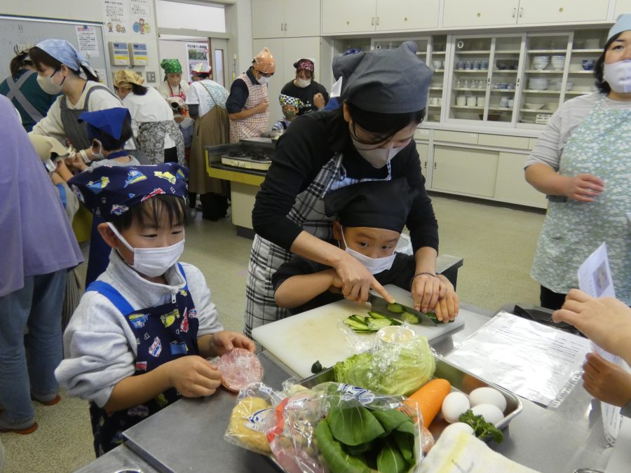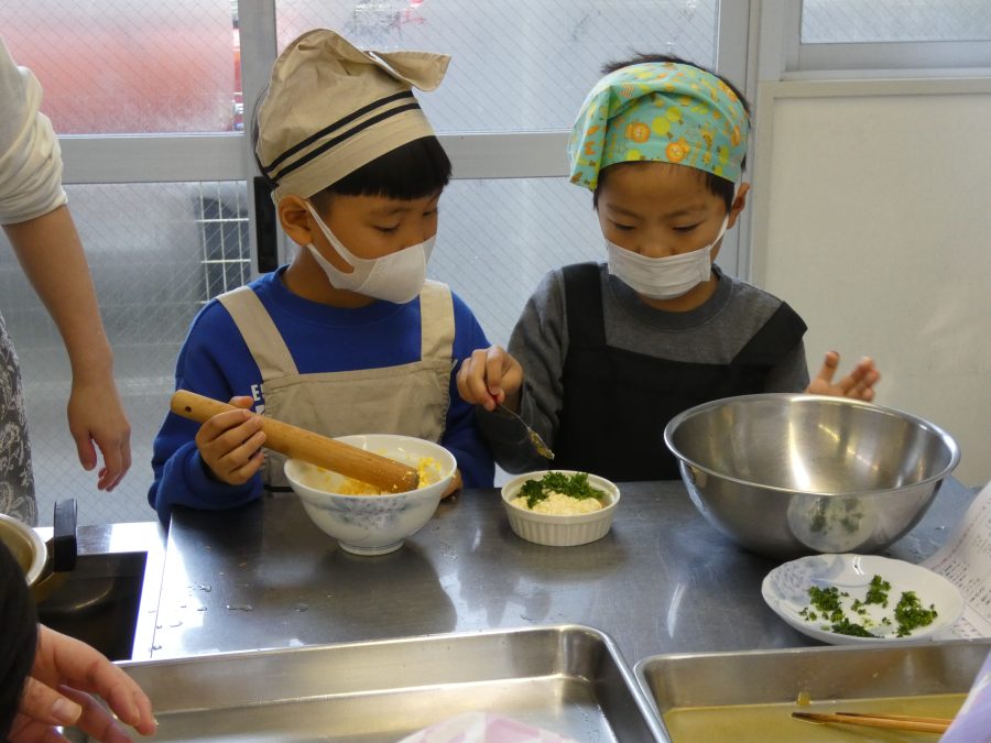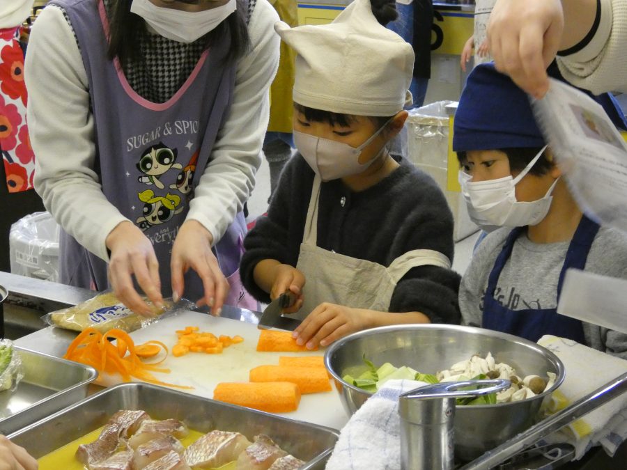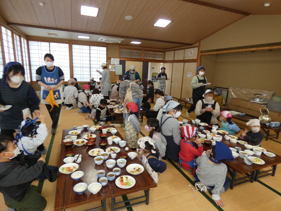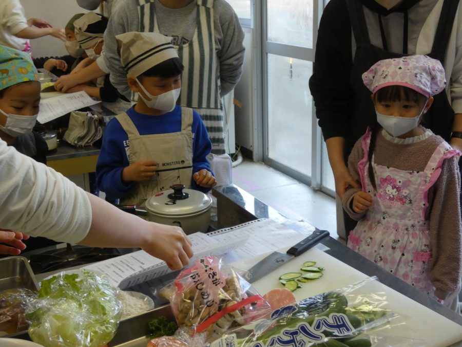 今日、親子料理教室を実施しました。まずはじめに「鯛一郎くんの解体ショー」を講師の先生に見せてもらいました。子どもたちは興味津々で見ていました。続いて、いよいよ親子でクッキング。今回は「鯛ポンカツ麦タルソース、切り干し大根のサラダ、鯛のあらすまし汁」をみんなでワイワイ言いながら作りました。出来上がったら、炊きたての美味しいご飯(三間米)と一緒にいただきました。子どもたちが地元の食材に親しむよい機会となりました。