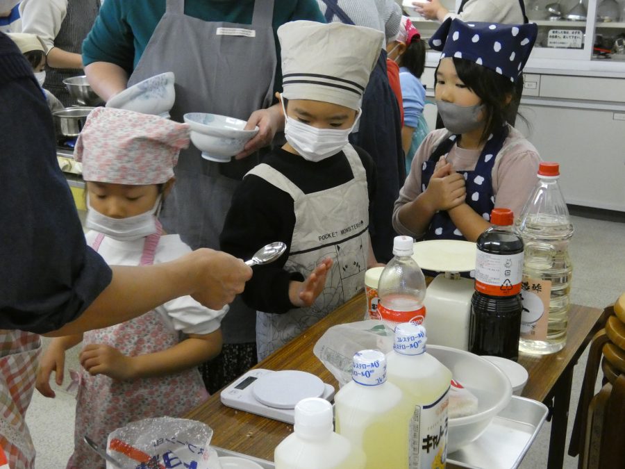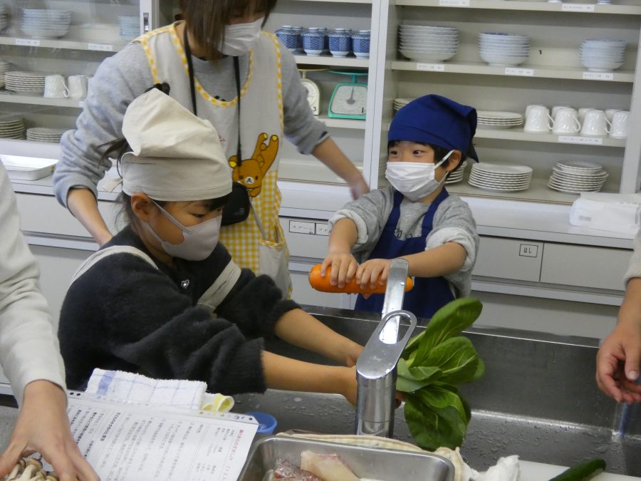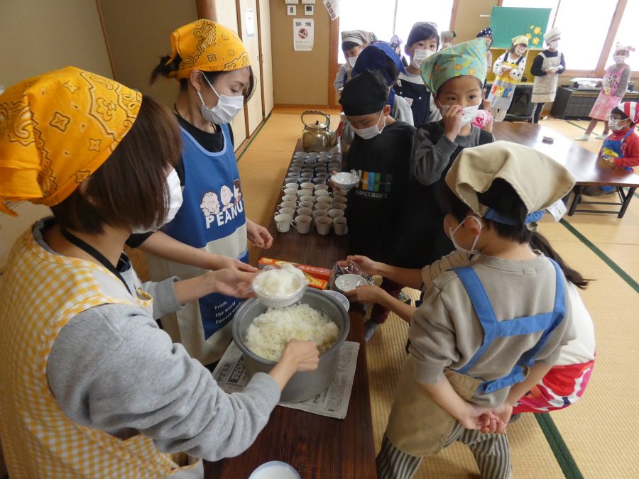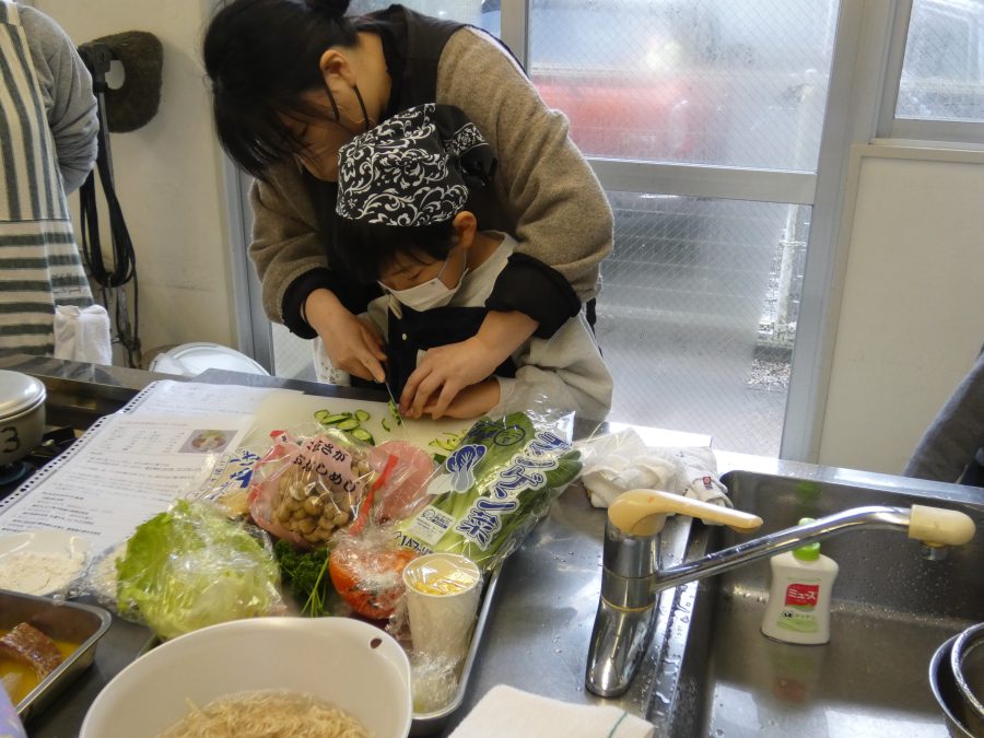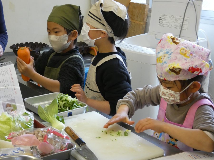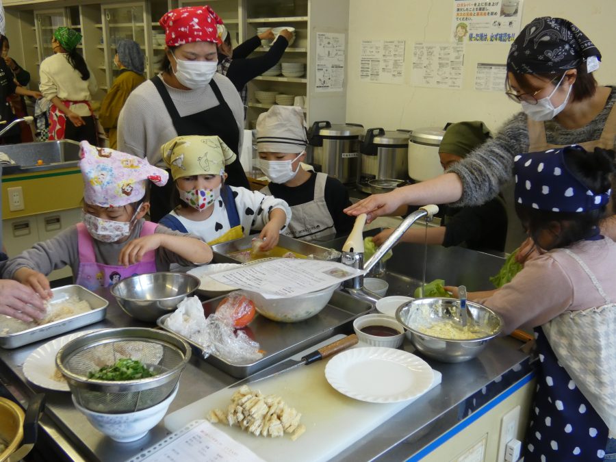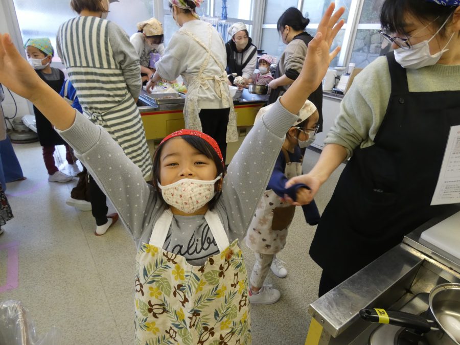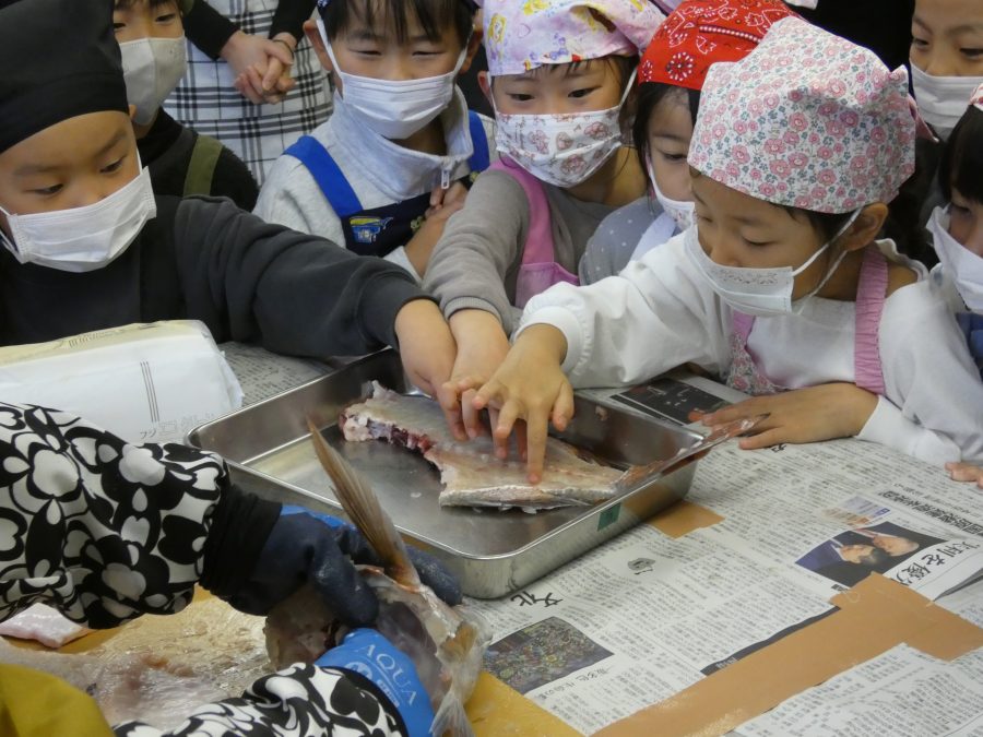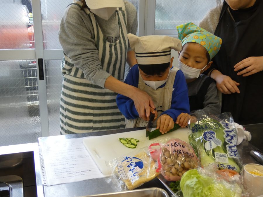 今日、親子料理教室を実施しました。まずはじめに「鯛一郎くんの解体ショー」を講師の先生に見せてもらいました。子どもたちは興味津々で見ていました。続いて、いよいよ親子でクッキング。今回は「鯛ポンカツ麦タルソース、切り干し大根のサラダ、鯛のあらすまし汁」をみんなでワイワイ言いながら作りました。出来上がったら、炊きたての美味しいご飯(三間米)と一緒にいただきました。子どもたちが地元の食材に親しむよい機会となりました。