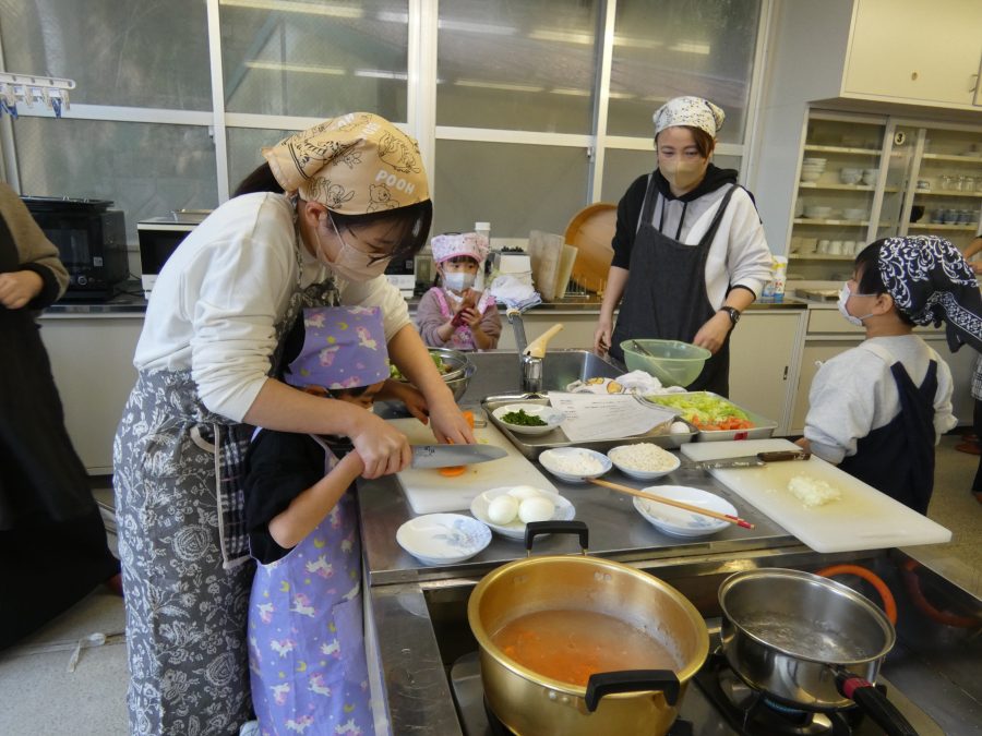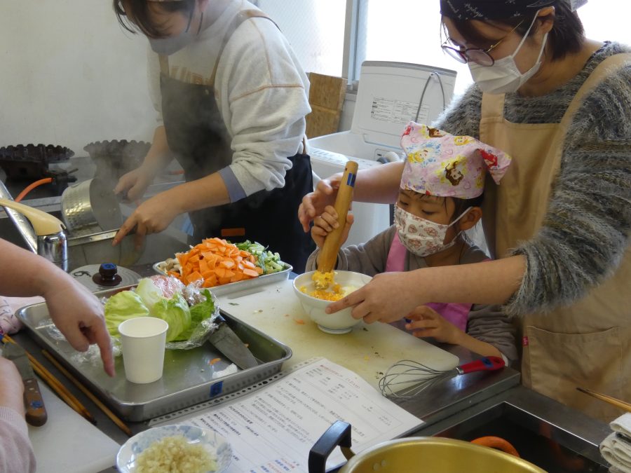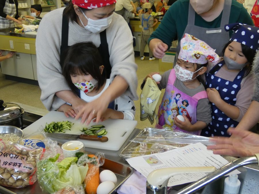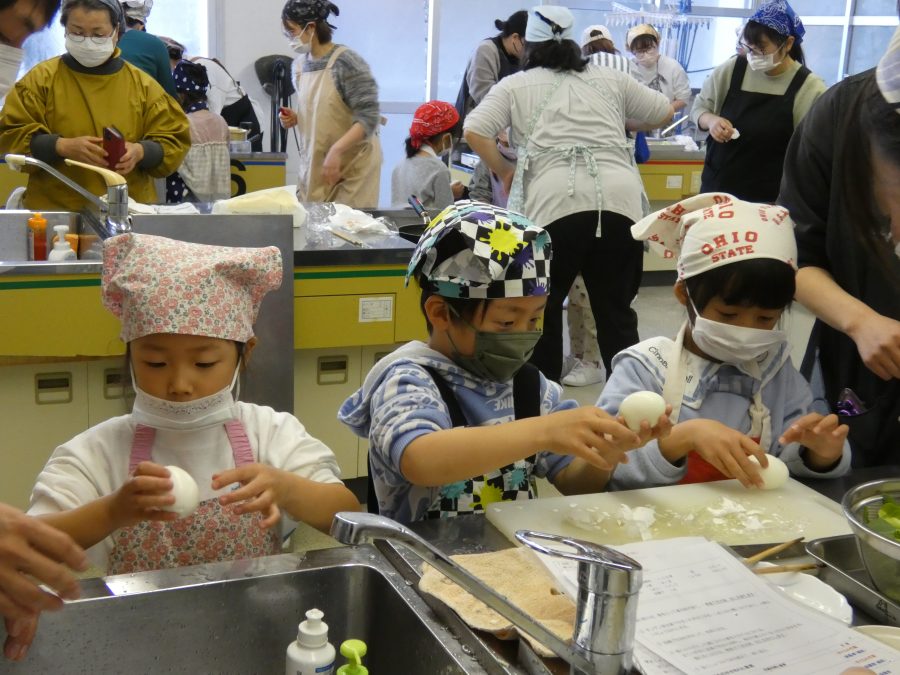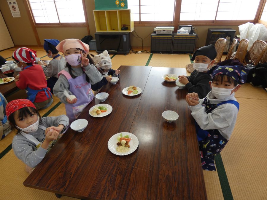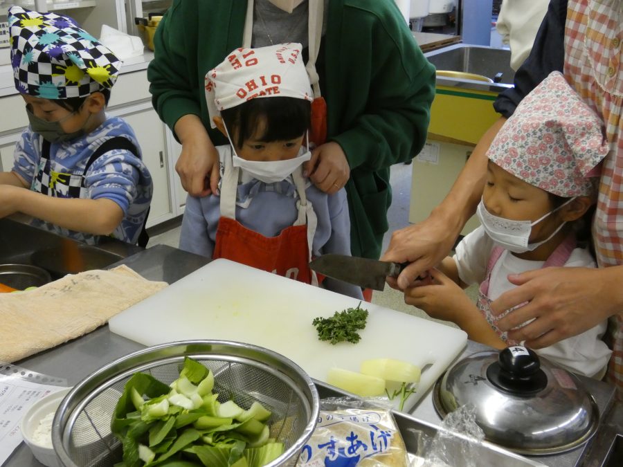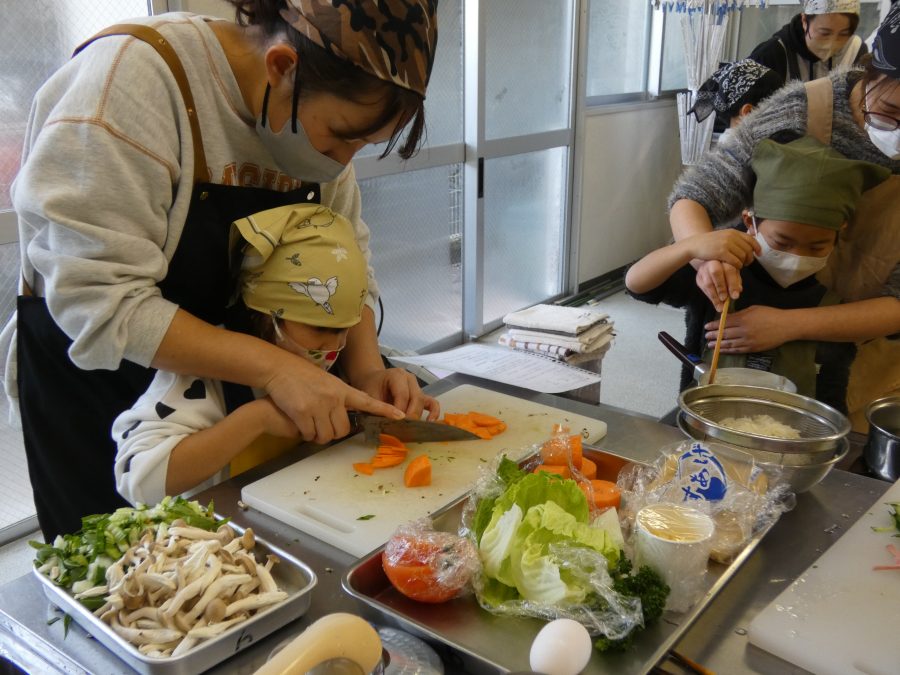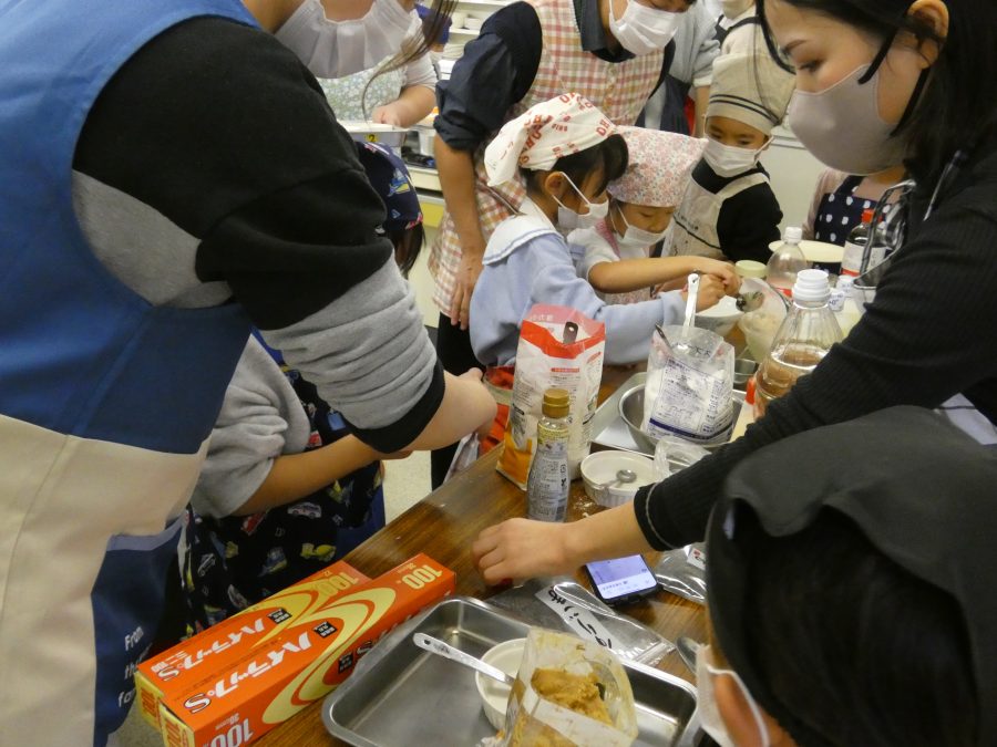 今日、親子料理教室を実施しました。まずはじめに「鯛一郎くんの解体ショー」を講師の先生に見せてもらいました。子どもたちは興味津々で見ていました。続いて、いよいよ親子でクッキング。今回は「鯛ポンカツ麦タルソース、切り干し大根のサラダ、鯛のあらすまし汁」をみんなでワイワイ言いながら作りました。出来上がったら、炊きたての美味しいご飯(三間米)と一緒にいただきました。子どもたちが地元の食材に親しむよい機会となりました。