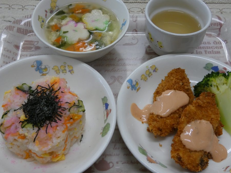 今日のメニューは「さけと卵のちらし寿司(ごま)、白身魚のフライオーロラソースかけ、ホイルプロッコリー、花麩のすまし汁」でした。