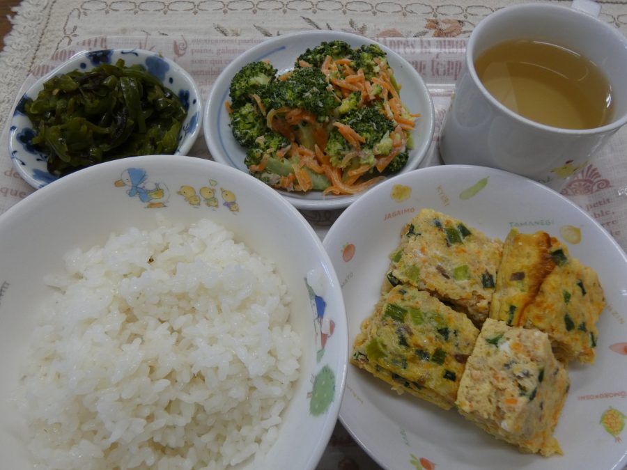 今日のメニューは「ご飯、親子焼き、ピーマンの塩昆布あえ、ブロッコリーと人参のツナサラダ」でした。