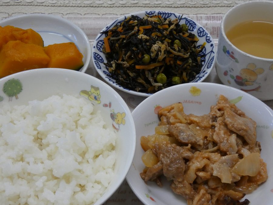 今日のメニューは「ご飯、ポークケチャップ、かぼちゃの甘煮、ひじきの煮物(にんじん)」でした。