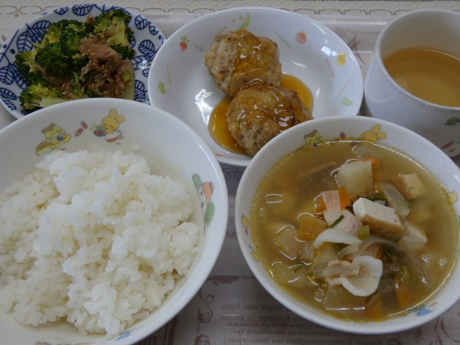 今日のメニューは「ご飯、豆腐ハーグの照り焼きソースがけ、ぶろっこりーのごま和え、根菜汁」でした。