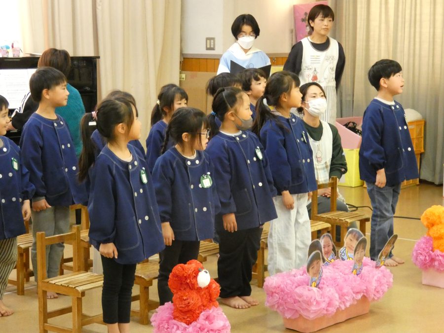 緑組さんの卒園式練習の様子です。少し緊張ぎみの子どもたちでしたが、年長さんらしく立派な態度で練習にとりくむことができました。保育園に入った頃は、あんなに幼かったのに、、、、。卒園式当日は、涙、涙、涙、、、、かな?