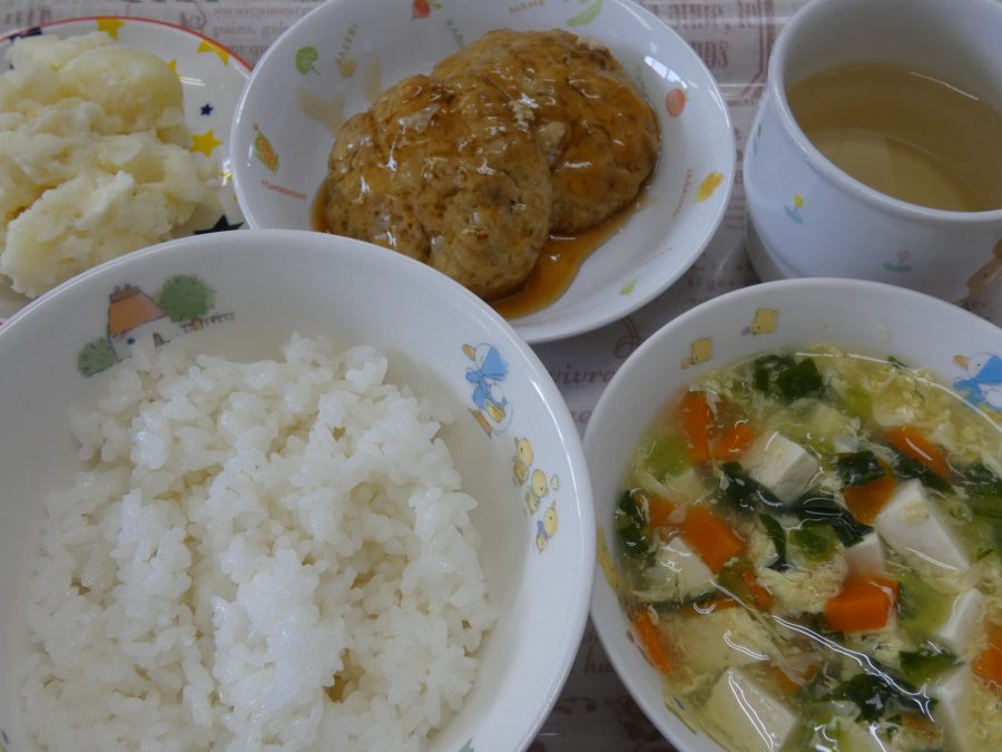 今日のメニューは「ご飯、豆腐バーグのあんかけ、かき玉汁(小松菜・豆腐)」でした。