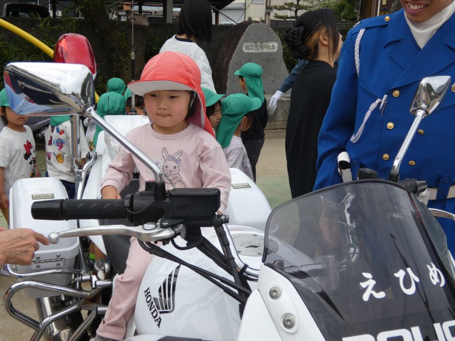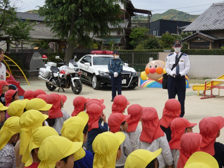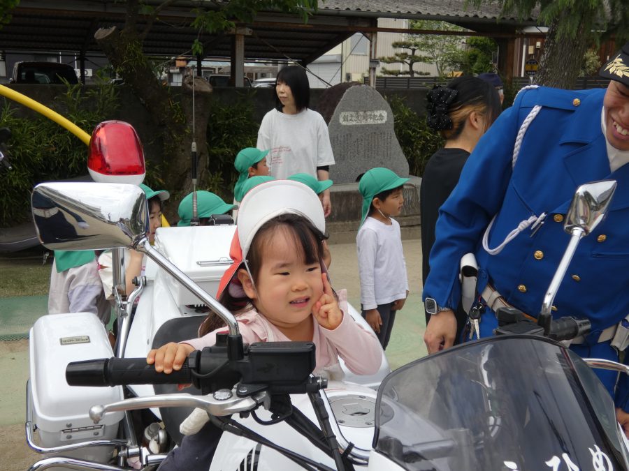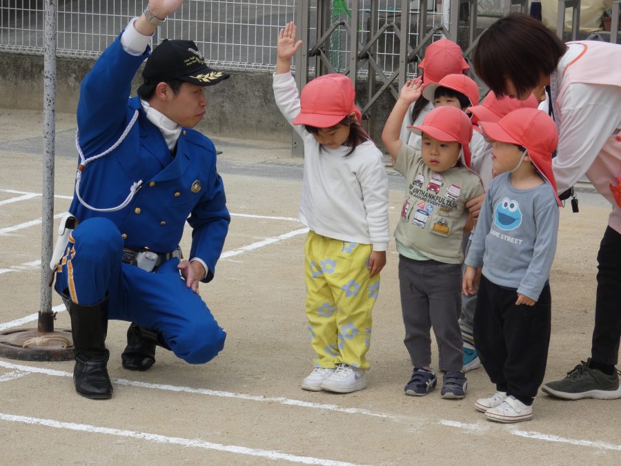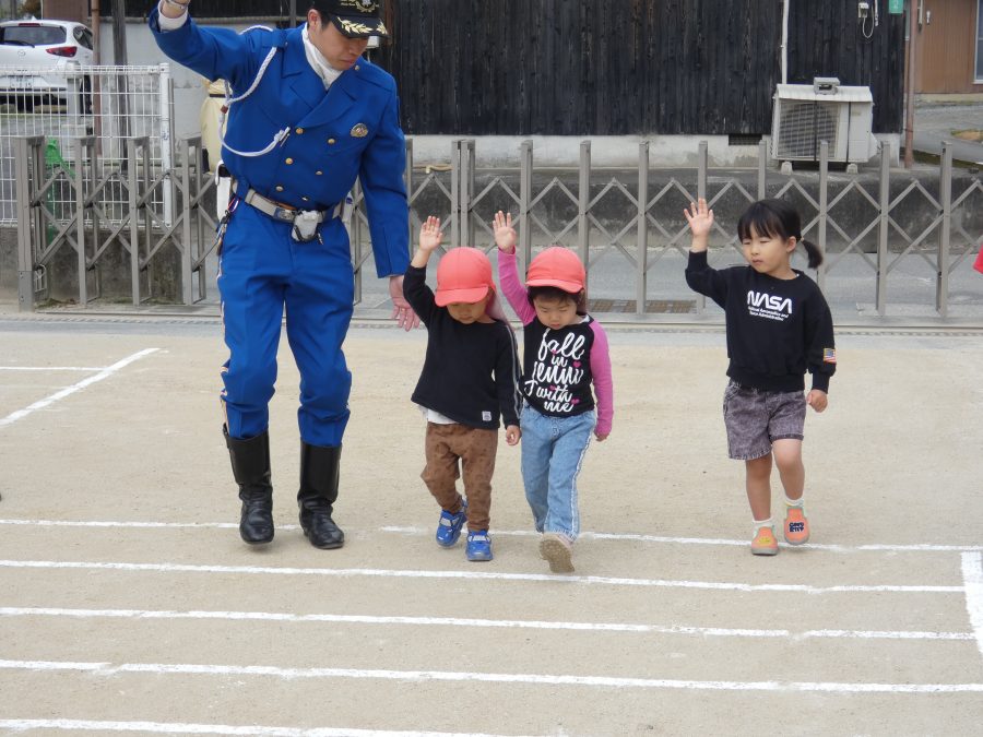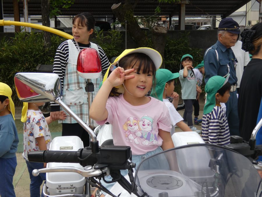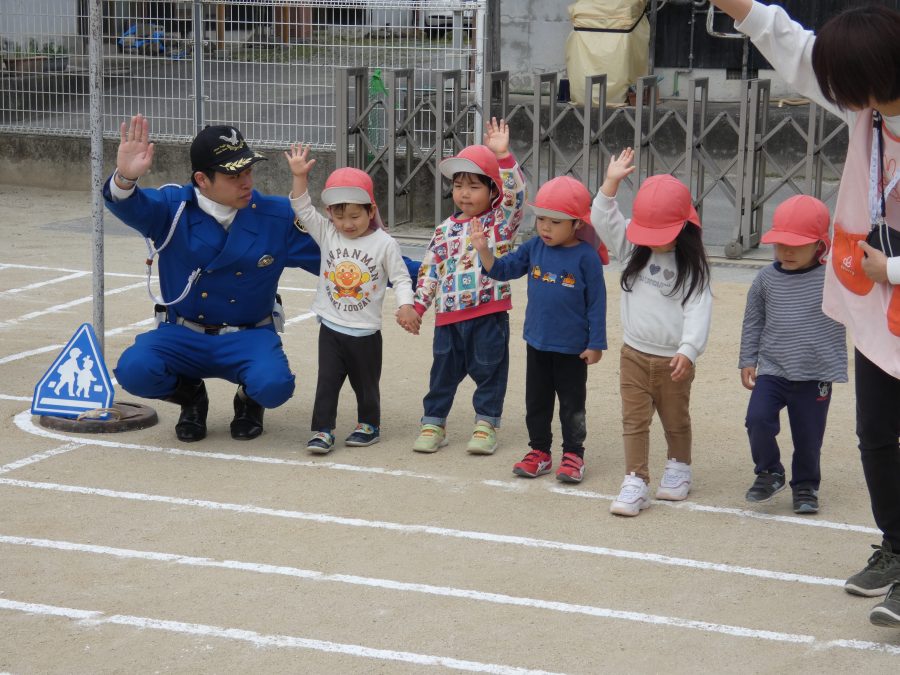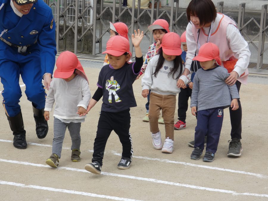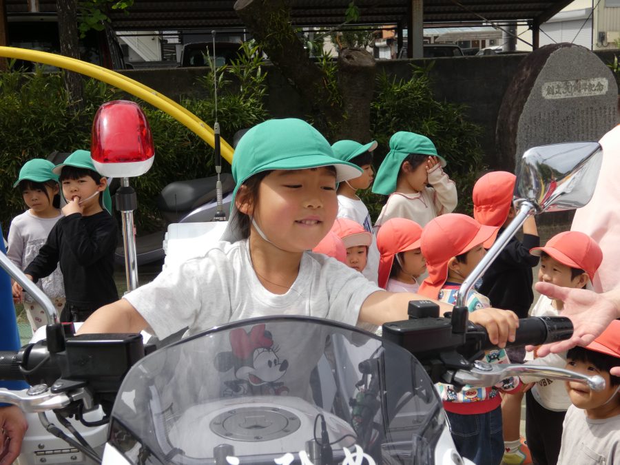 今年1回目の「交通安全教室」を実施しました。警察の方から信号のある横断歩道の渡り方を教えていただいた後、みんなで練習しました。何度も経験することで、交通安全への意識が高まるといいですね。後半では、白バイやパトカーに乗せてもらい、大喜びの子どもたちでした。