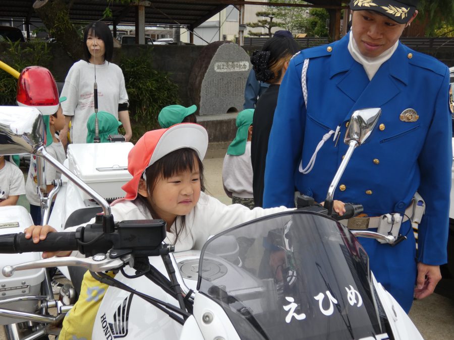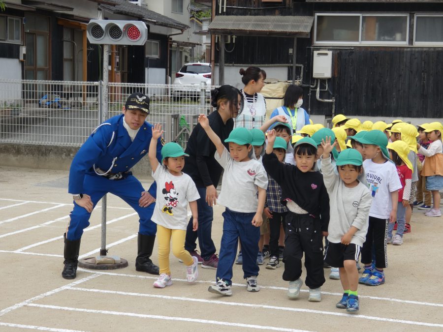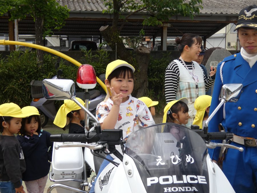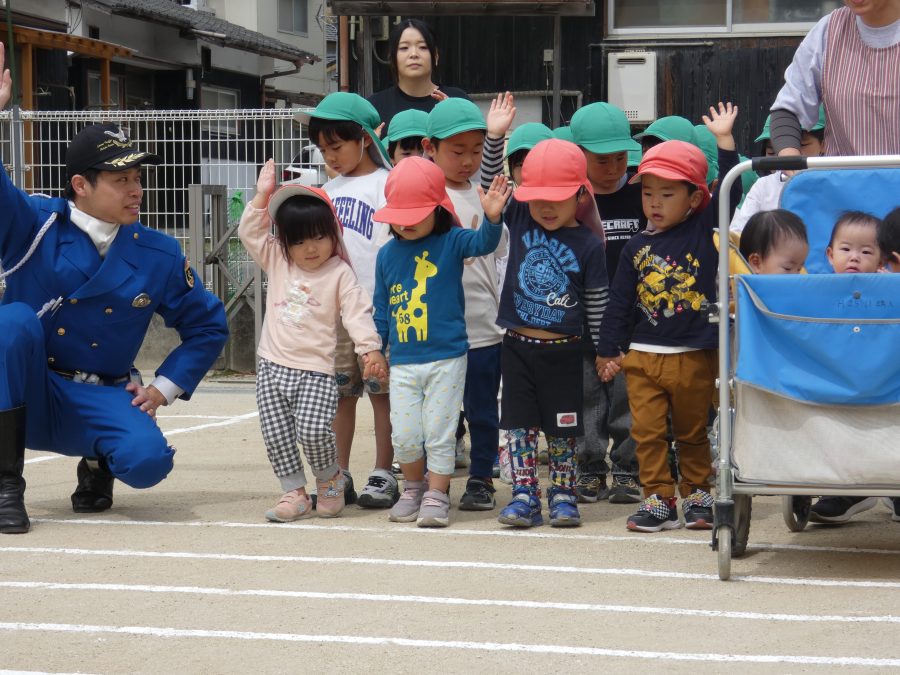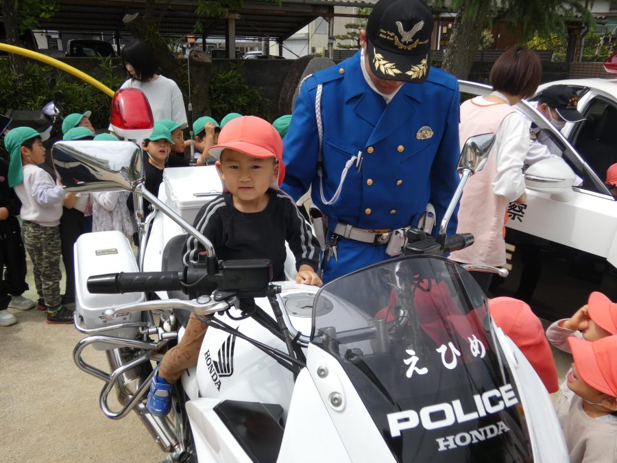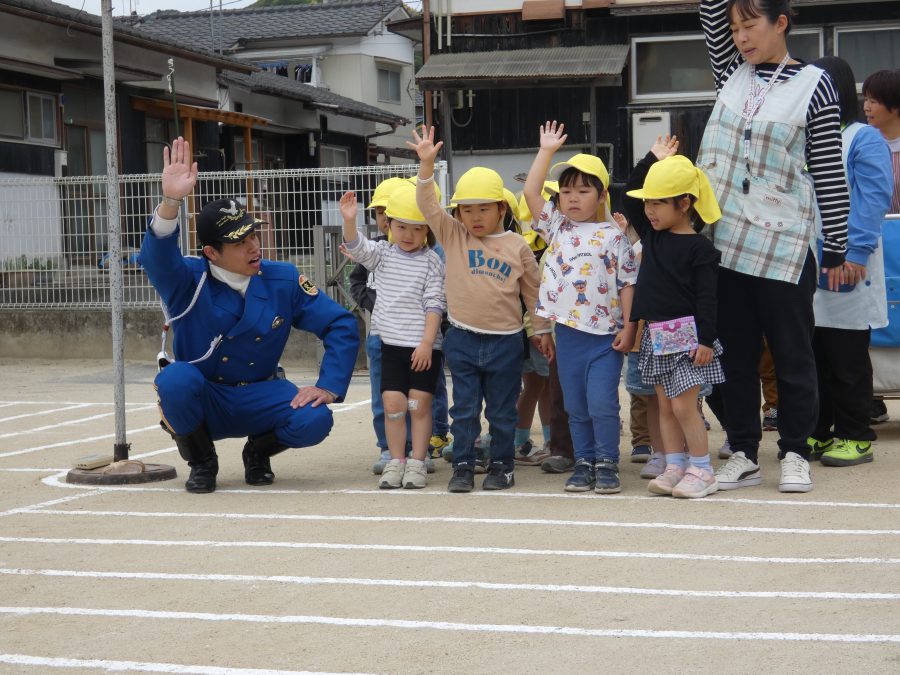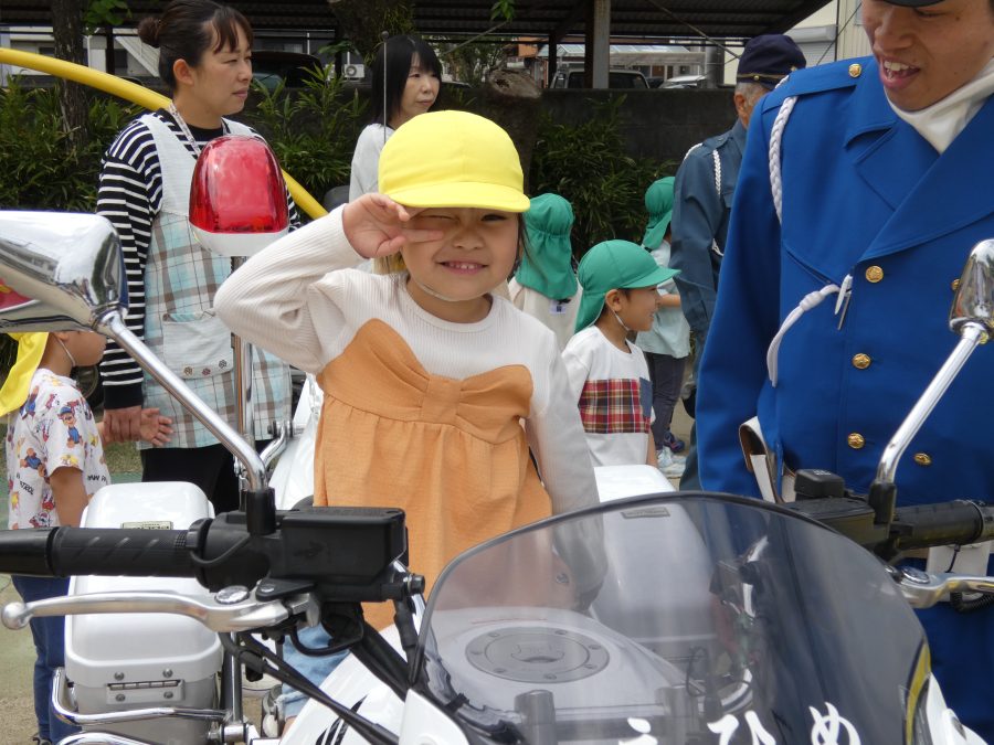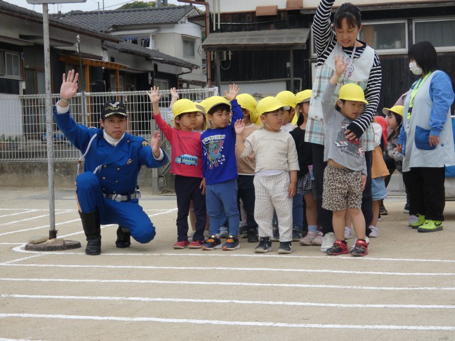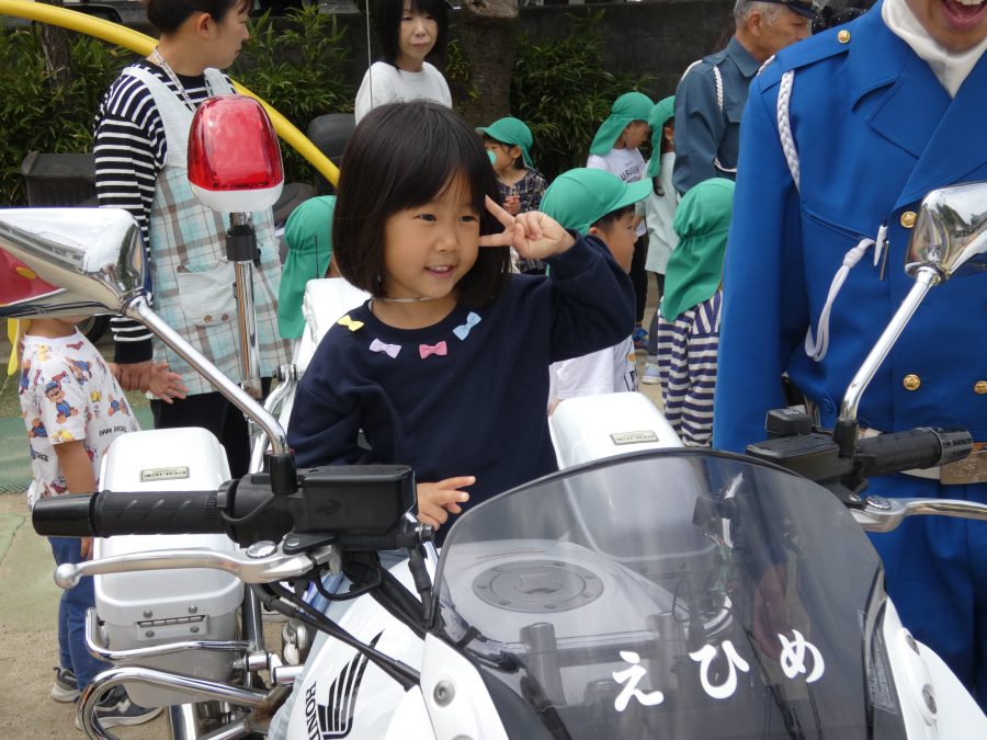 今年1回目の「交通安全教室」を実施しました。警察の方から信号のある横断歩道の渡り方を教えていただいた後、みんなで練習しました。何度も経験することで、交通安全への意識が高まるといいですね。後半では、白バイやパトカーに乗せてもらい、大喜びの子どもたちでした。