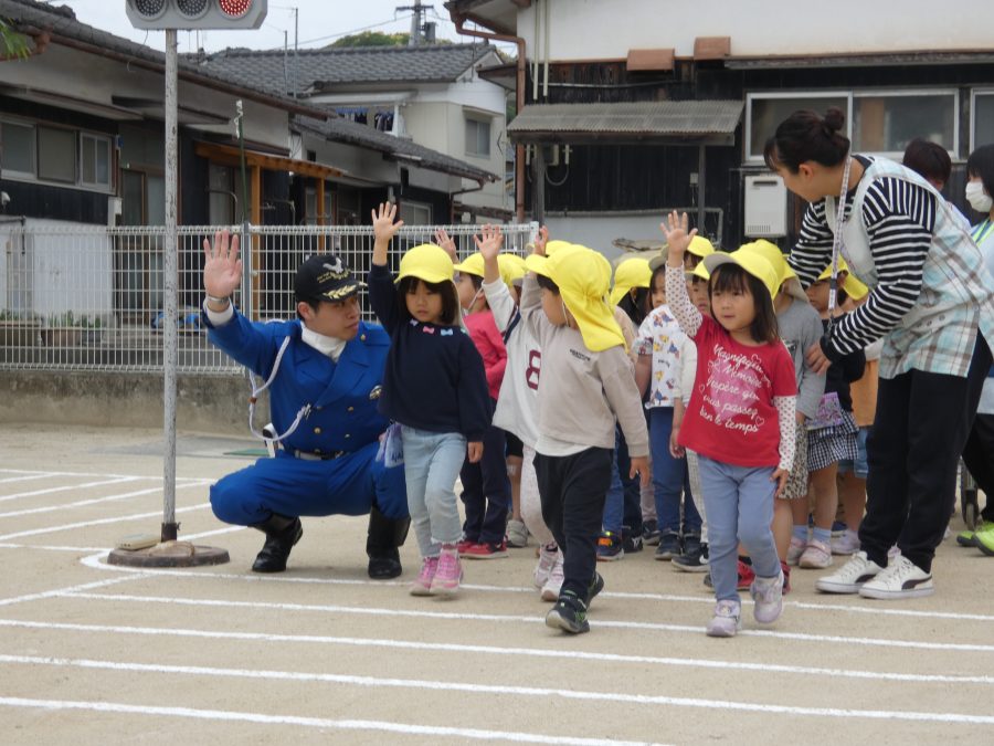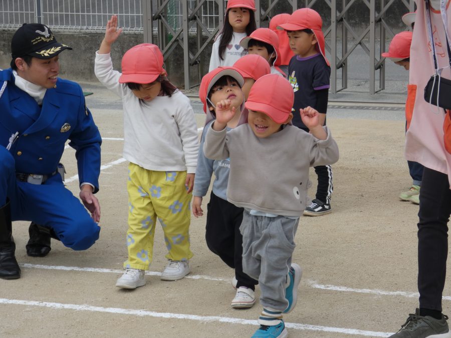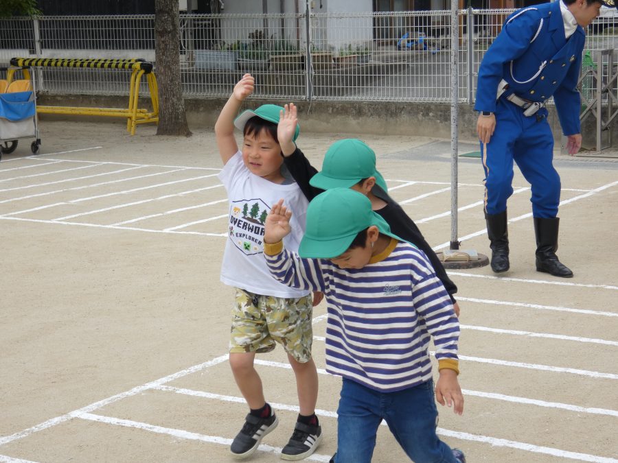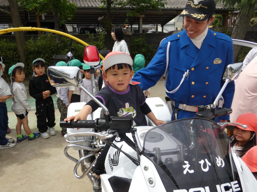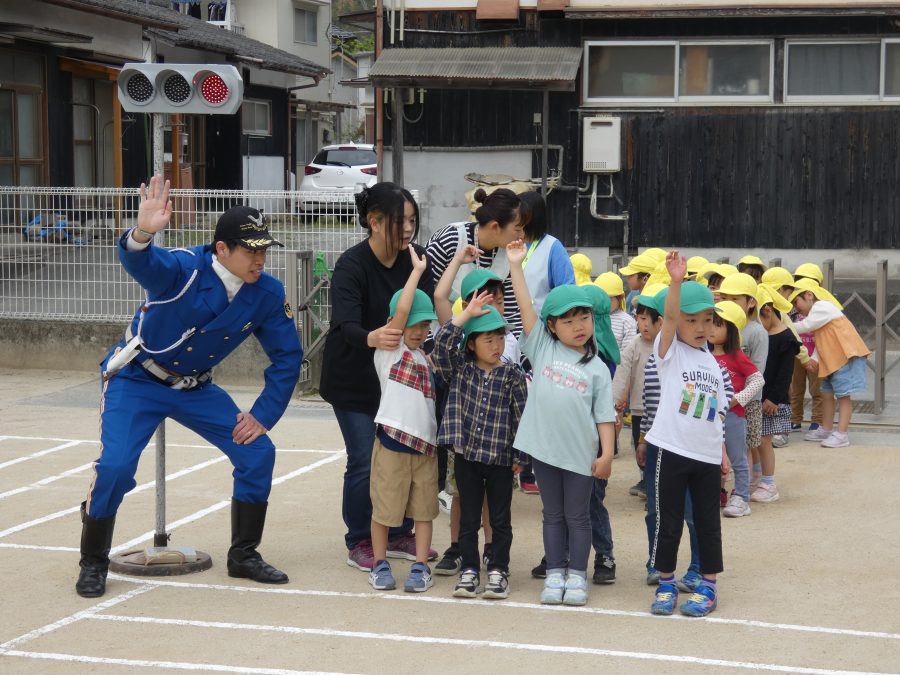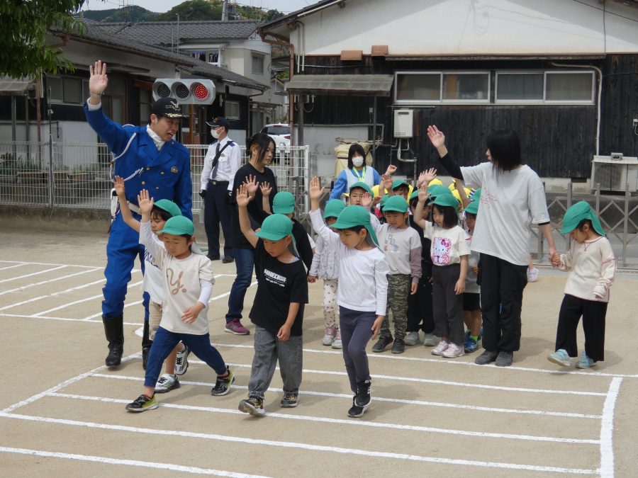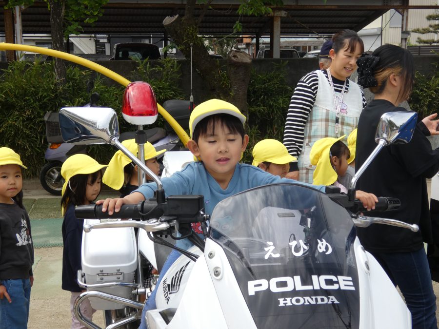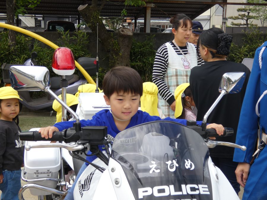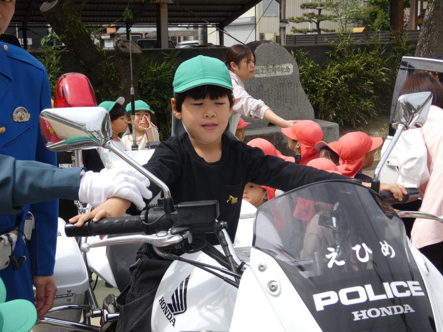 今年1回目の「交通安全教室」を実施しました。警察の方から信号のある横断歩道の渡り方を教えていただいた後、みんなで練習しました。何度も経験することで、交通安全への意識が高まるといいですね。後半では、白バイやパトカーに乗せてもらい、大喜びの子どもたちでした。