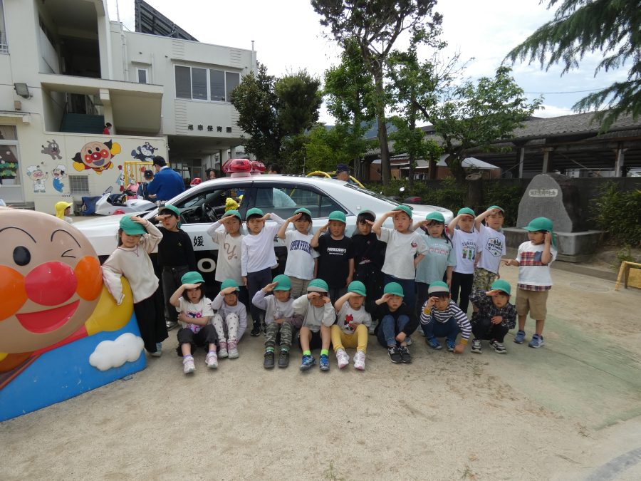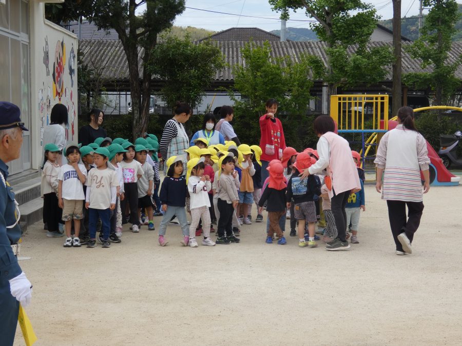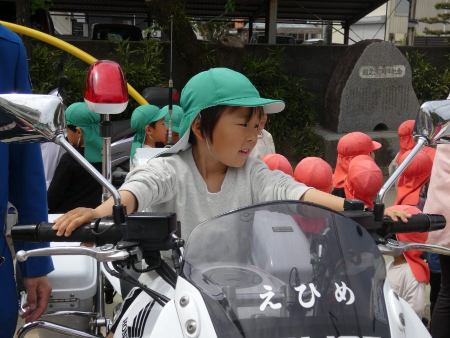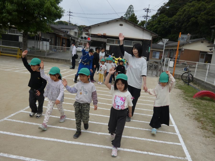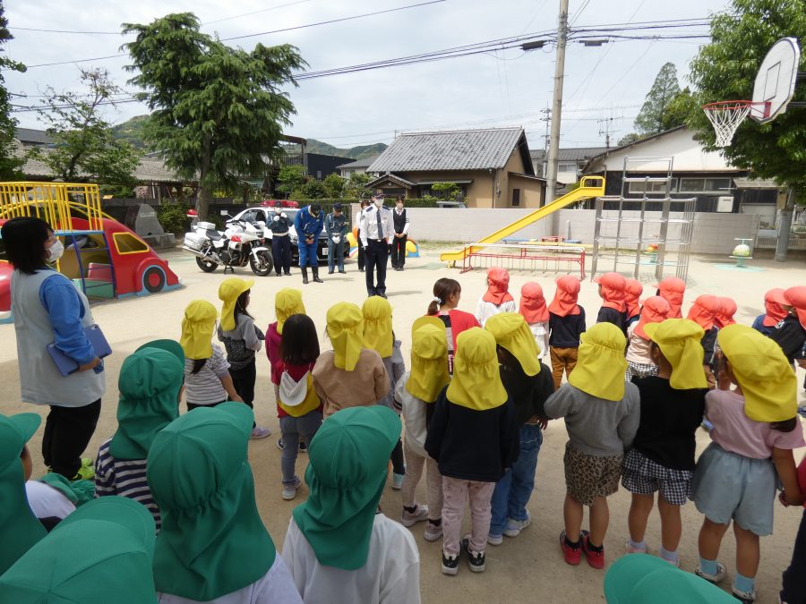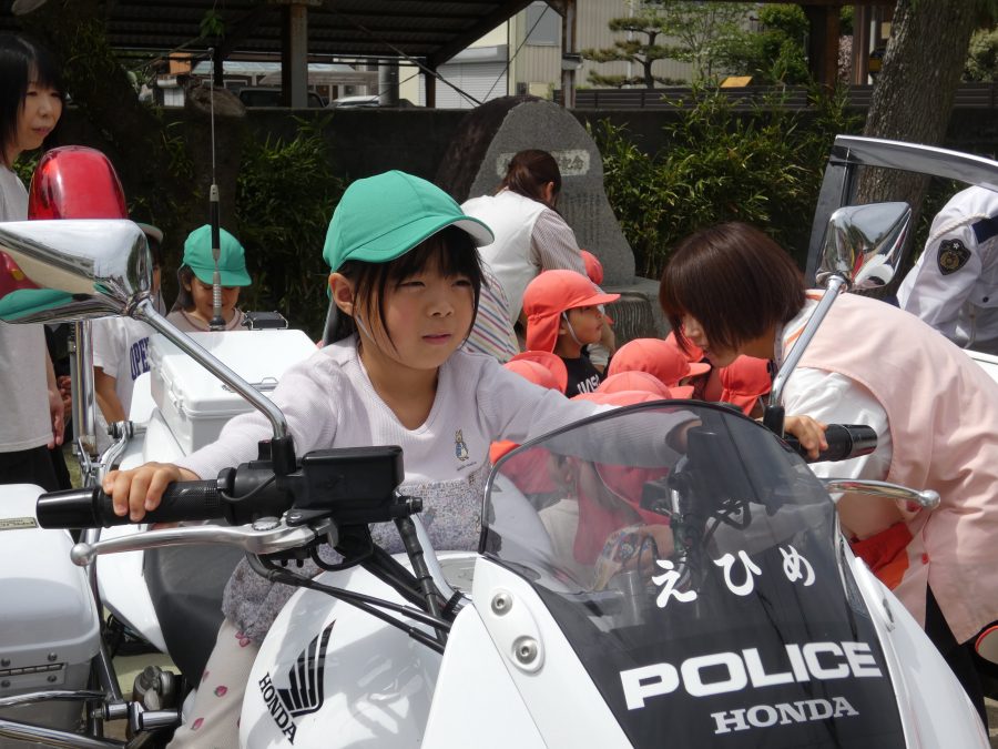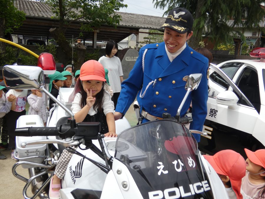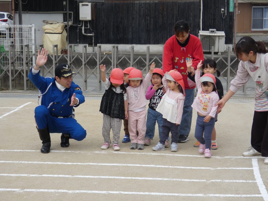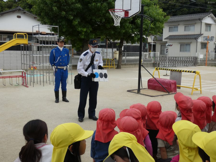 今年1回目の「交通安全教室」を実施しました。警察の方から信号のある横断歩道の渡り方を教えていただいた後、みんなで練習しました。何度も経験することで、交通安全への意識が高まるといいですね。後半では、白バイやパトカーに乗せてもらい、大喜びの子どもたちでした。