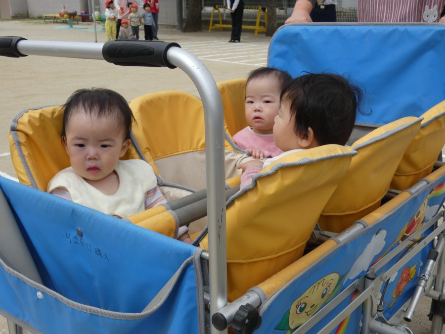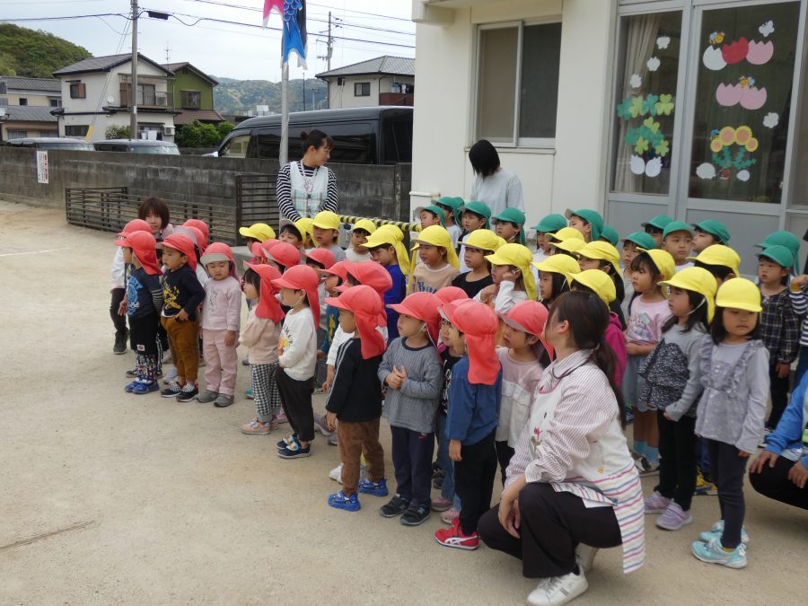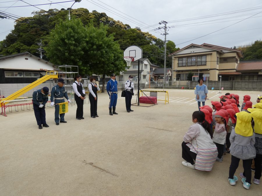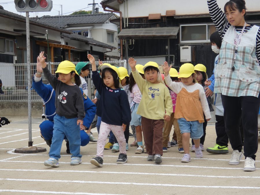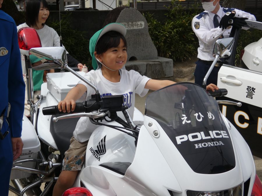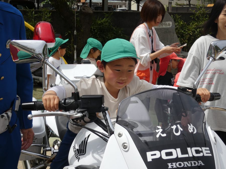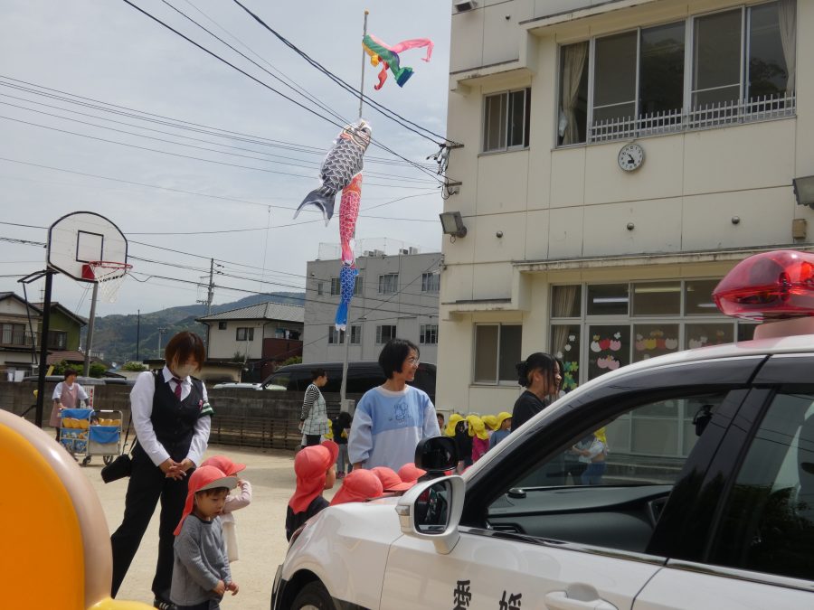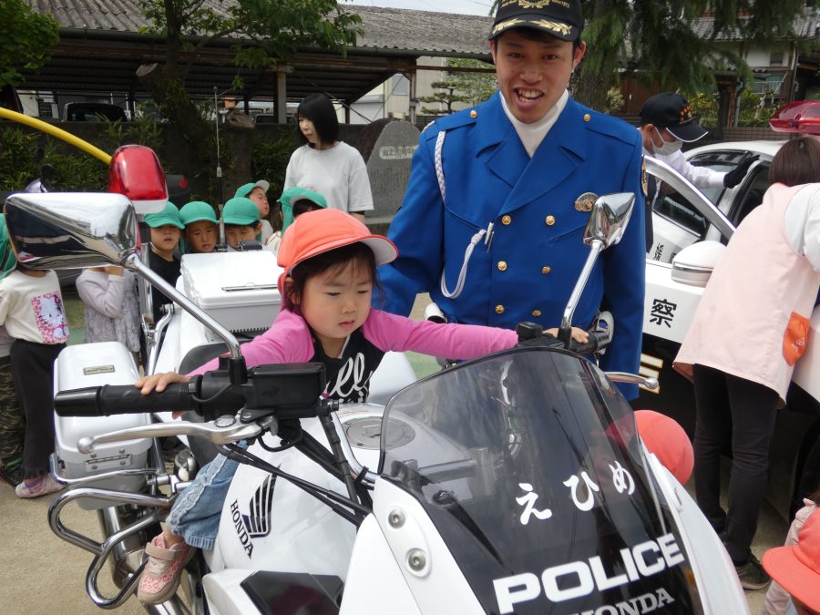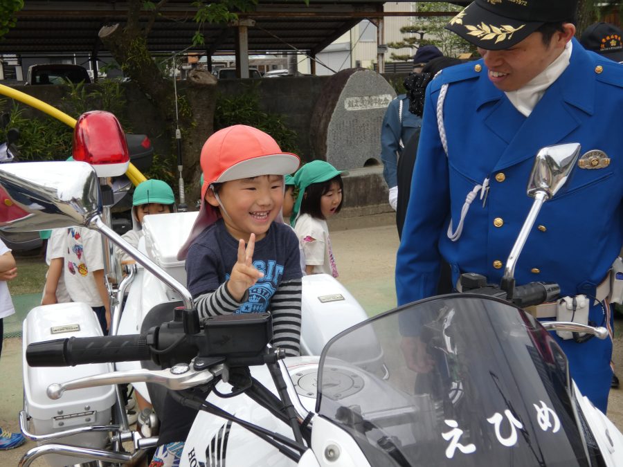 今年1回目の「交通安全教室」を実施しました。警察の方から信号のある横断歩道の渡り方を教えていただいた後、みんなで練習しました。何度も経験することで、交通安全への意識が高まるといいですね。後半では、白バイやパトカーに乗せてもらい、大喜びの子どもたちでした。