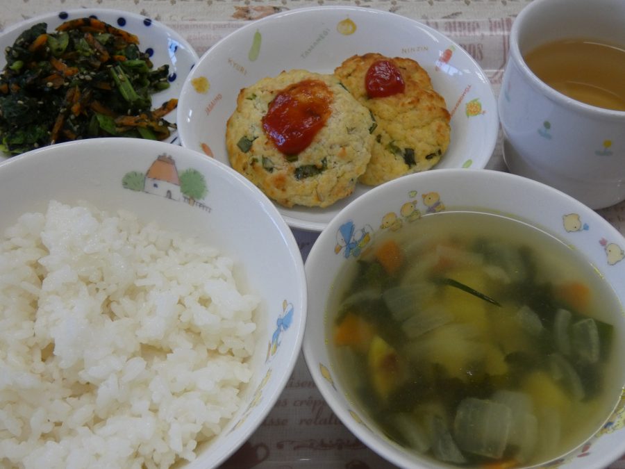 今日のメニューは「ご飯、豆腐ナゲット、青菜のナムル、さつもいもスープ」でした。