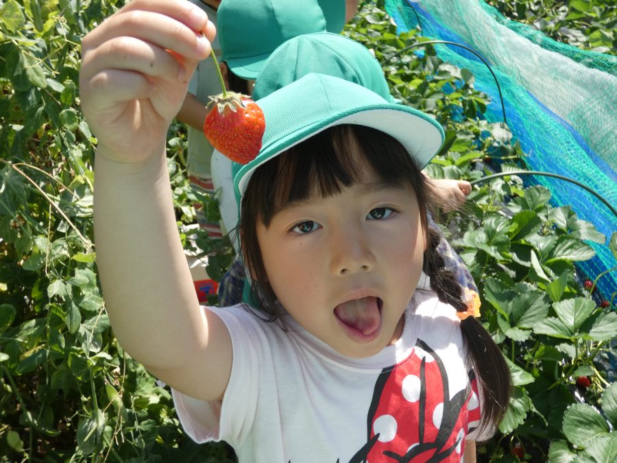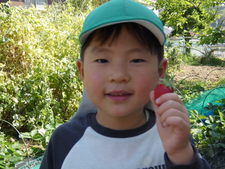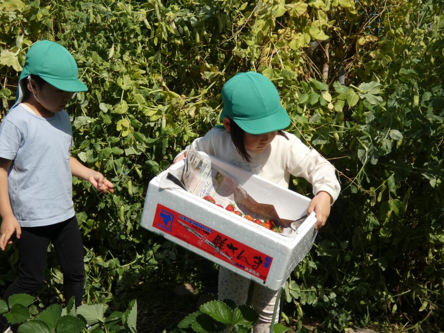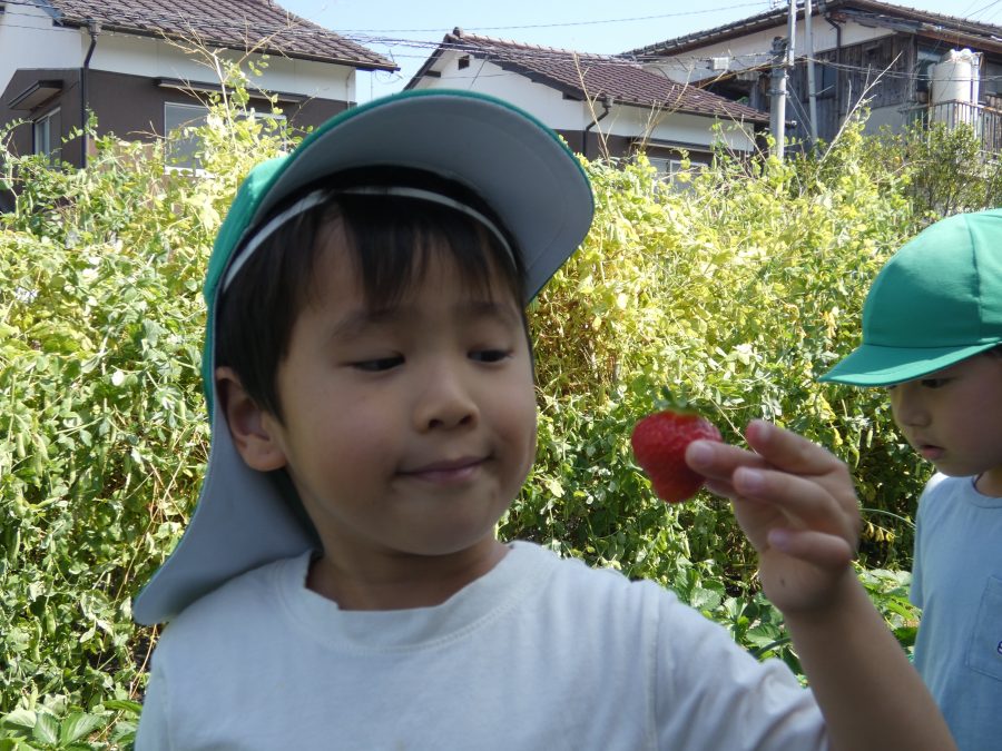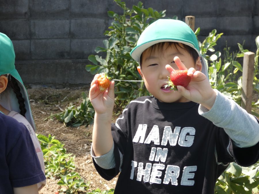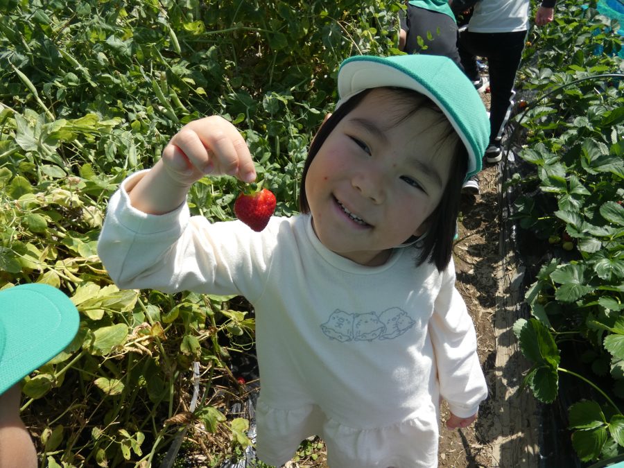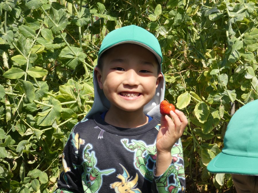 緑組さんが第2農園でイチゴの収穫をしました。農園では、「いいにお~い!」と赤く熟れた苺の甘いにおいに歓声をあげていました。