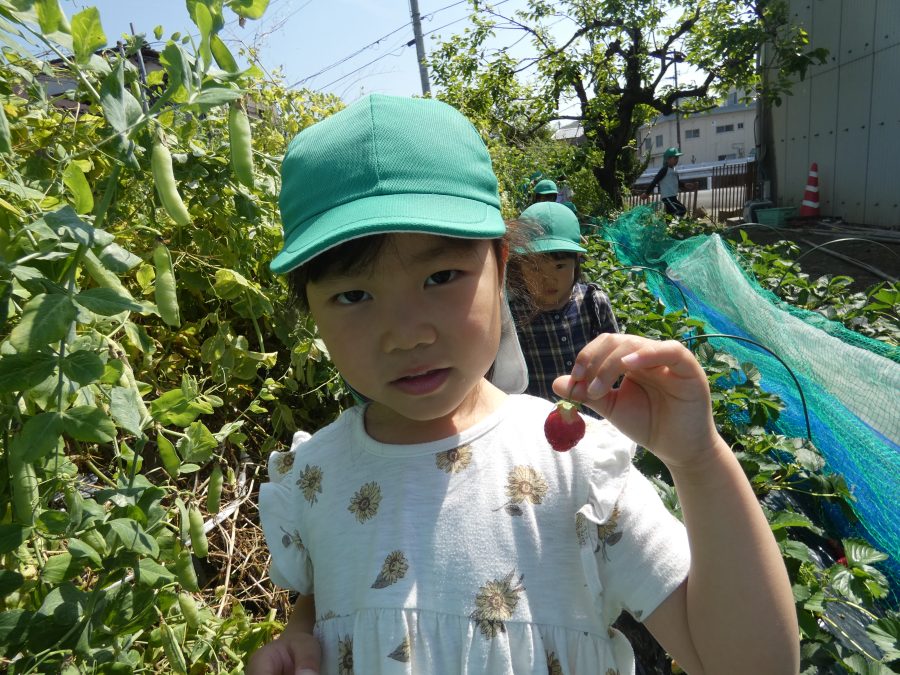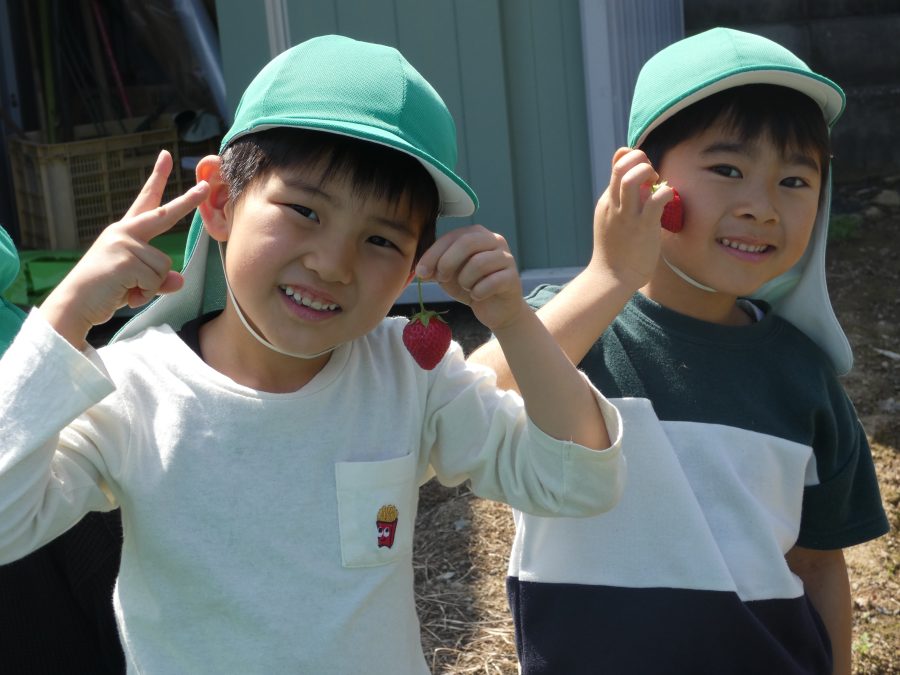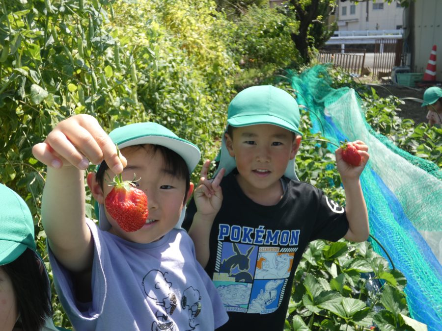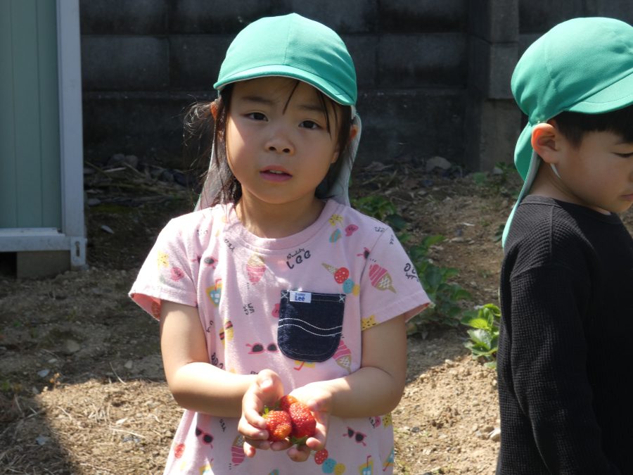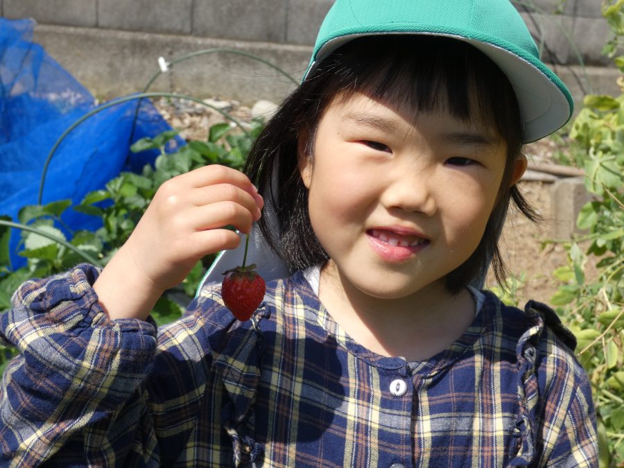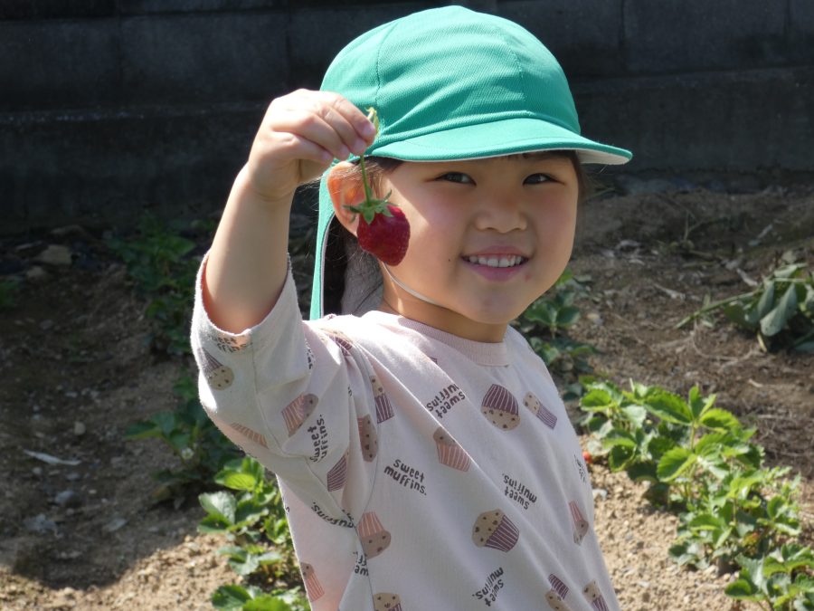 緑組さんが第2農園でイチゴの収穫をしました。農園では、「いいにお~い!」と赤く熟れた苺の甘いにおいに歓声をあげていました。