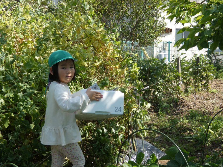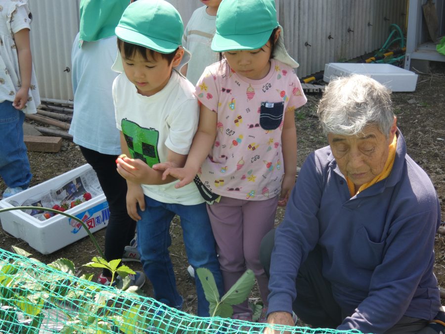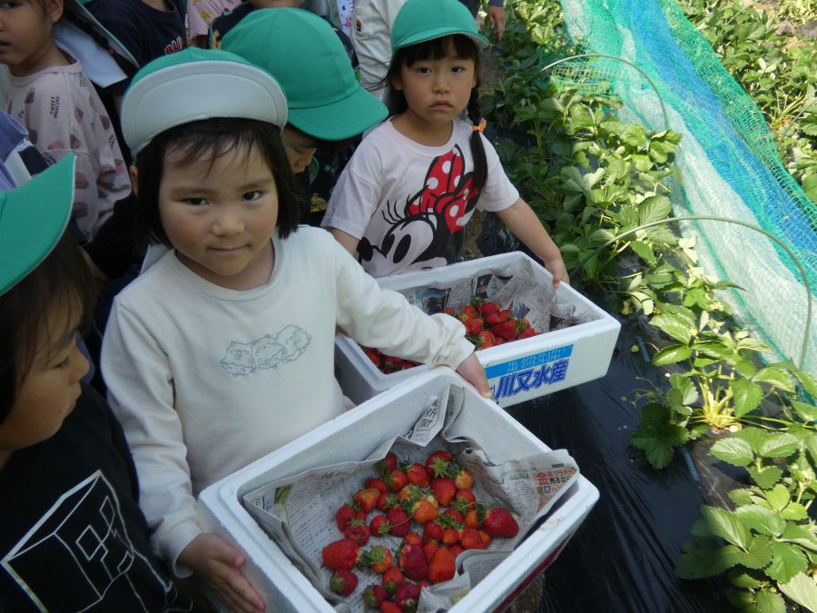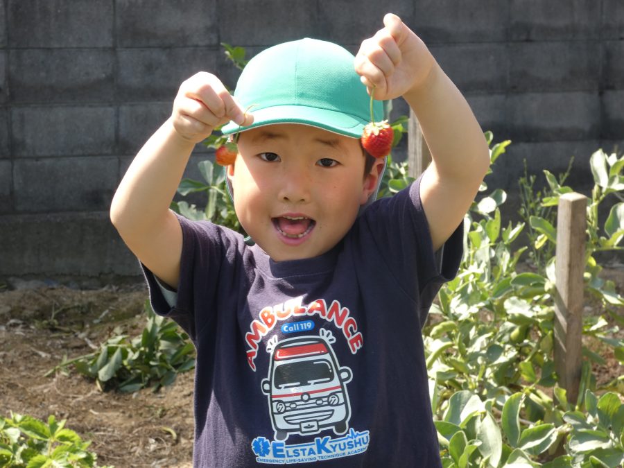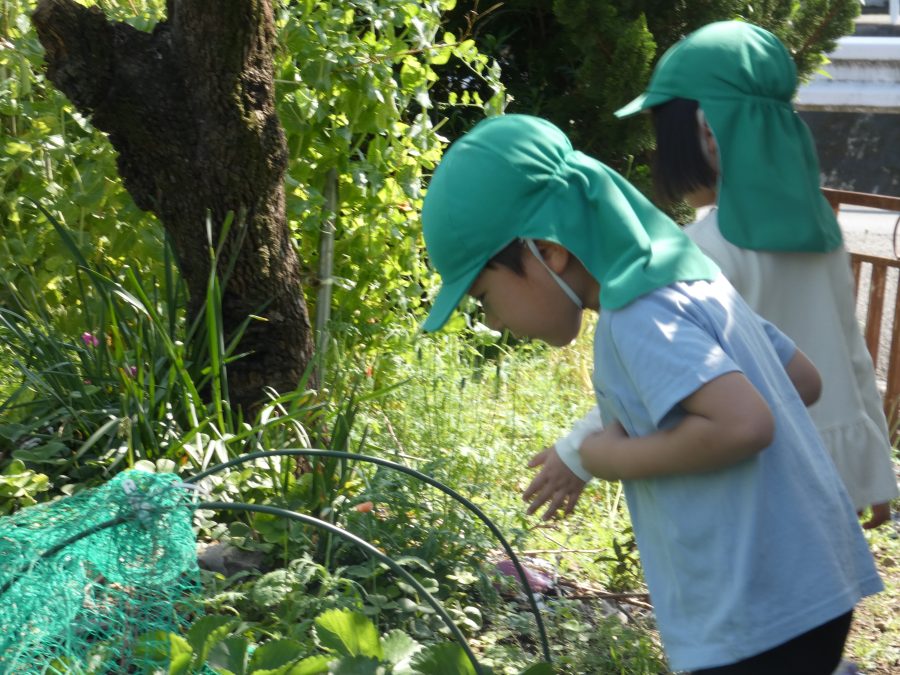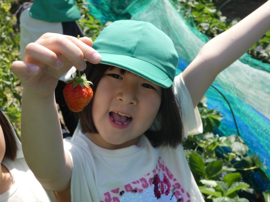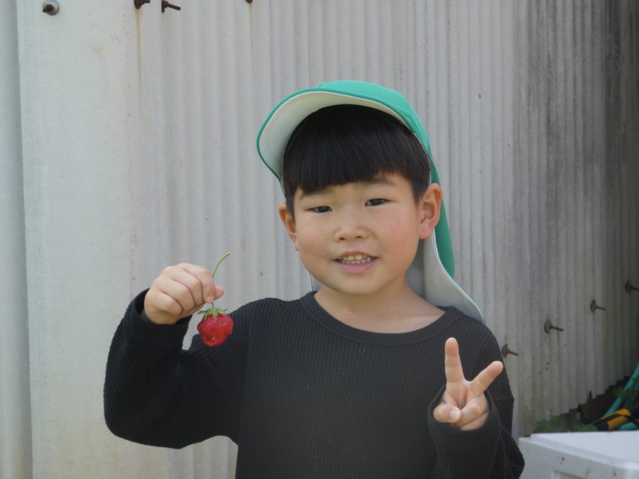 緑組さんが第2農園でイチゴの収穫をしました。農園では、「いいにお~い!」と赤く熟れた苺の甘いにおいに歓声をあげていました。