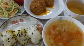今日のメニューは「ご飯、五目卵焼き、人参グラッセ30、豚汁」でした。