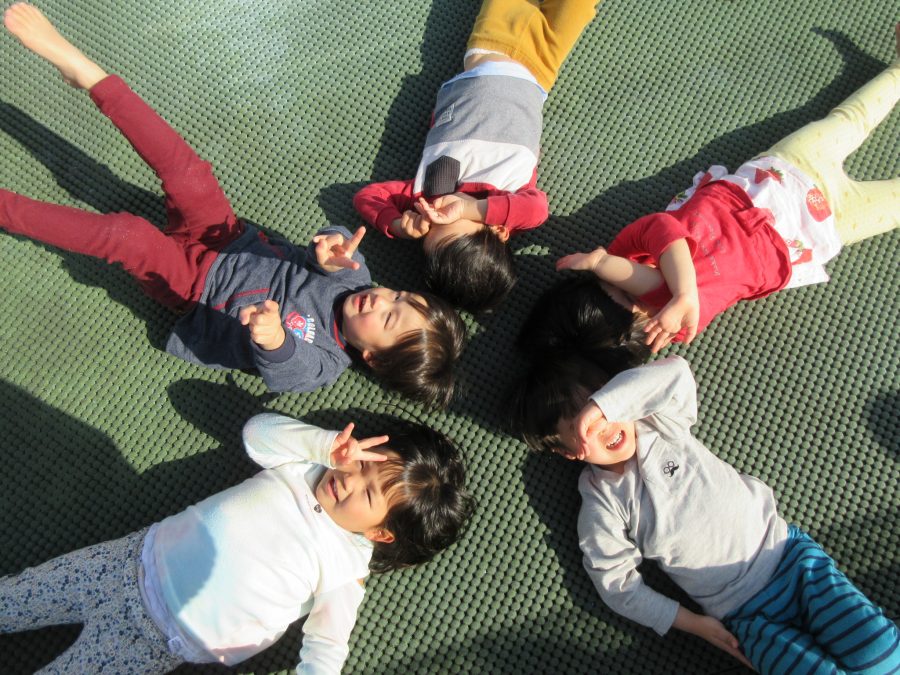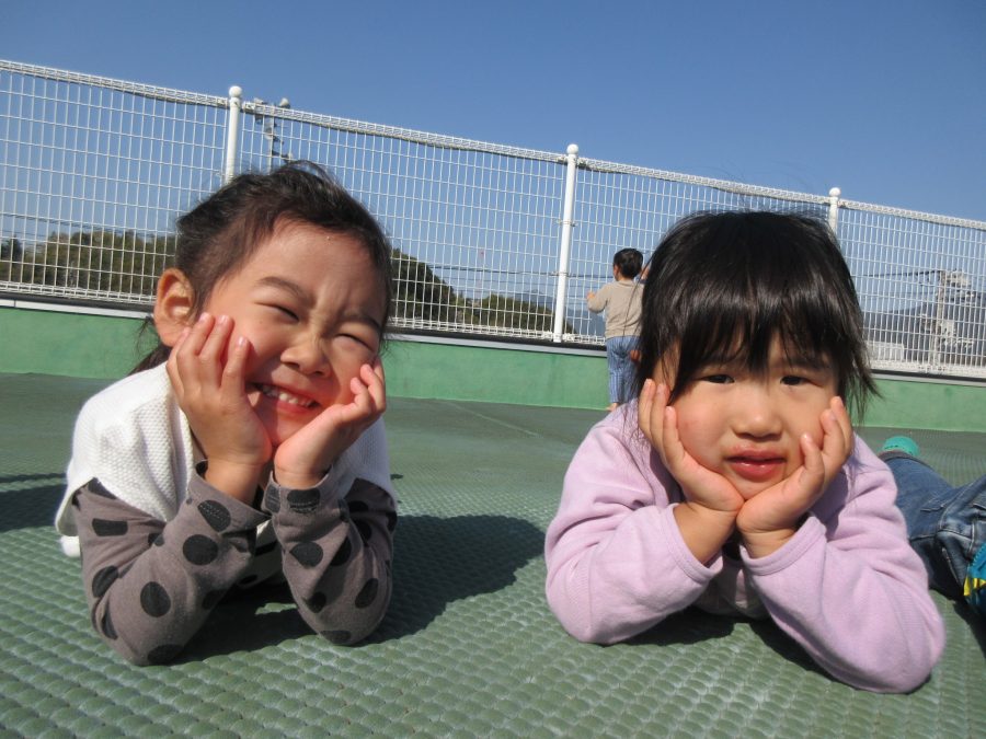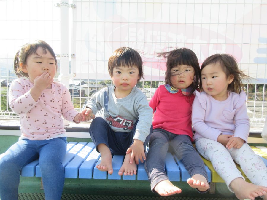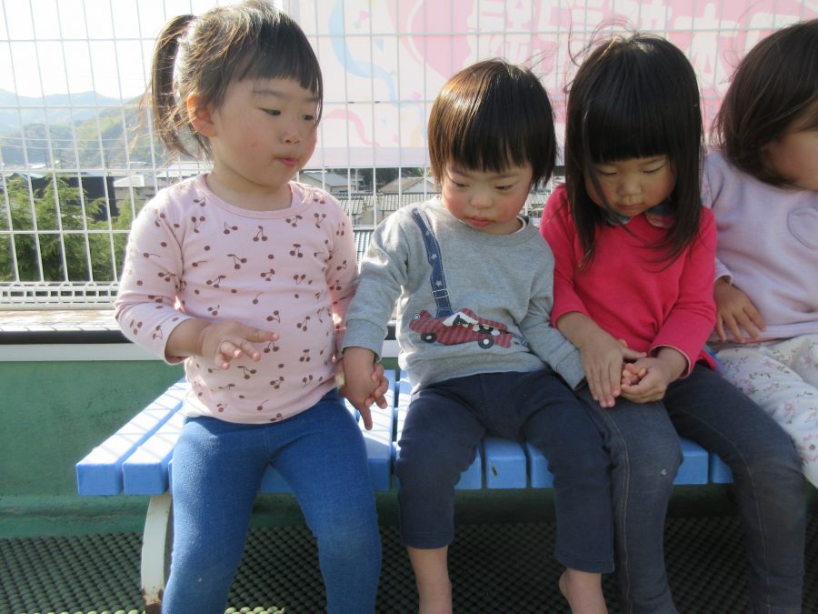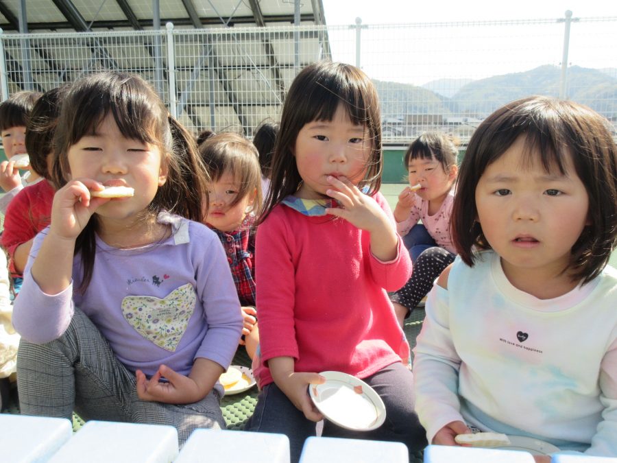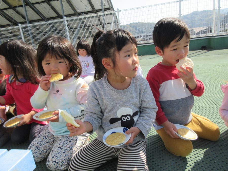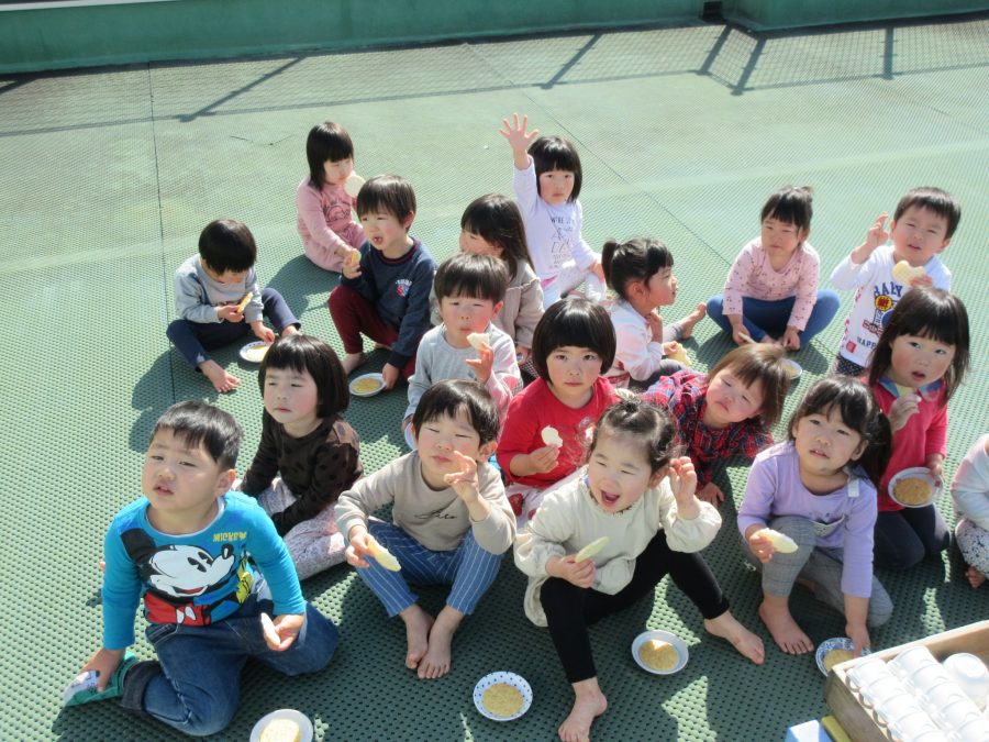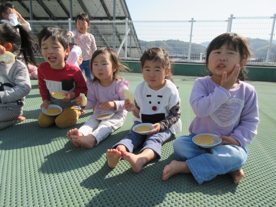今日も春らしい暖かな日でした。桃2組さんは、お花見がてら屋上に出て、おやつタイムを楽しみました。屋上から園庭の桜を見足り、寝転んだり、春の日差しをたっぷり浴びました。桃2組さんも、もうすぐ赤組さんですね。