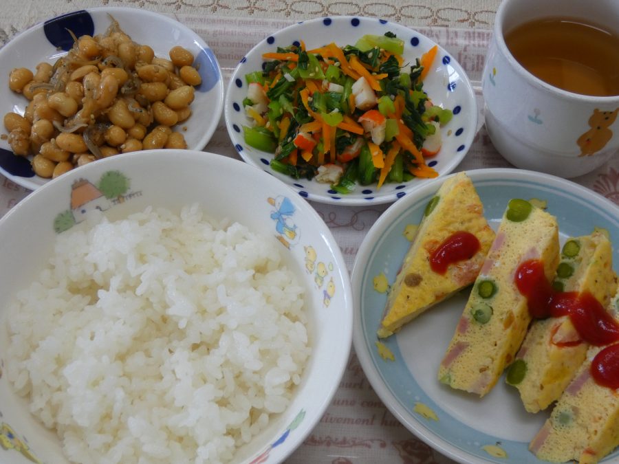 今日のメニューは「ご飯、スペイン風オムレツ、大豆とじゃこの照り煮、小松菜のおかか和え(かにかま)」でした。
