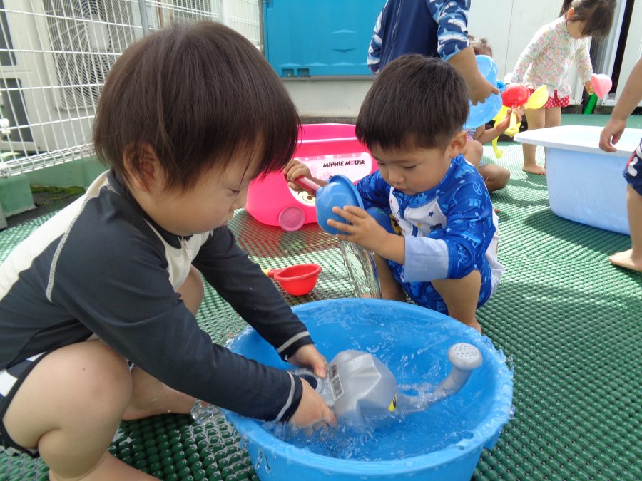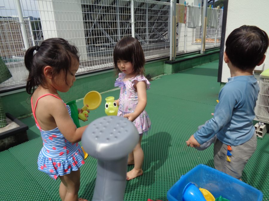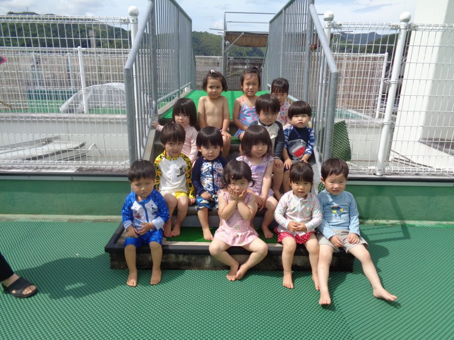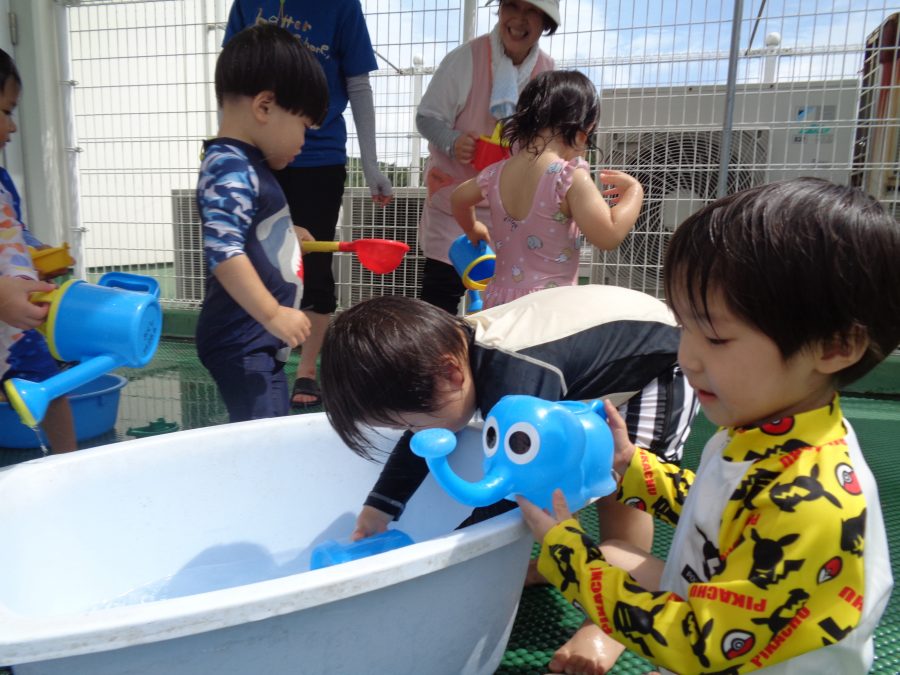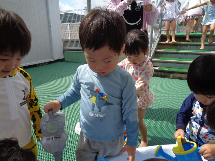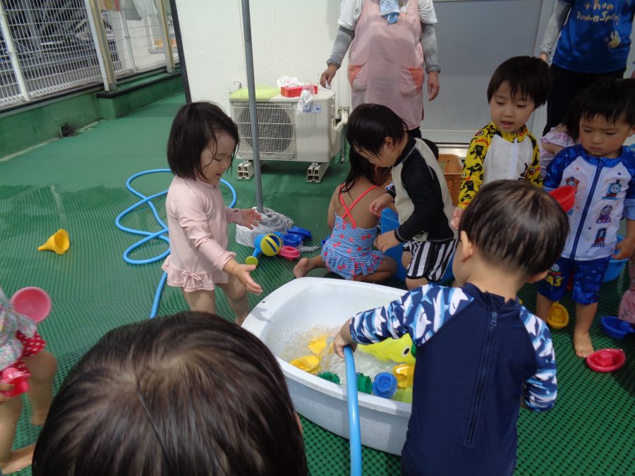 桃2組さんが水遊びをしました。まずは、水着に着替えて水遊びをしました。少しずつ水に慣れたら、小さなプールに入ります。顔や頭に水がかかっても泣かないように慣れるといいですね。ご家庭でも、お風呂は水に慣れさせる絶好のチャンスです。