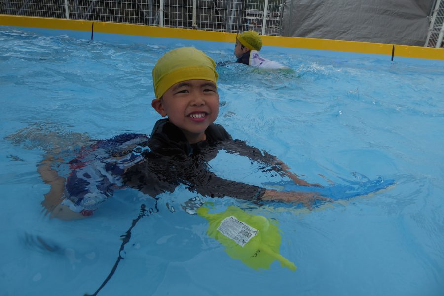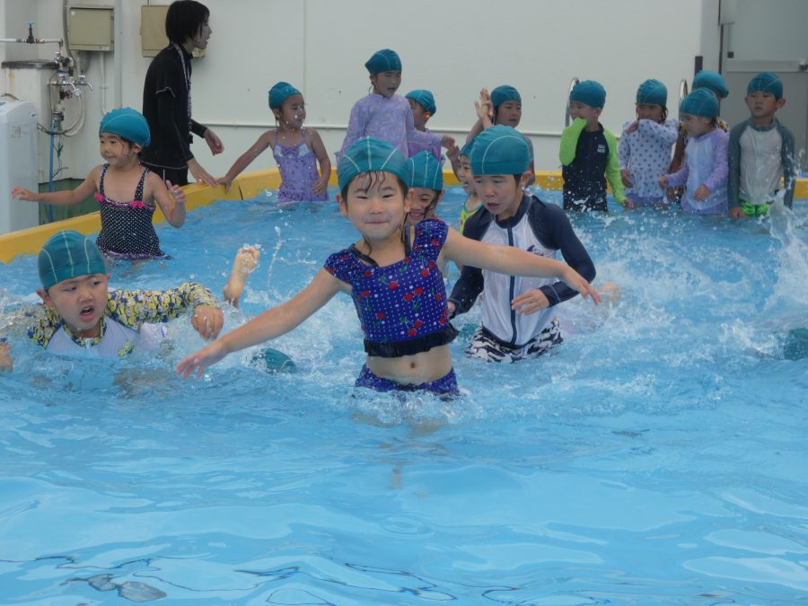 蒸し暑い日が続いています。皆さん、熱中症にもお気をつけください。さて、こんな日はプール遊びが一番ですね。緑組さんや黄組さんは、顔つけ、バタ足なども頑張っています。