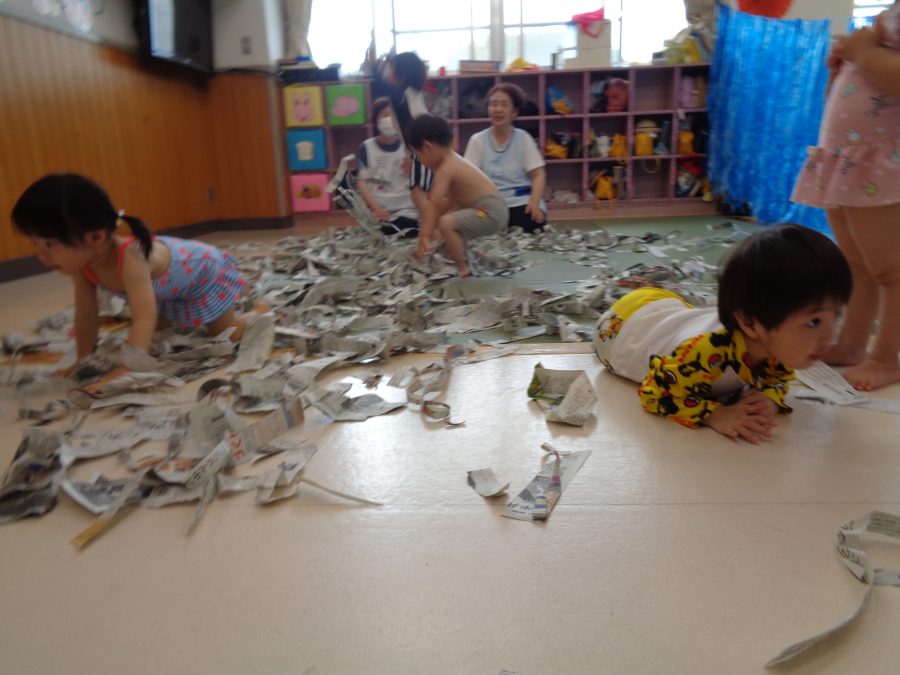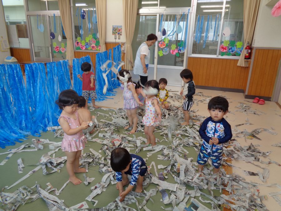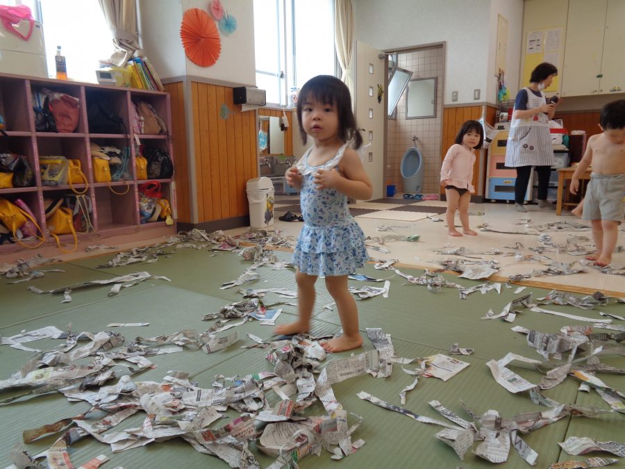 桃2組さんは、保育室で水着に着替えてプール遊びごっこを楽しみました。新聞紙の海で泳いだり、スズランテープの波をかき分けたり・・・。本物のプール遊びもお楽しみにね。