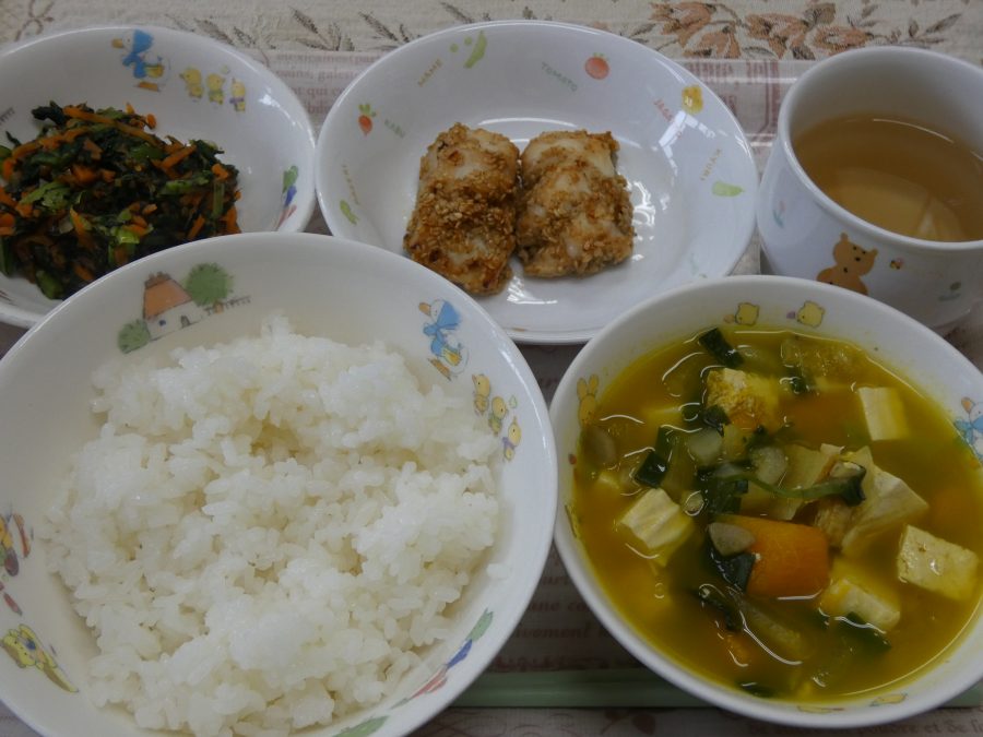 今日のメニューは「ご飯、真鯛のごま焼き、小松菜海苔和え、五目汁(かほちゃ、だいこん)」でした。