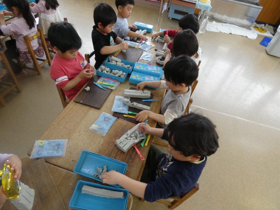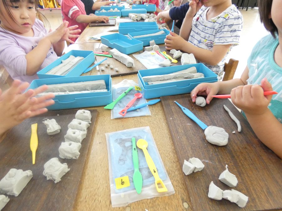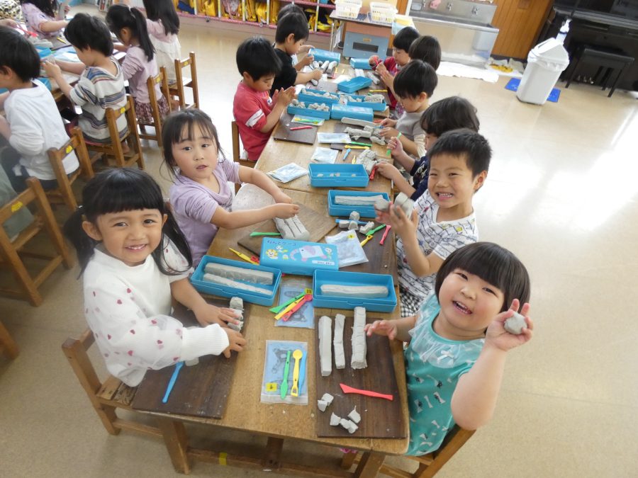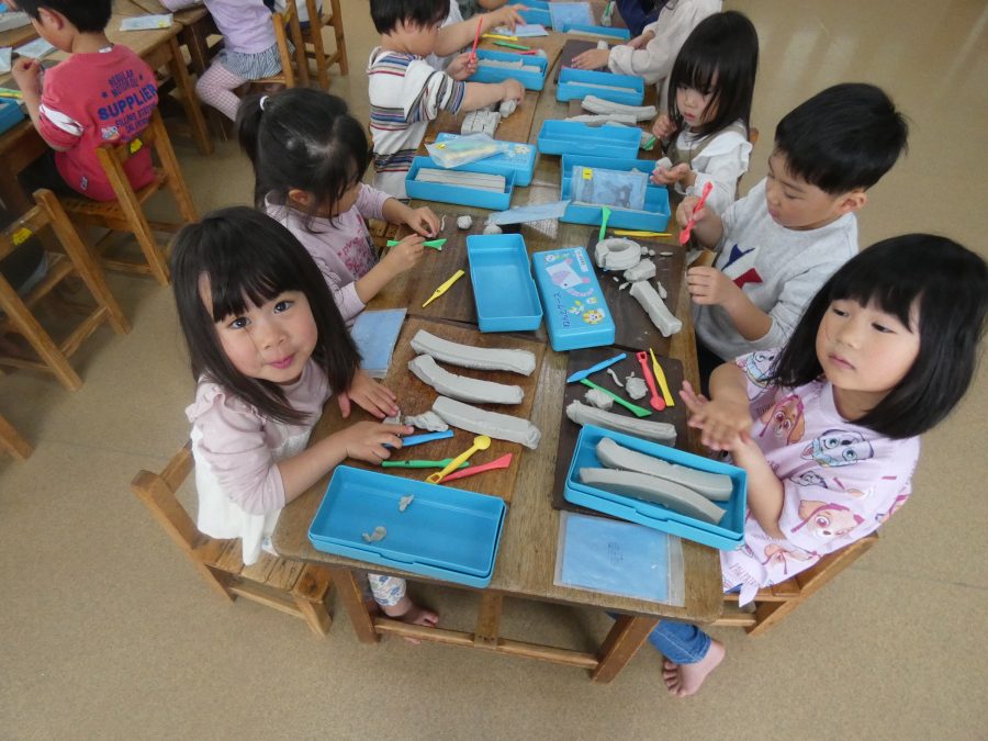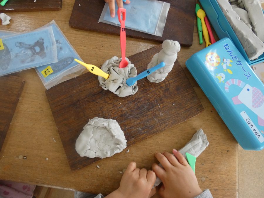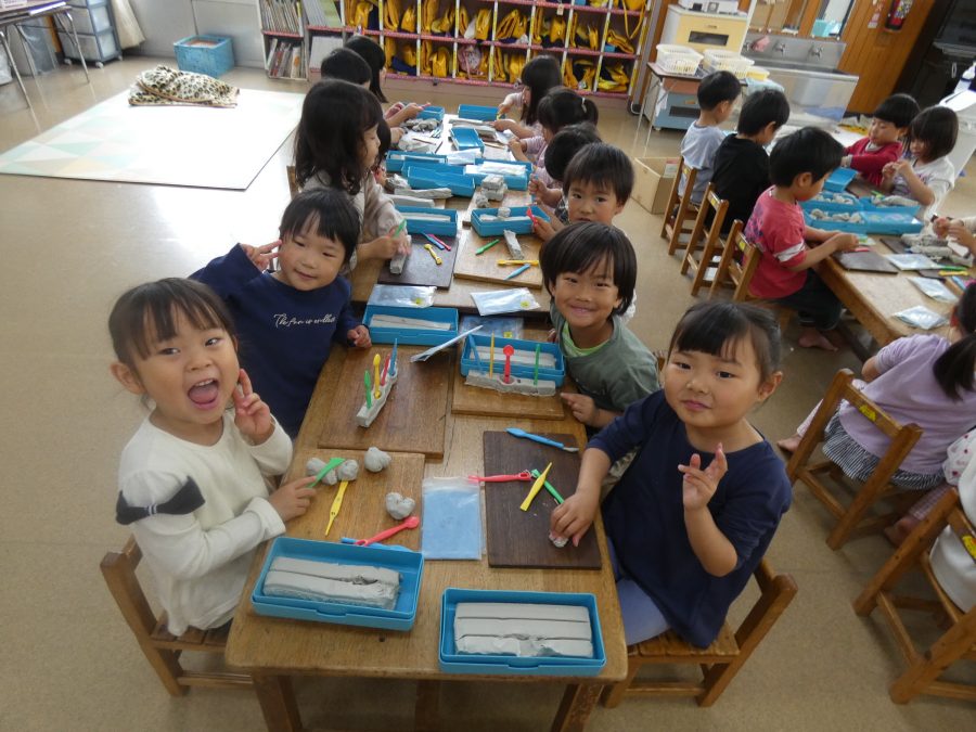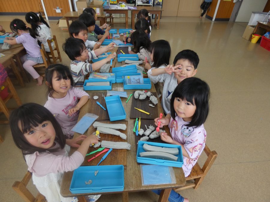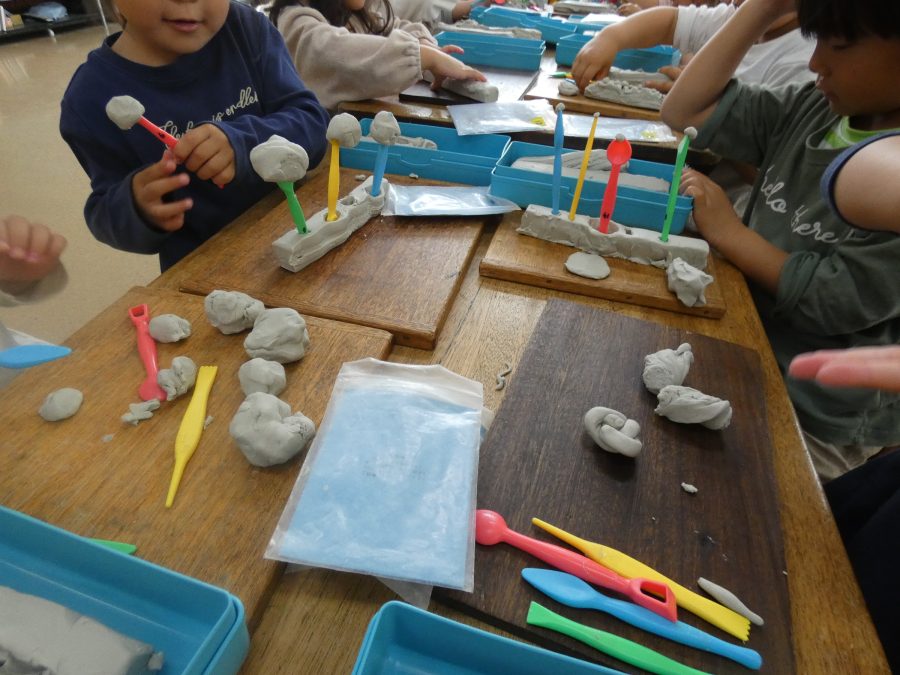 黄組さんの粘土遊びの様子です。粘土をこねたり、ちぎったり、丸めたりして、いろいろな作品を作りました。子どもは、みんな芸術の天才です!