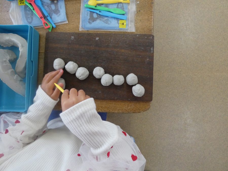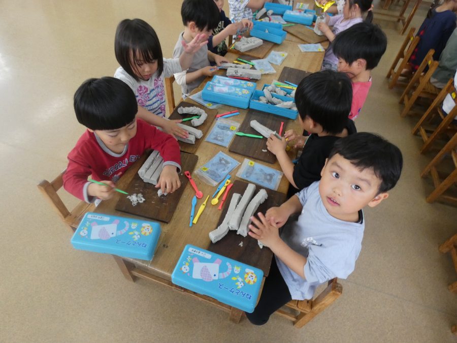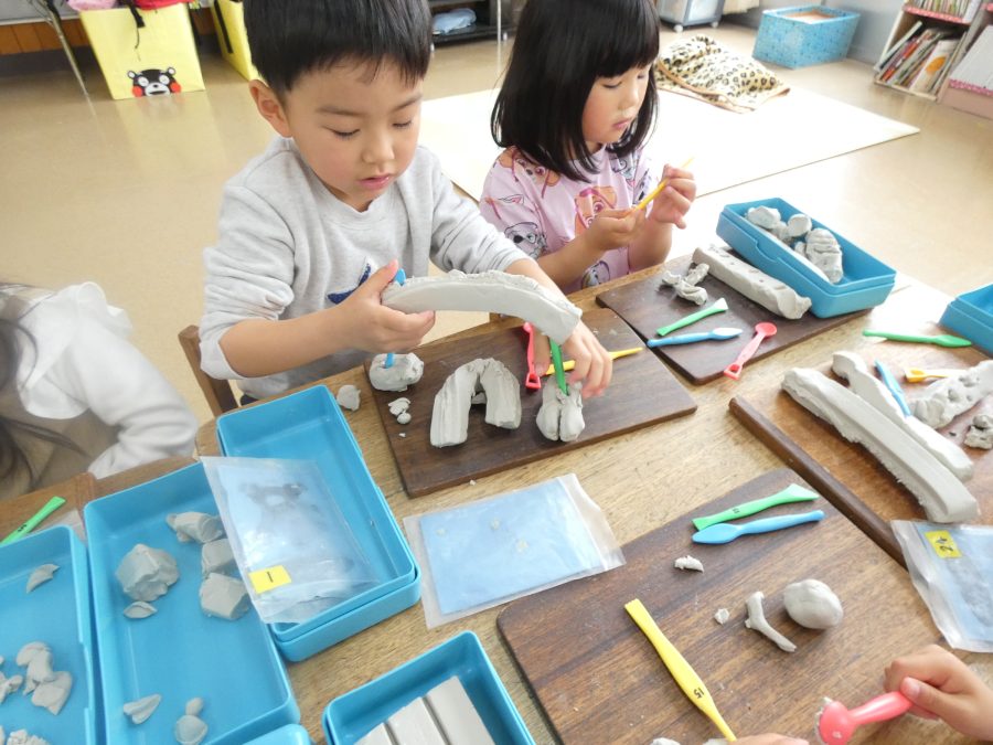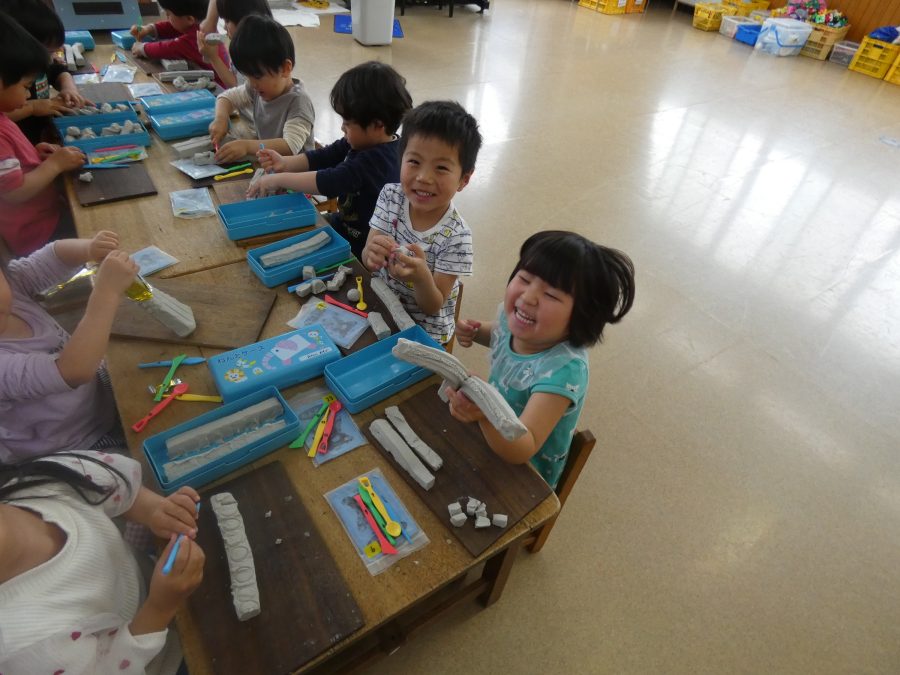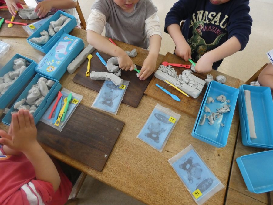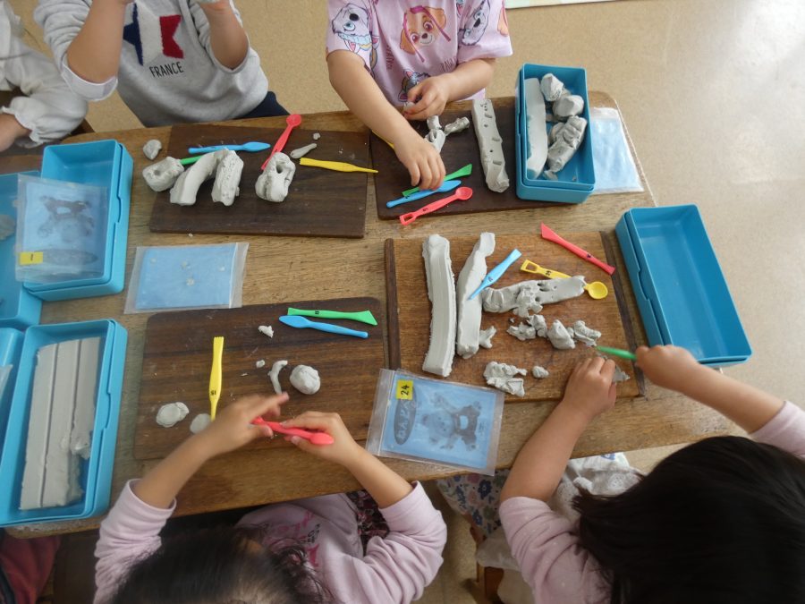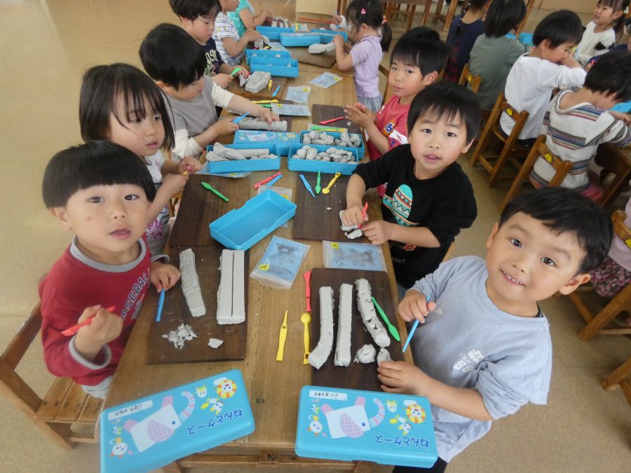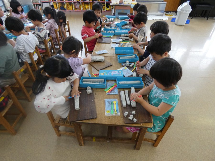 黄組さんの粘土遊びの様子です。粘土をこねたり、ちぎったり、丸めたりして、いろいろな作品を作りました。子どもは、みんな芸術の天才です!