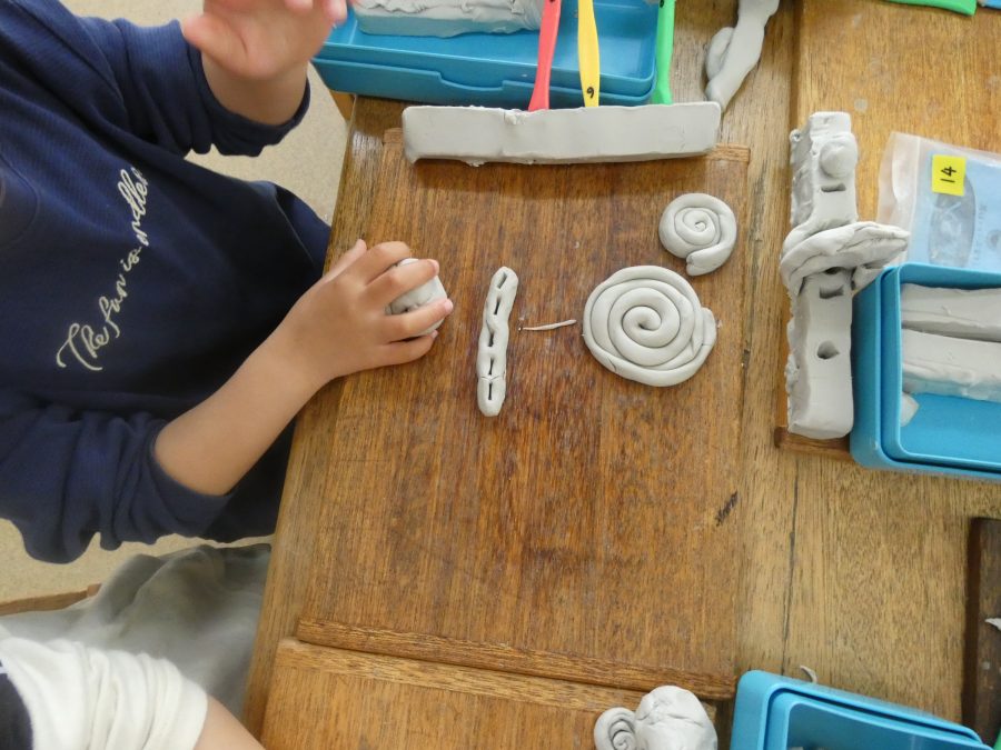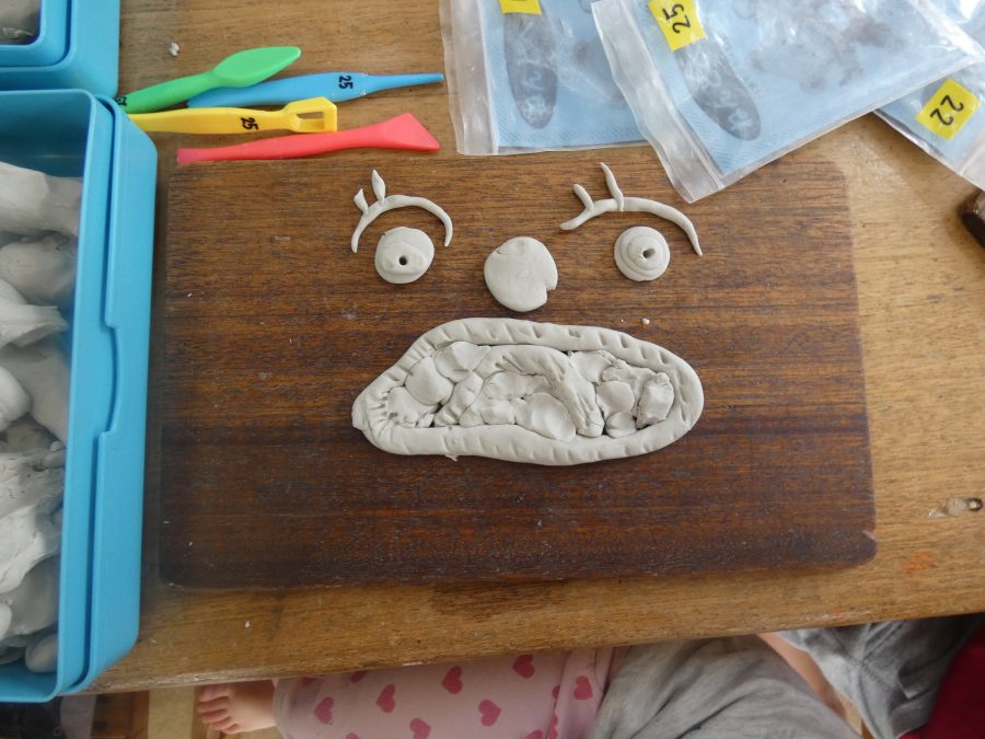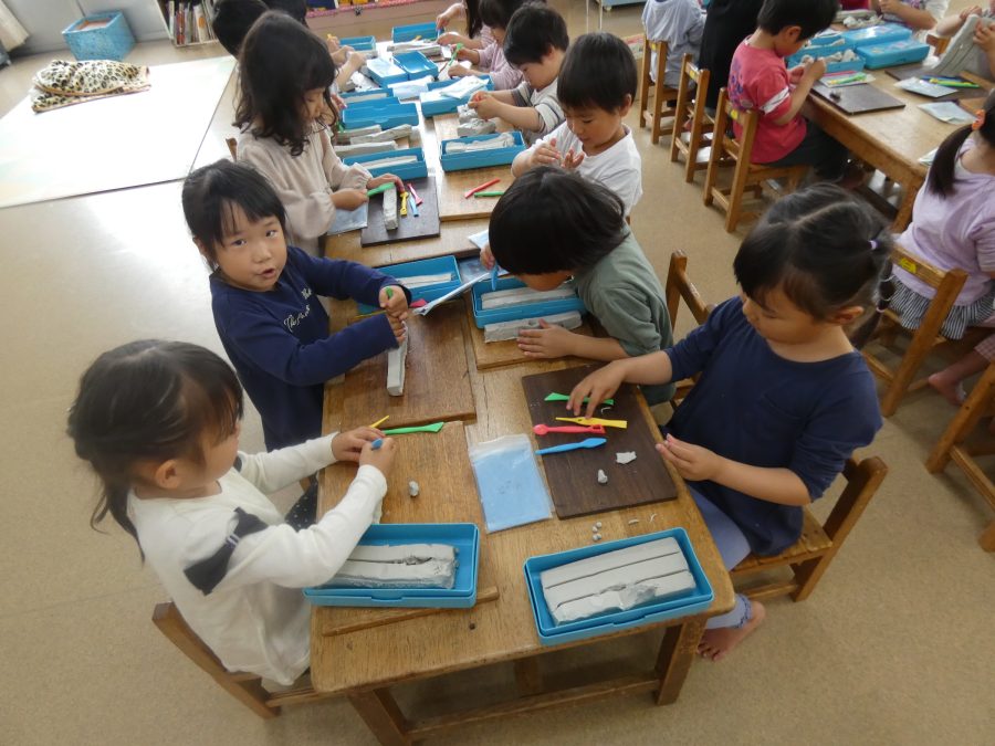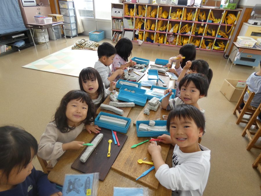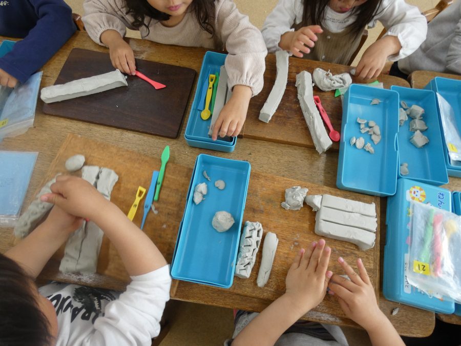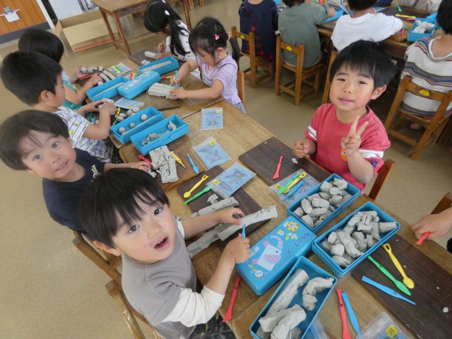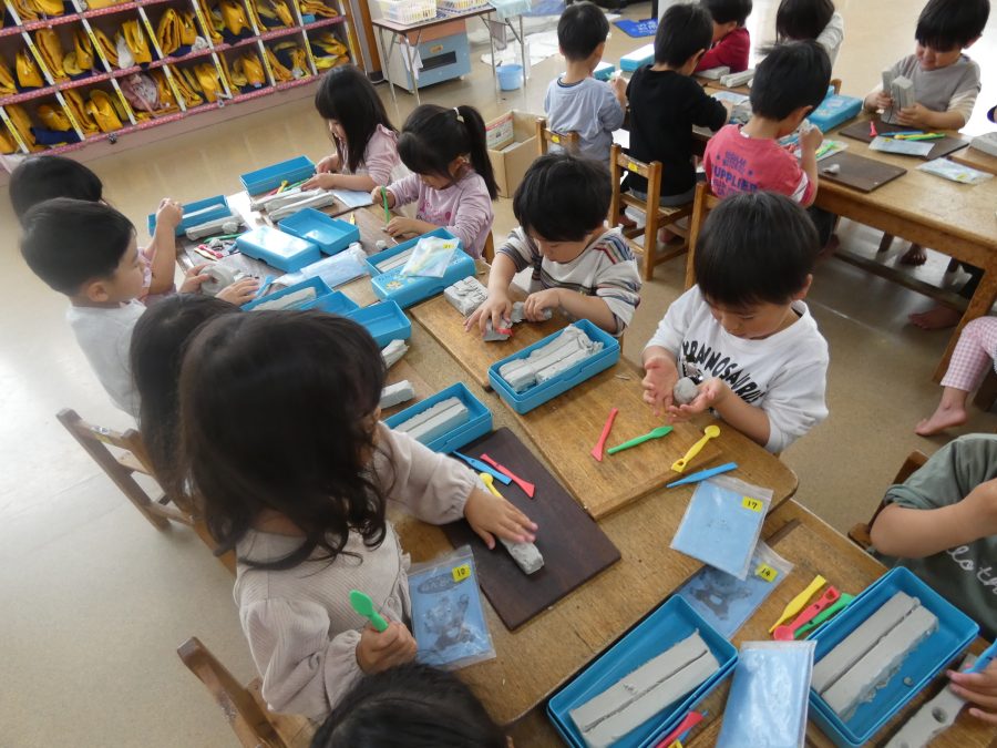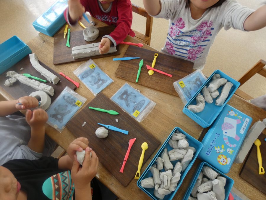 黄組さんの粘土遊びの様子です。粘土をこねたり、ちぎったり、丸めたりして、いろいろな作品を作りました。子どもは、みんな芸術の天才です!